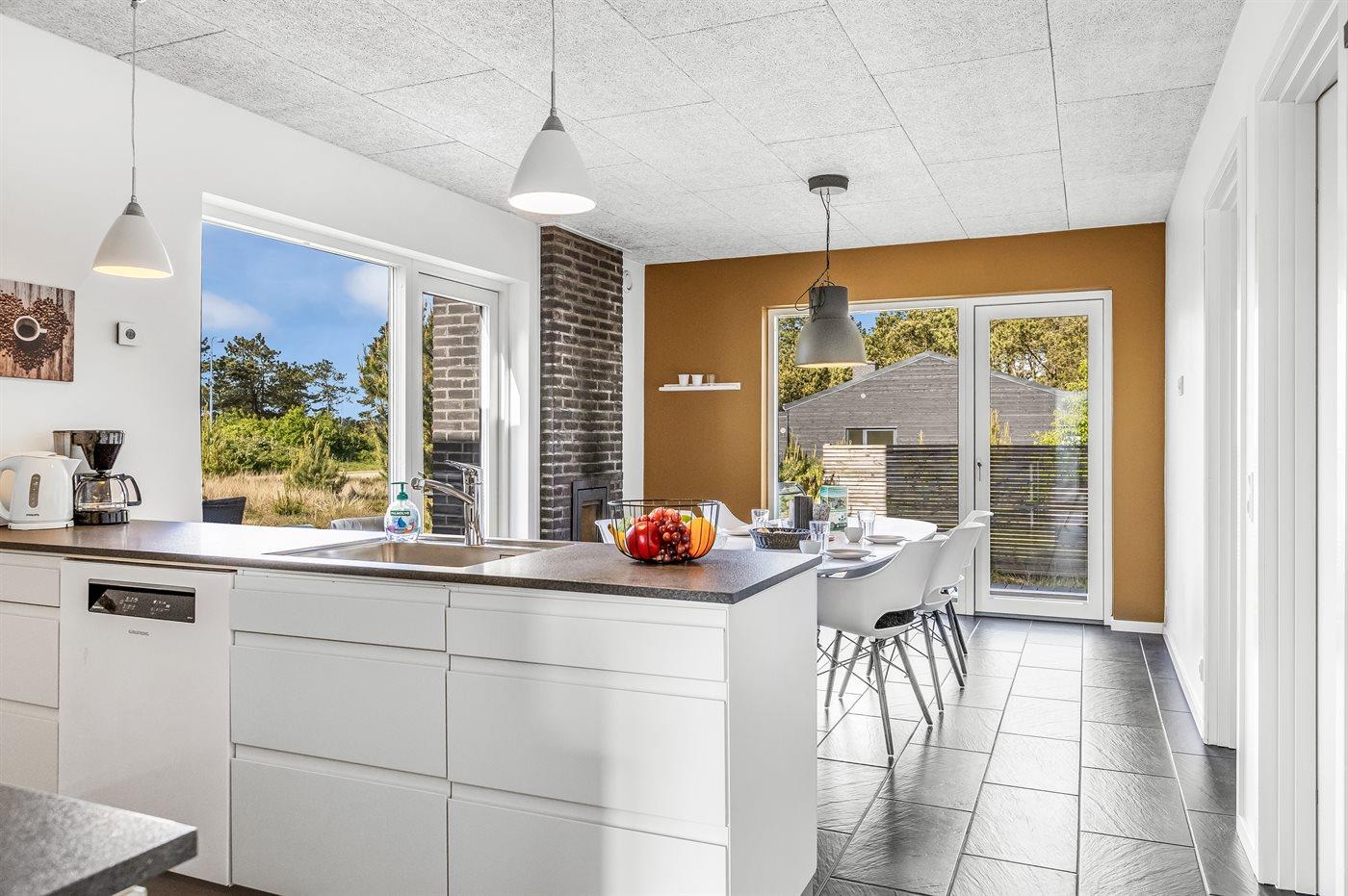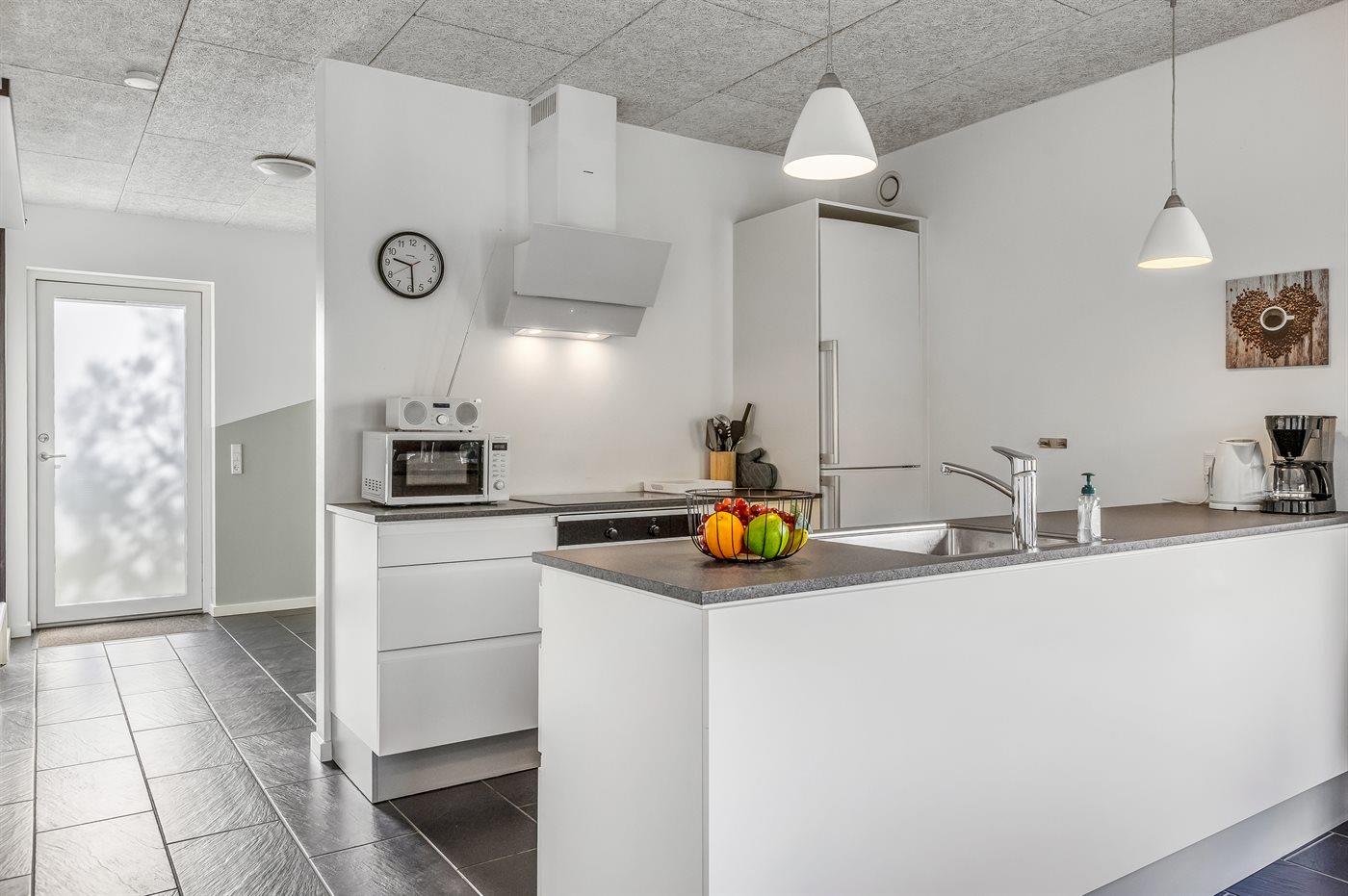 Køkkenet er udstyret med 1 køleskab. Der er 4 induktionskogeplader, varmluftovn, mikrobølgeovn samt opvaskemaskine.
