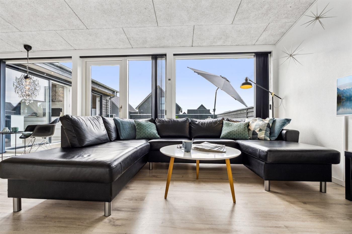 Spændende, flot arkitekttegnet sommerhus beliggende tæt på golfbanen og havnen. Her kan du nyde din ferie i flotte omgivelser. Huset har brede døre (0,80m) uden dørtrin, så det kan benyttes af kørestolsbrugere.