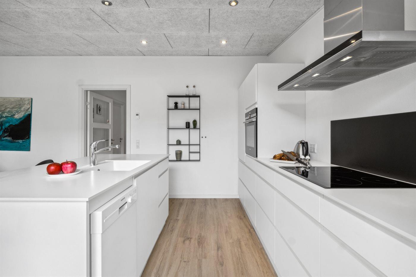 Køkkenet er udstyret med 1 køleskab. Der er 4 keramiske kogeplader, varmluftovn, mikrobølgeovn samt opvaskemaskine.