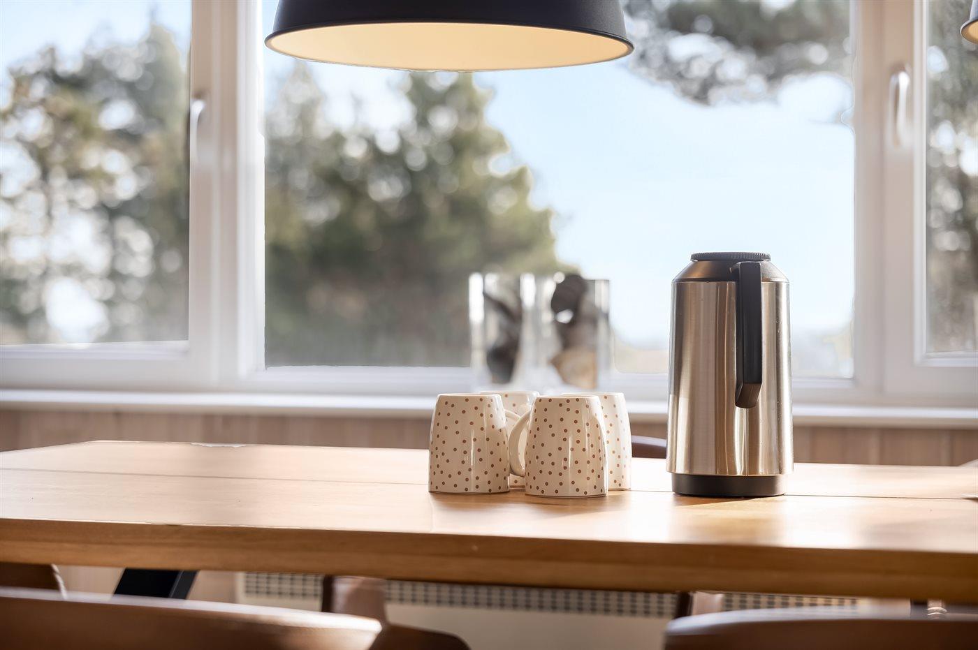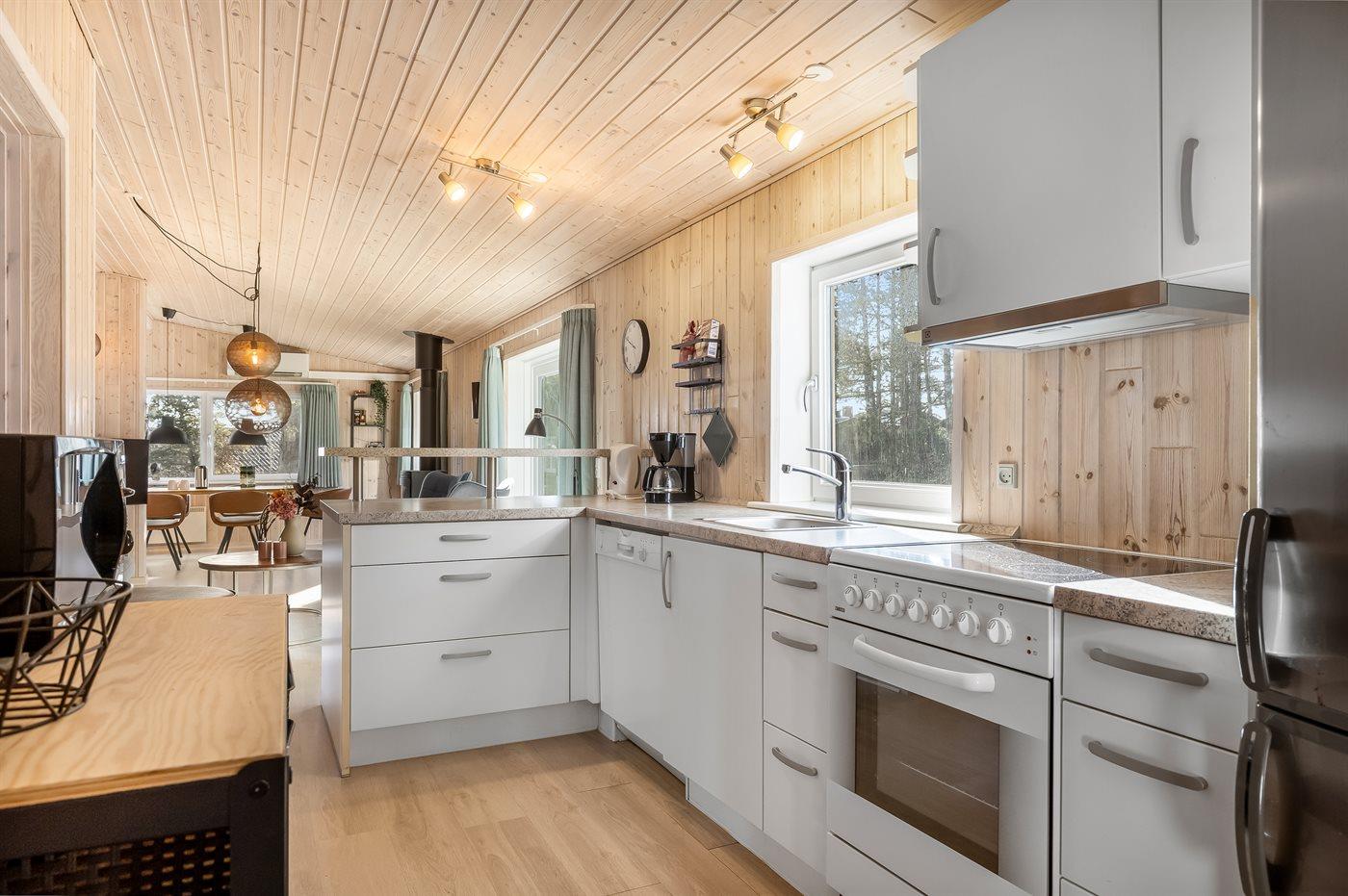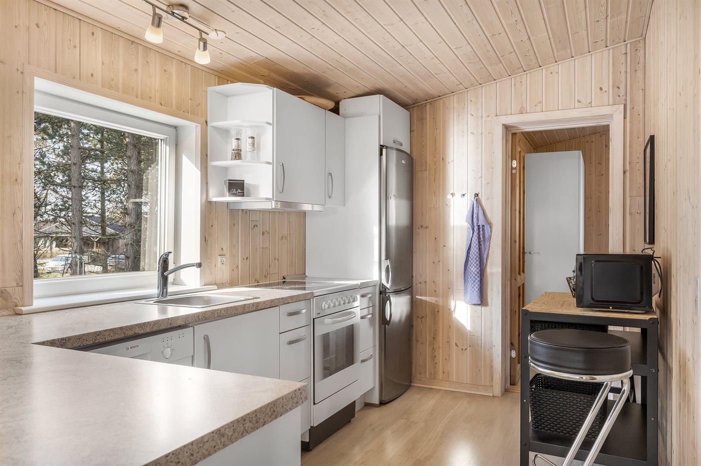 Køkkenet er udstyret med 1 køleskab. Der er 4 keramiske kogeplader, varmluftovn, mikrobølgeovn samt opvaskemaskine.