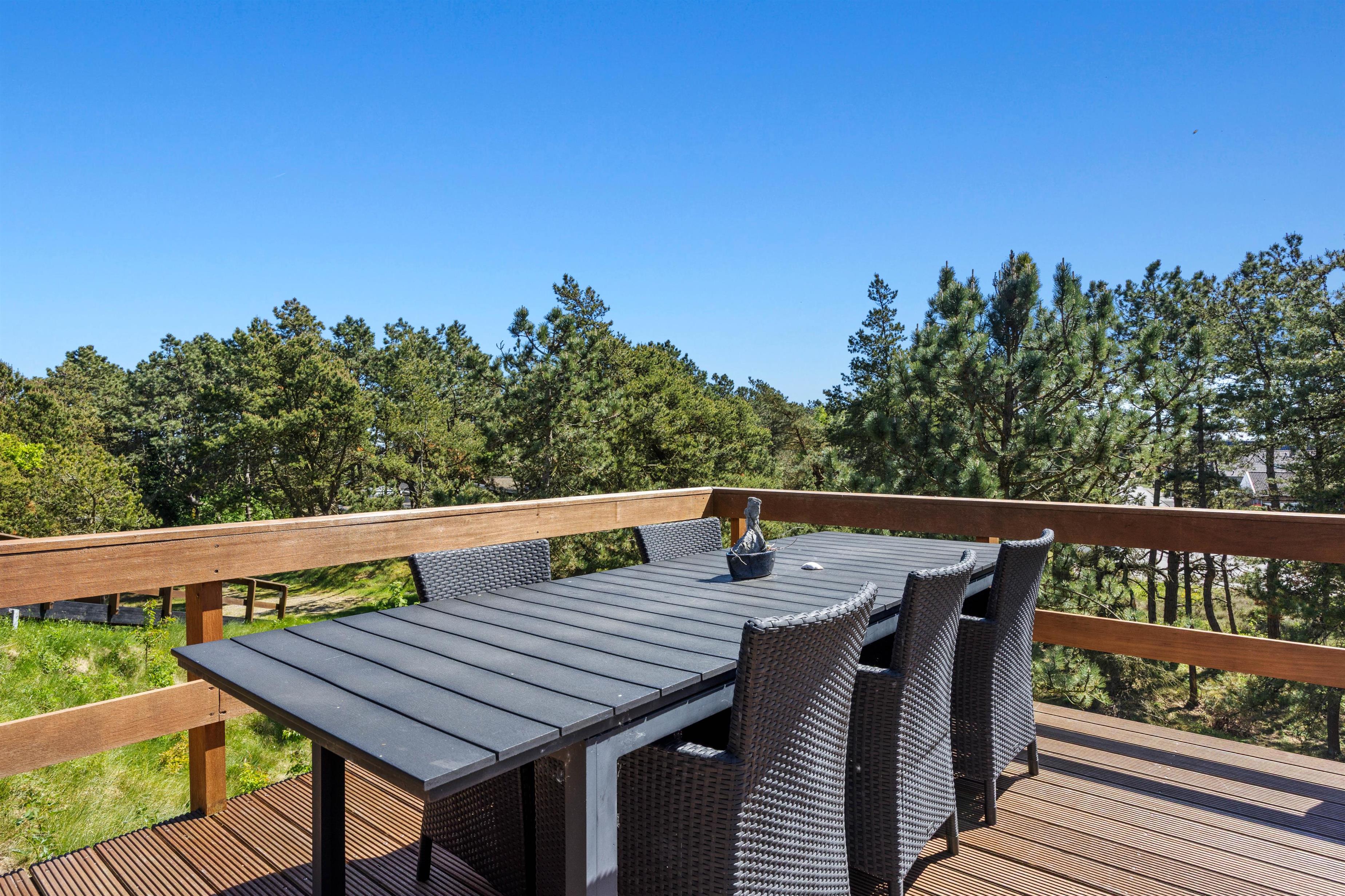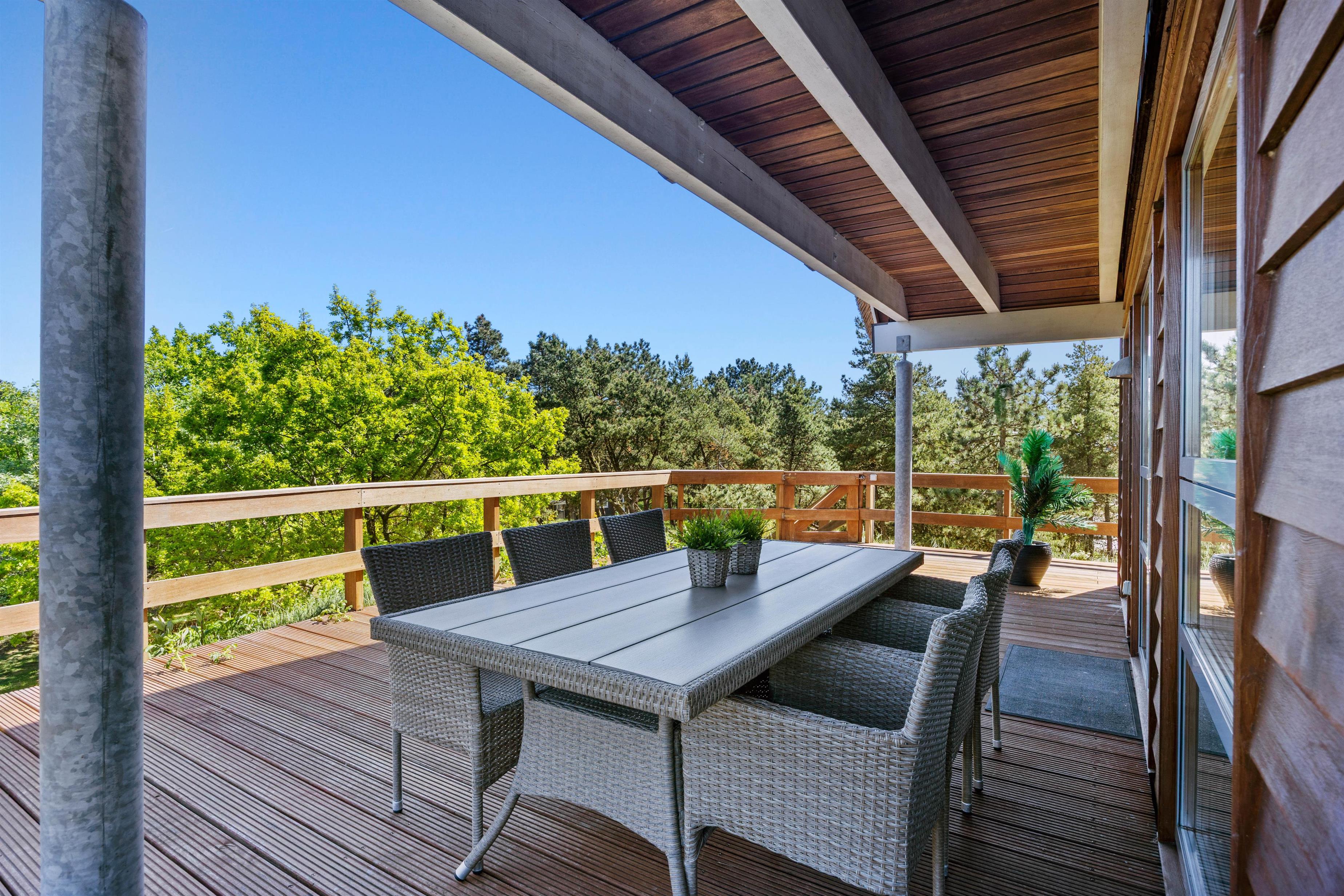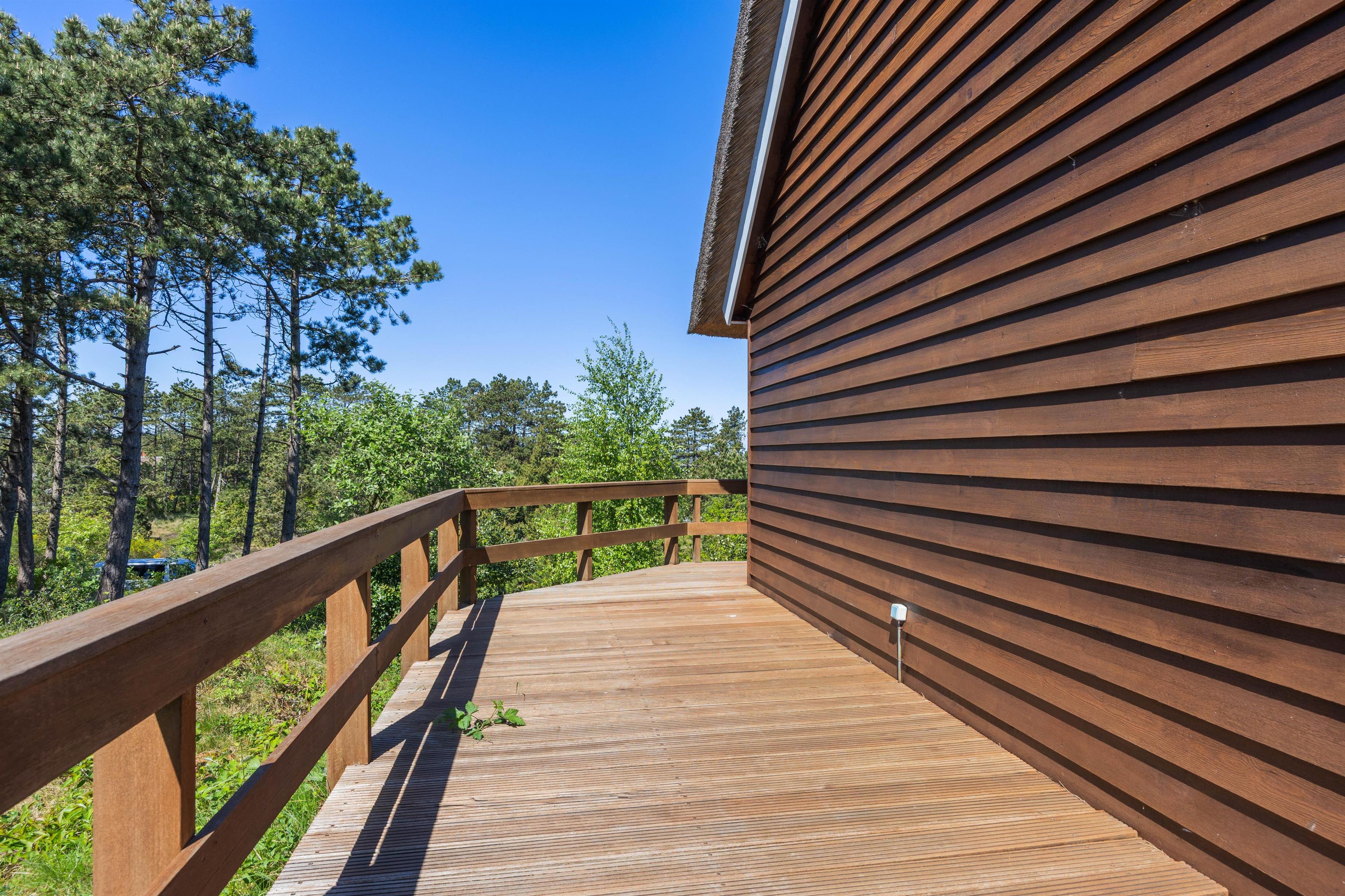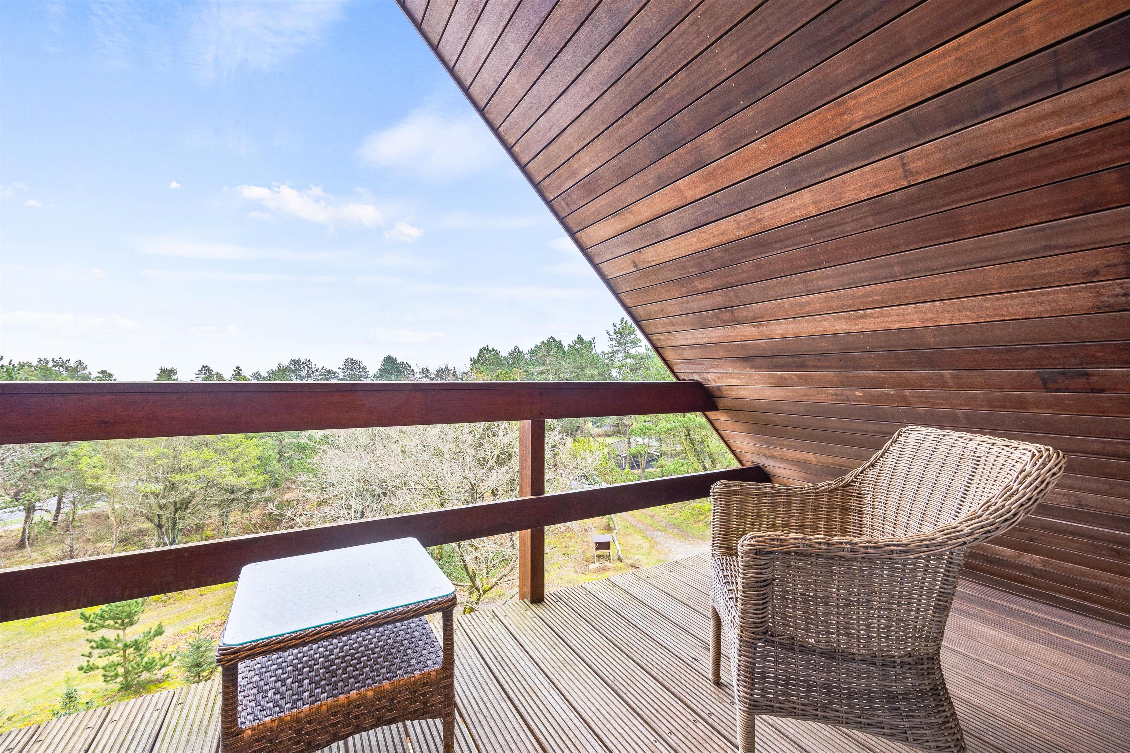 Balkonen er dejligt sted, hvor I kan nyde morgenkaffen og fuglenes sang. Med feriehusets rolige beliggenheden mellem træer, kan I solbade, holde grillaftner og bare være jer! Omkring sommerhuset er nemlig en dejlig terrasse, hvor havemøblerne venter på jer! På grunden kan man sommetider endda være så heldige at se rådyr helt tæt på!
