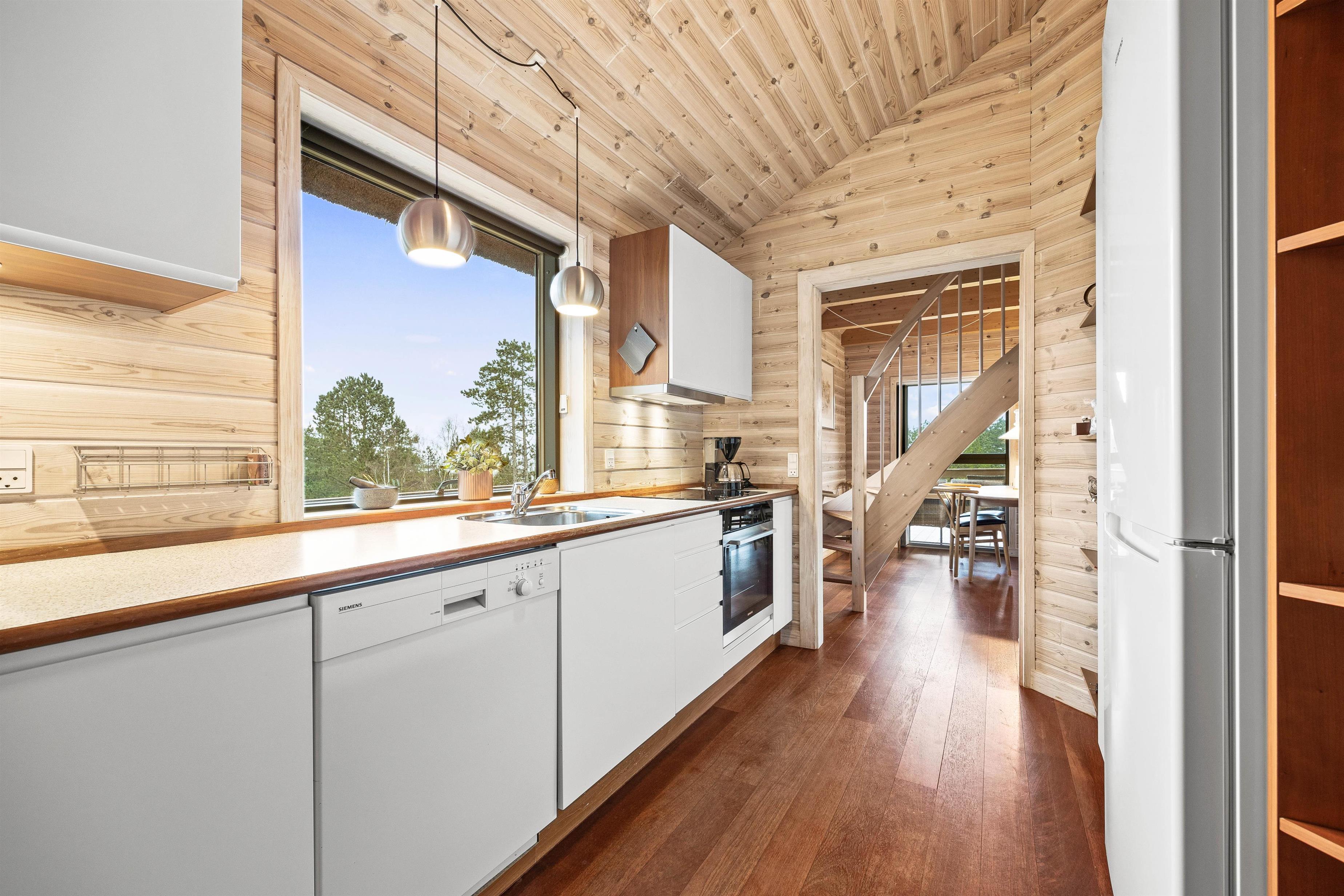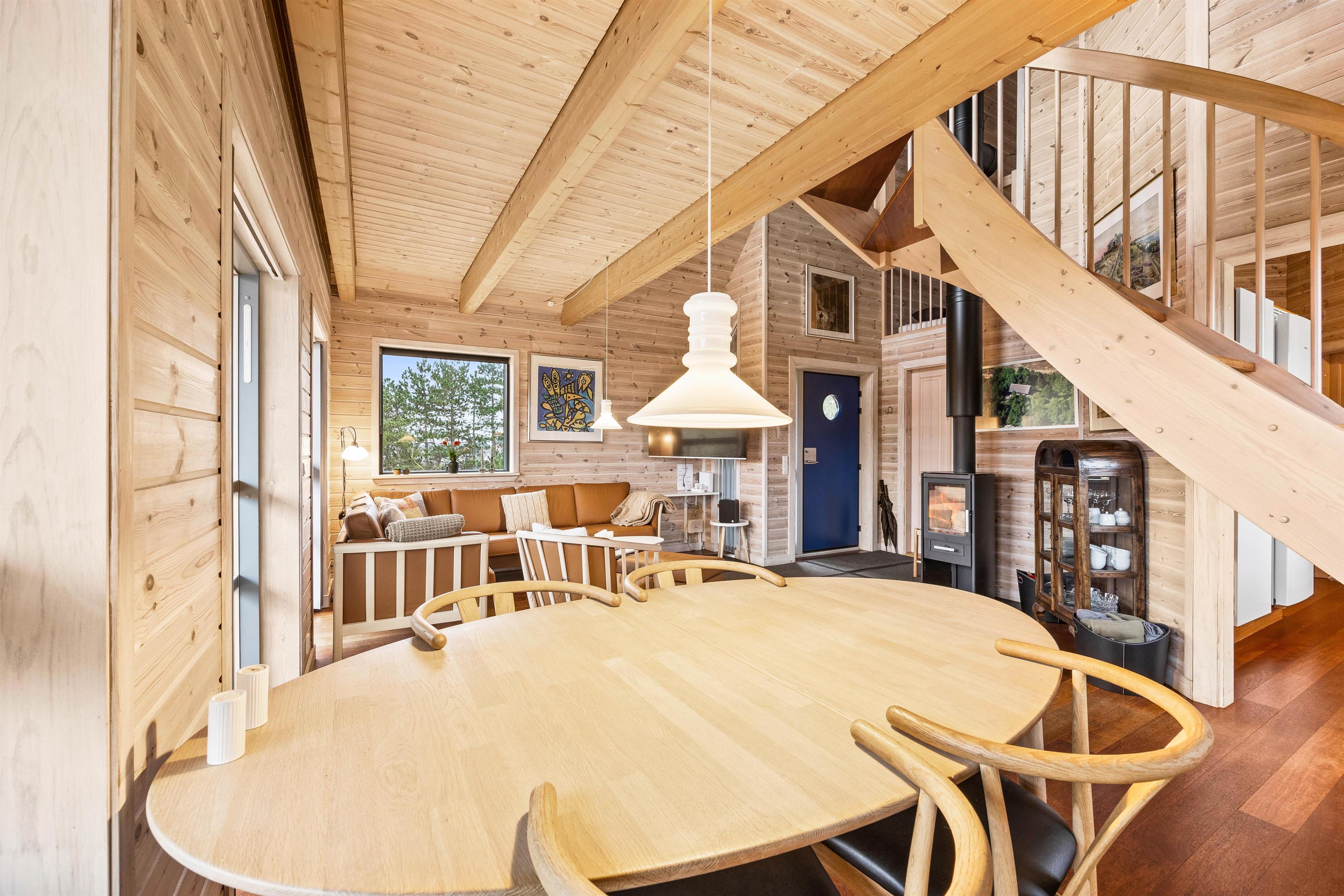 I stuetagen finder I et fint badeværelse med vaskemaskine, to gode soveværelser samt et dejligt alrum, der er i åben forbindelse med det funktionelle køkken. I køkkenet bliver madlavningen til en leg, især når opvaskemaskinen klarer den kedelig opvask og giver jer mere tid til at være sammen. I stuen kan I sætte jer godt til rette i sofaarrangementet og spille spil, strikke eller læse en krimi. På de køligere dage kan I både gøre brug af den energibesparende varmepumpe og brændeovnen, der slår et ekstra slag for hyggen. Trappen i stuen giver jer adgang til hemsen. Her finder i den femte soveplads samt en ekstra lille stue med adgang til feriehusets balkon.