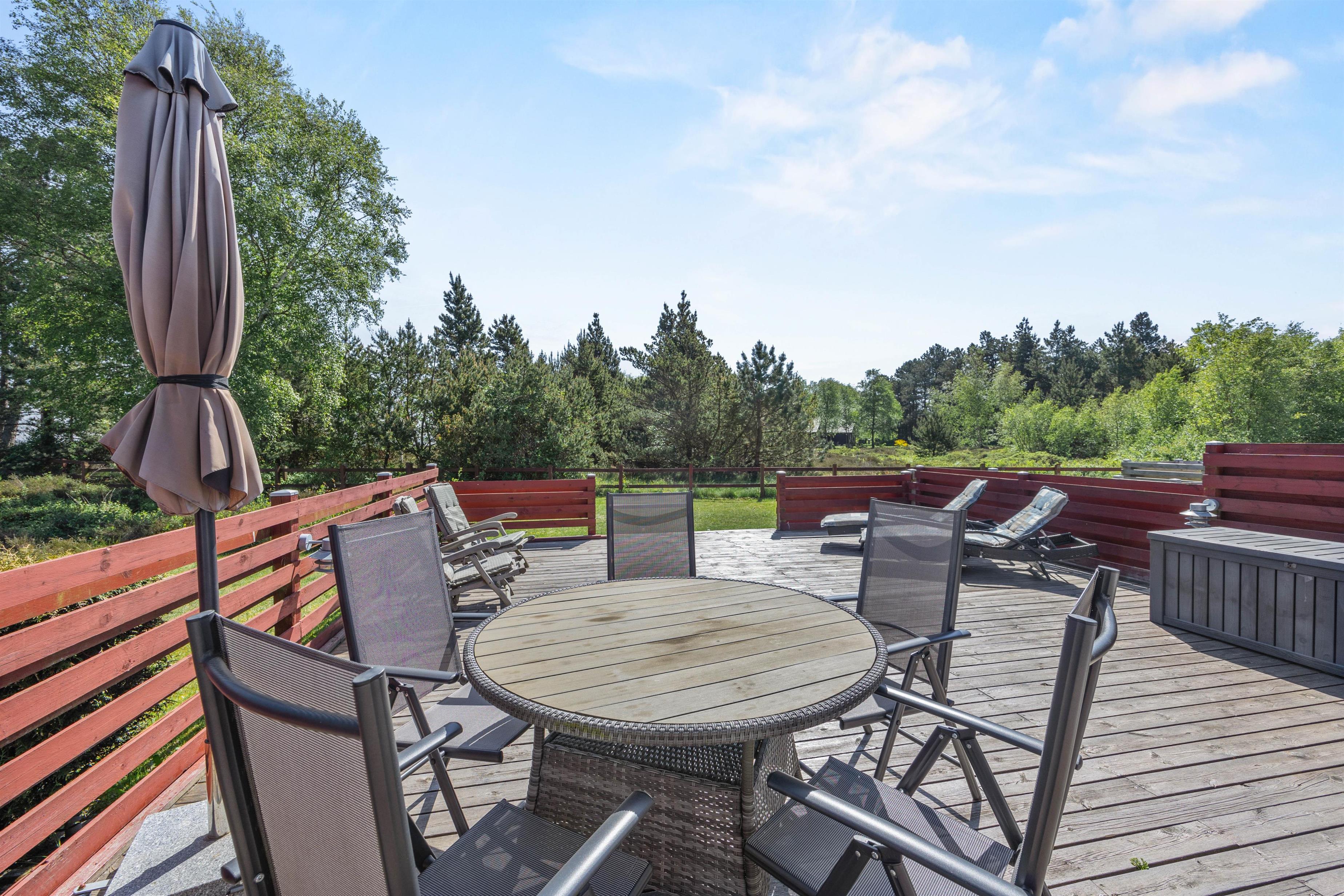 Til en afslappende sommerdag kan I finde et behageligt sted på den store, afskærmede terrasse ved feriehuset. Komfortable havemøbler står til jeres rådighed, og der er grill på terrassen til en hyggelig grillaften med familien. Den vestvendte terrasse er praktisk indhegnet, som er helt ideelt til jer med hund.