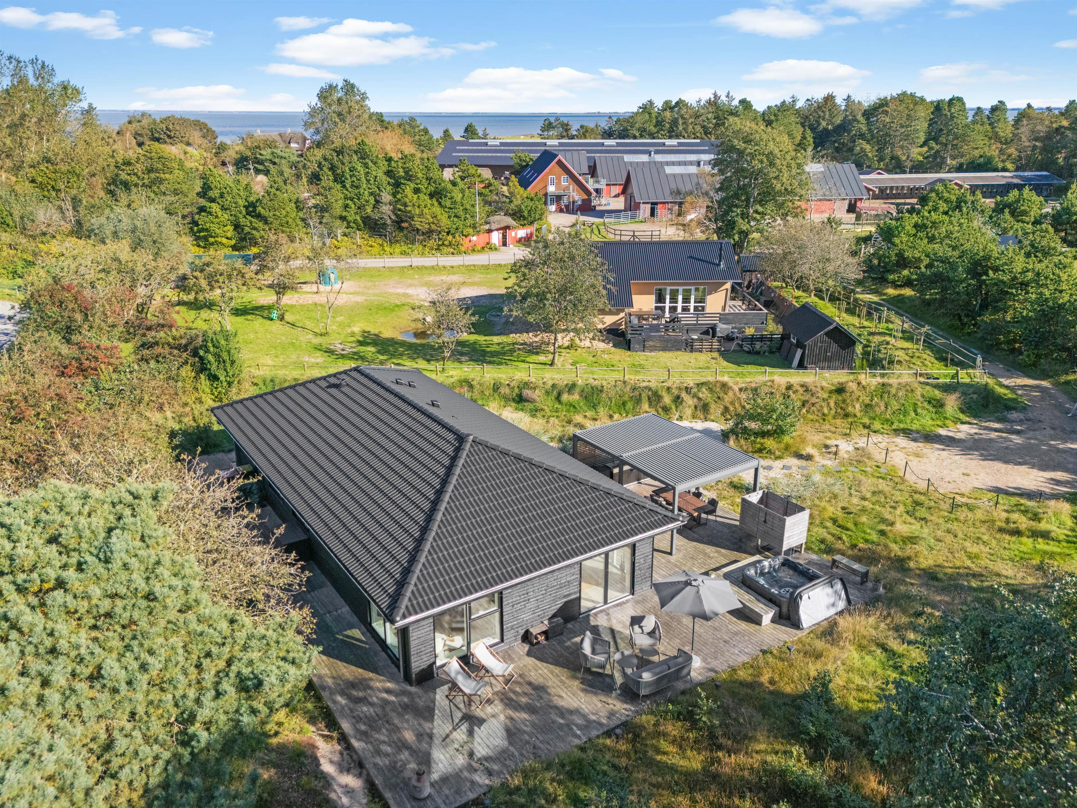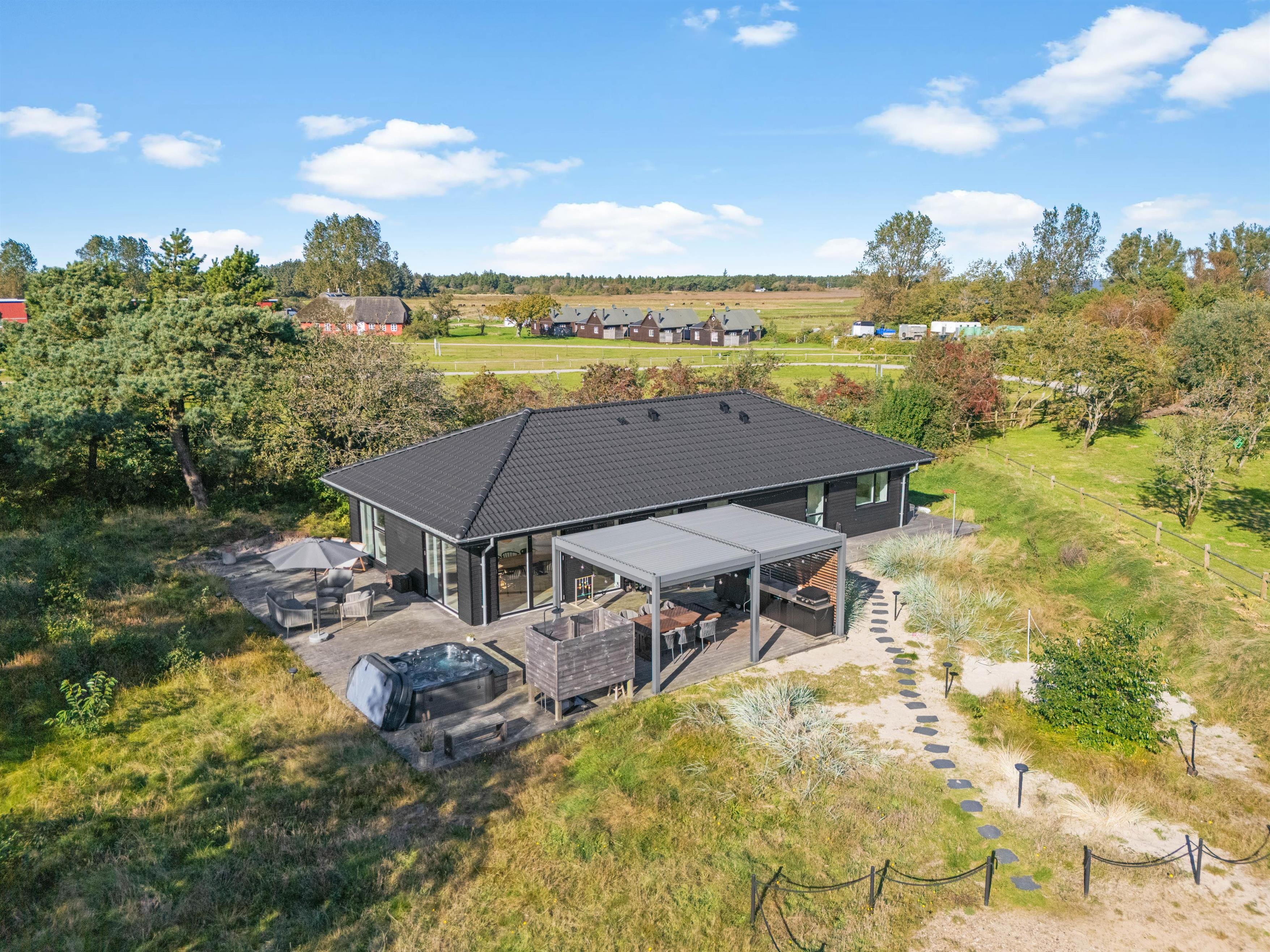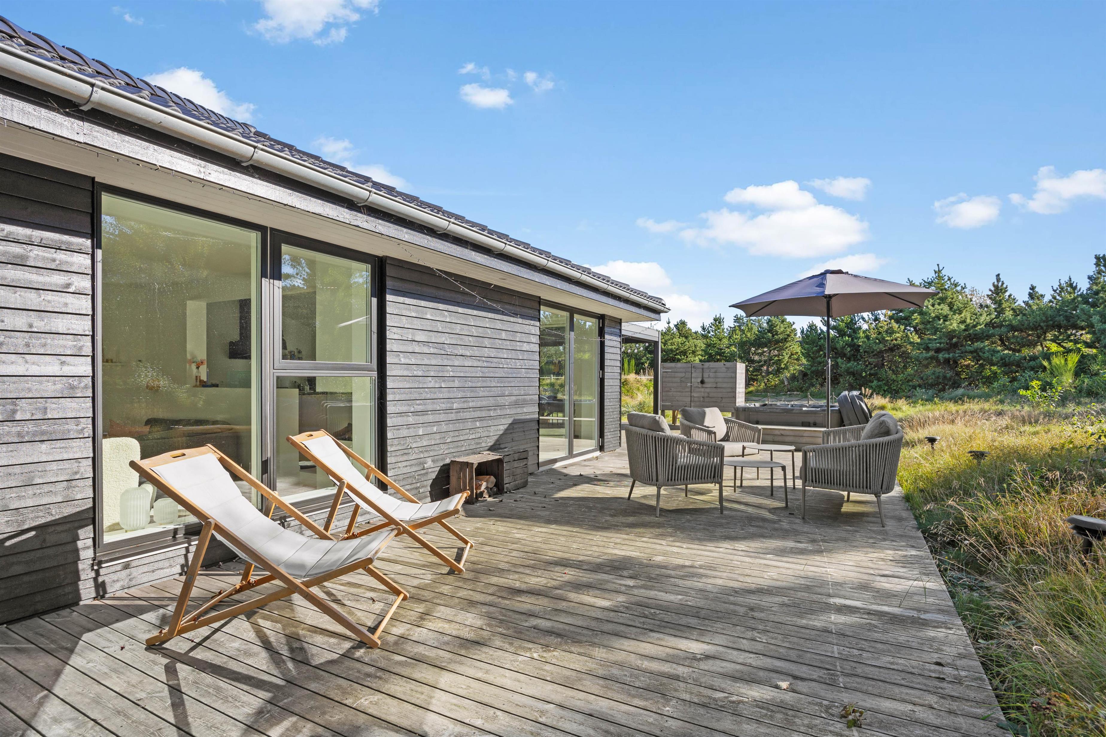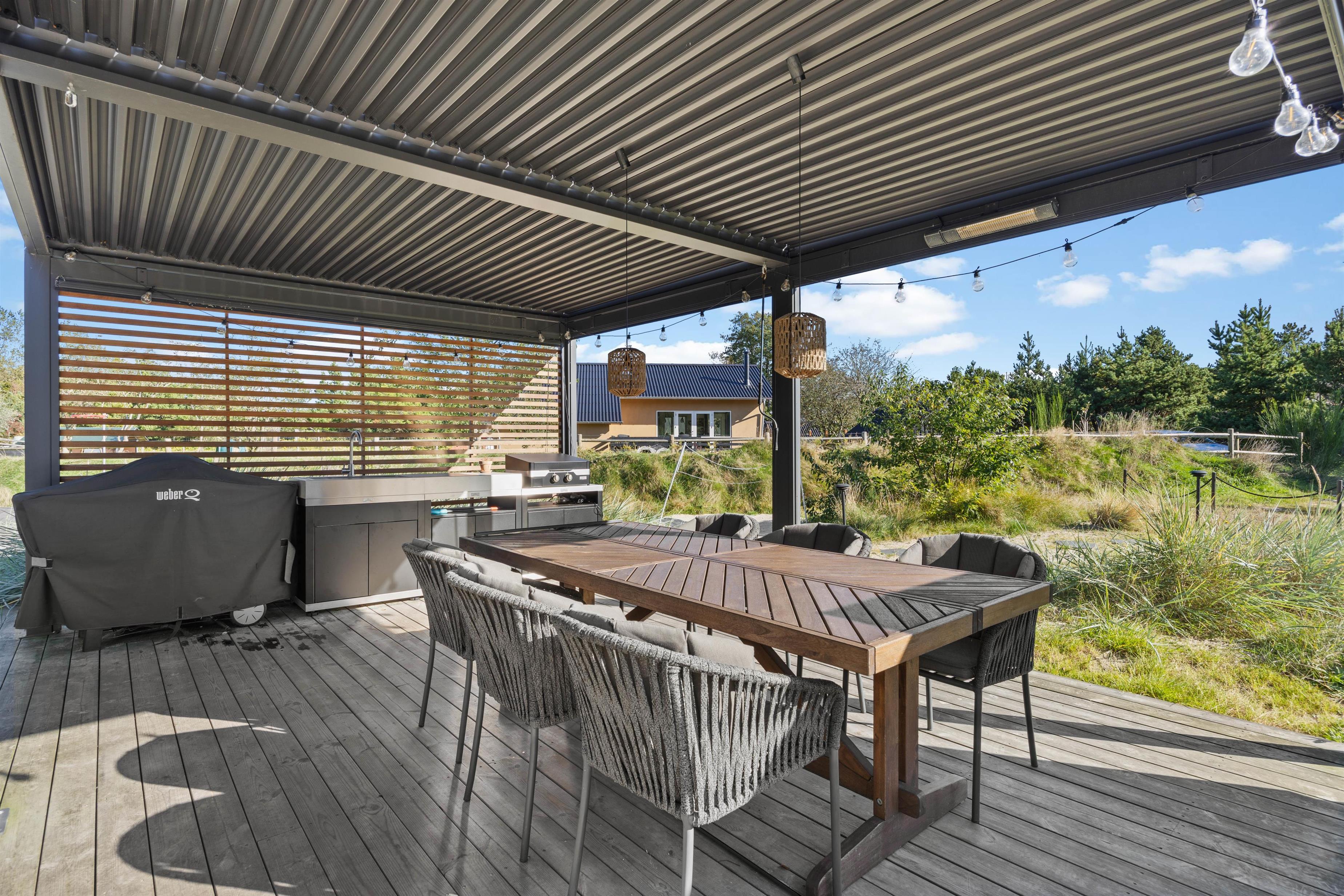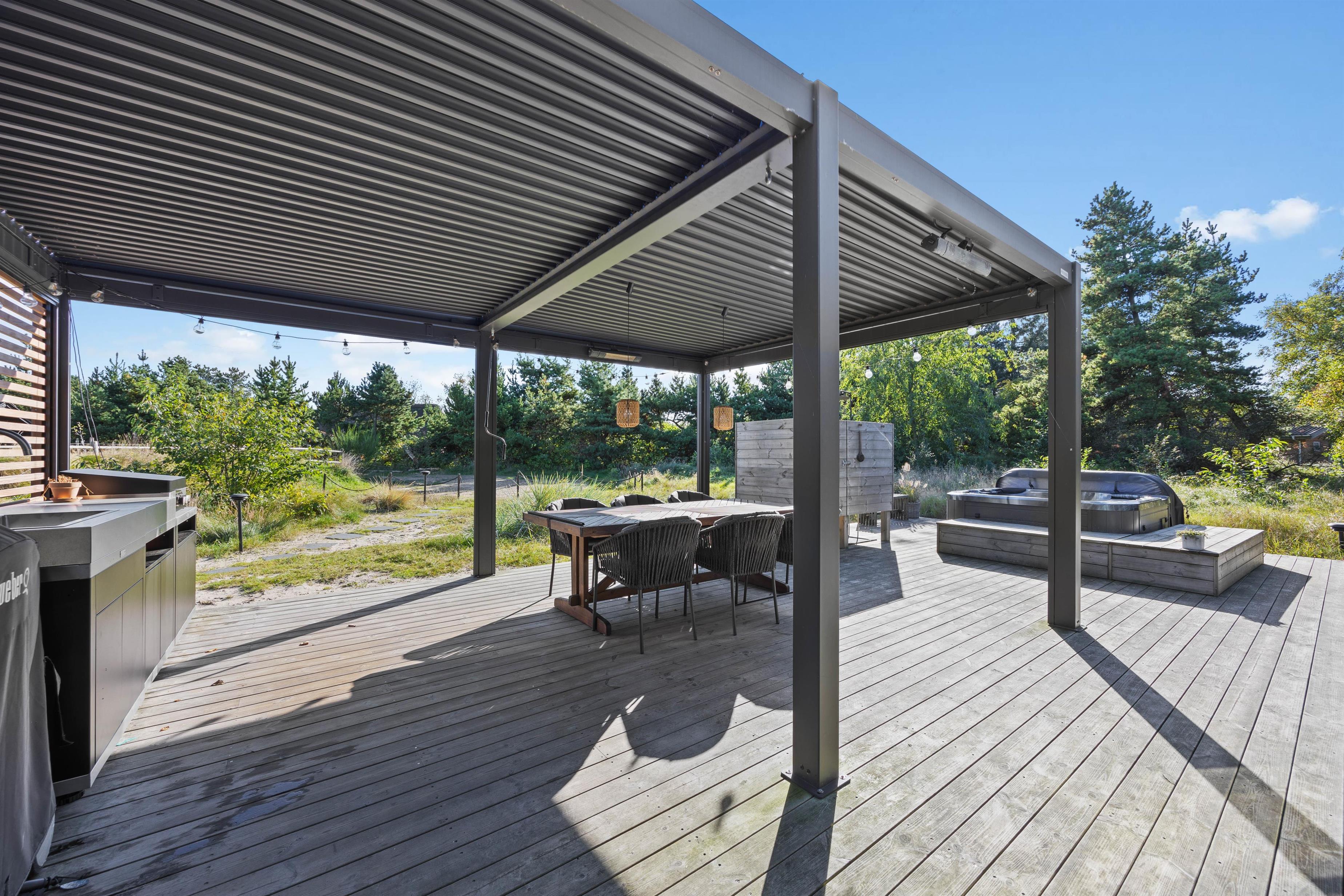 Det store terrasseområde er delvist overdækket og byder på en vidunderlig udsigt over det grønne landskab. Slap af eller tag solbad i de komfortable havemøbler, og tag en dukkert i udespaen eller en opfriskning under udebruseren, hvilke kan benyttes fra april til november. Slå parasollen op, hvis solen bliver for stærk. Tænd op i gasgrillen til aften, og nyd et lækkert grillmåltid sammen. Her kan i for alvor nyde friheden under åben himmel og slappe af på terrassen.