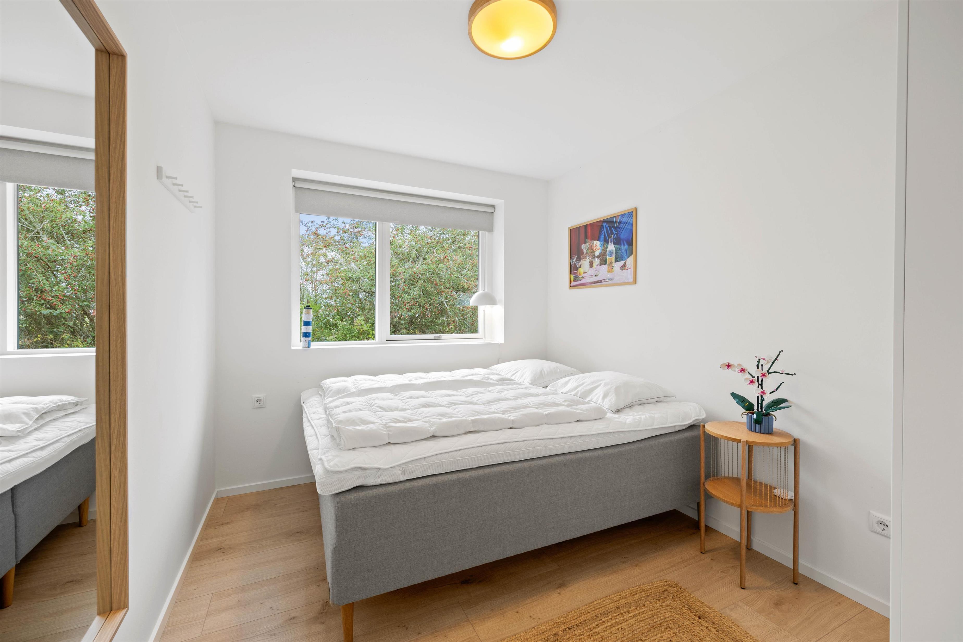 Sommerhuset har tre soveværelser, som alle er indrettet med dobbeltsenge, og der er også en sovesofa med plads til yderligere to personer. Der er rengøringsvenlige laminatgulve med gulvvarme i soveværelserne, så I er sikret en behagelig varme. En energibesparende varmepumpe er til rådighed for jer på opholdet. De to pæne, moderne badeværelser har også gulvvarme, så I behøver ikke at fryse tæerne under tandbørstningen. Desuden er der vaskemaskine og tørretumbler i sommerhuset, så I kan få frisket håndklæderne op undervejs.