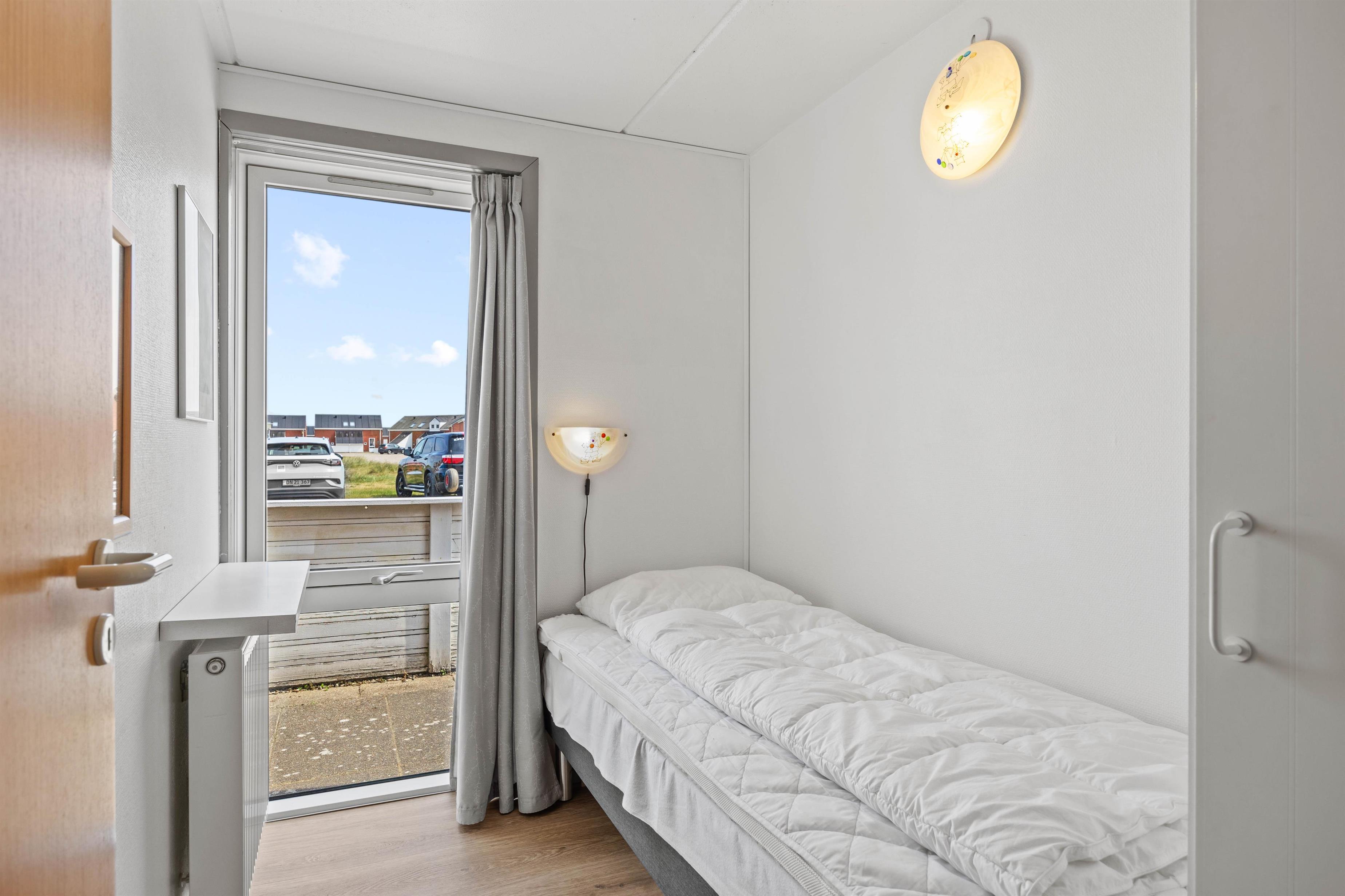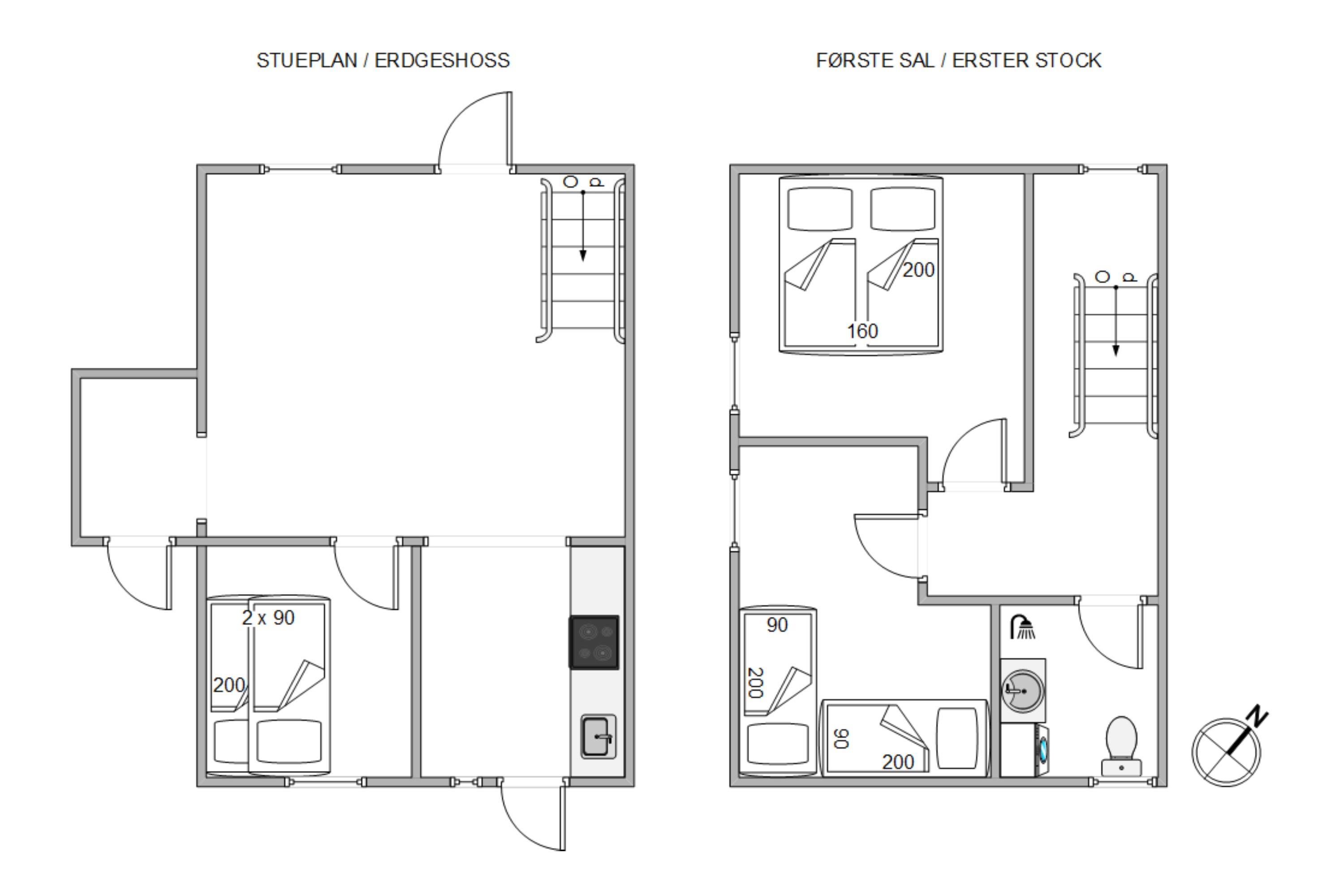 Det åbne opholdsrum indeholder spisestue og køkken. Stuen har direkte udgang til den delvist indhegnede terrasse, hvorfra der er en fantastisk udsigt over vadehavsnaturen. I kan slappe af i sofaen, og hele etagen har et rigtig fint lysindfald og et pænt trælaminatgulv. I kan slappe af med både tyske og danske tv-programmer. Det åbne køkken er udstyret med alt, hvad du behøver for at tilberede lækre måltider. Ud over køleskab og ovn er der også mikroovn, fryser og opvaskemaskine til rådighed. I stueetagen er af de 3 soveværelser. Dette lyse værelse er ideelt til børn og unge, da der er en køjeseng, som måler 2x 90x200cm.
