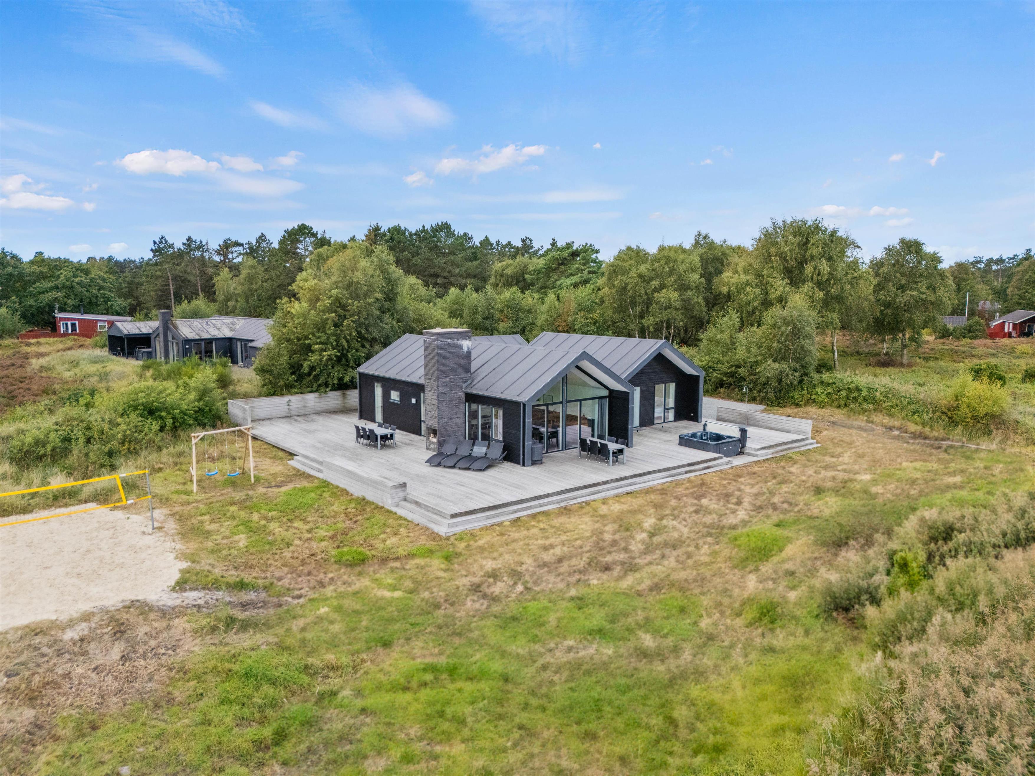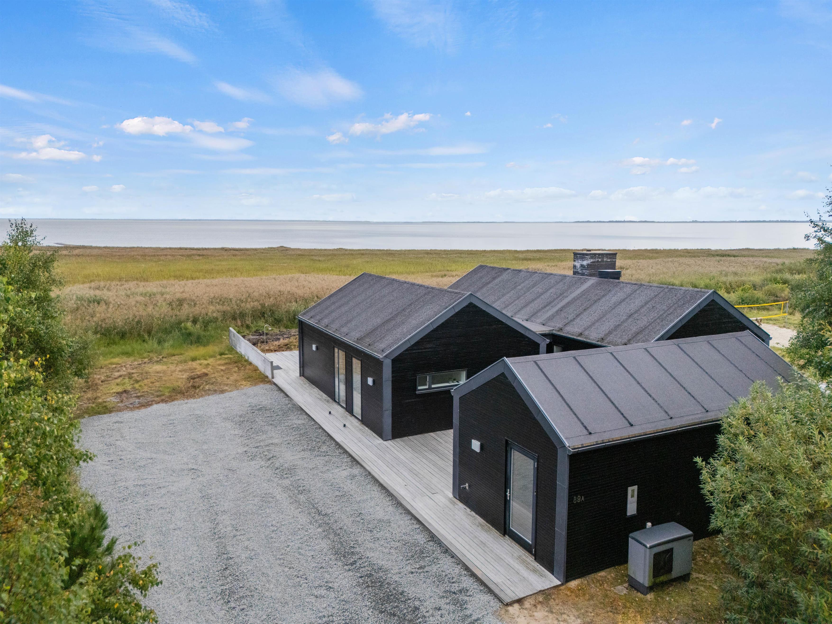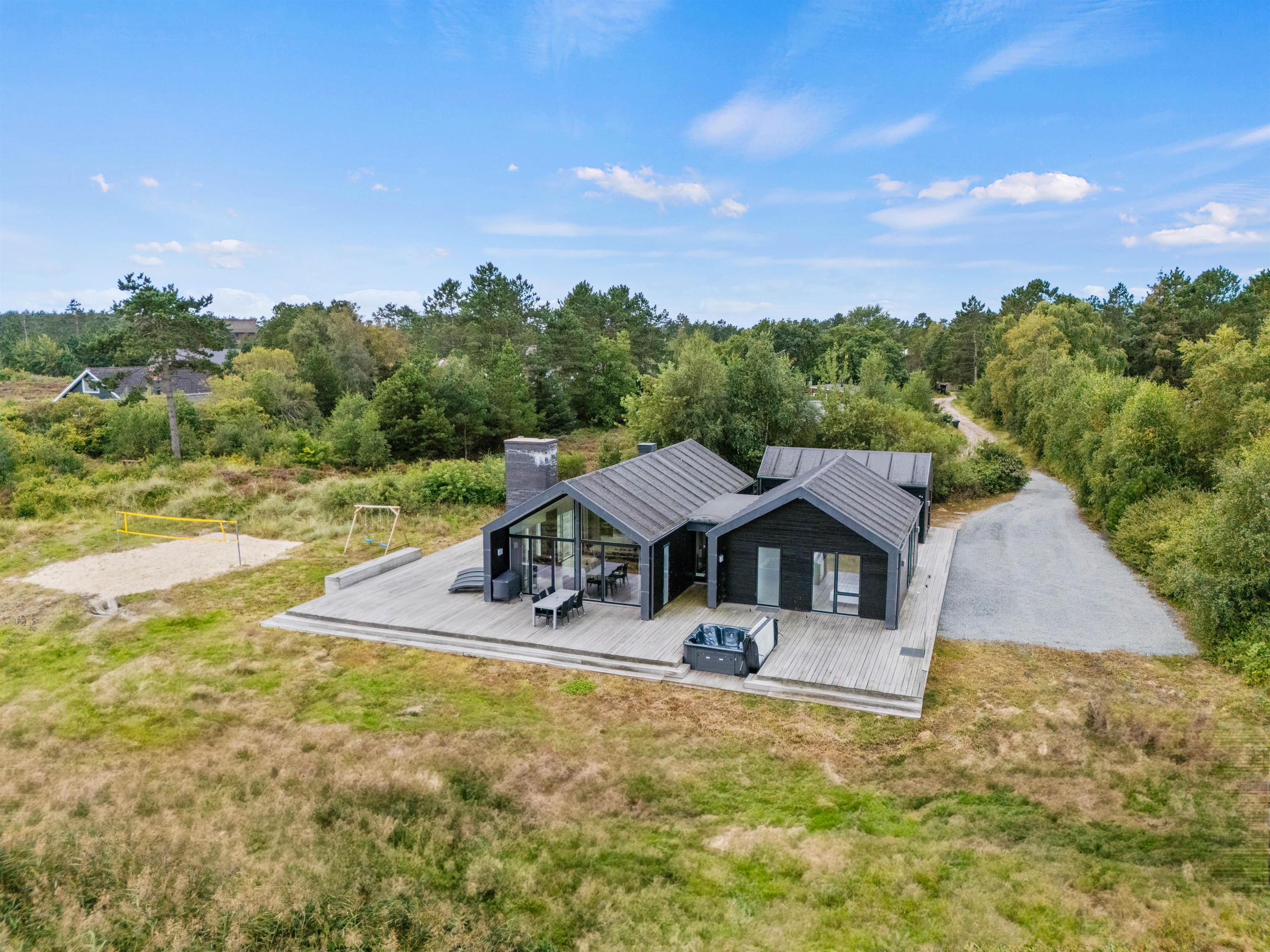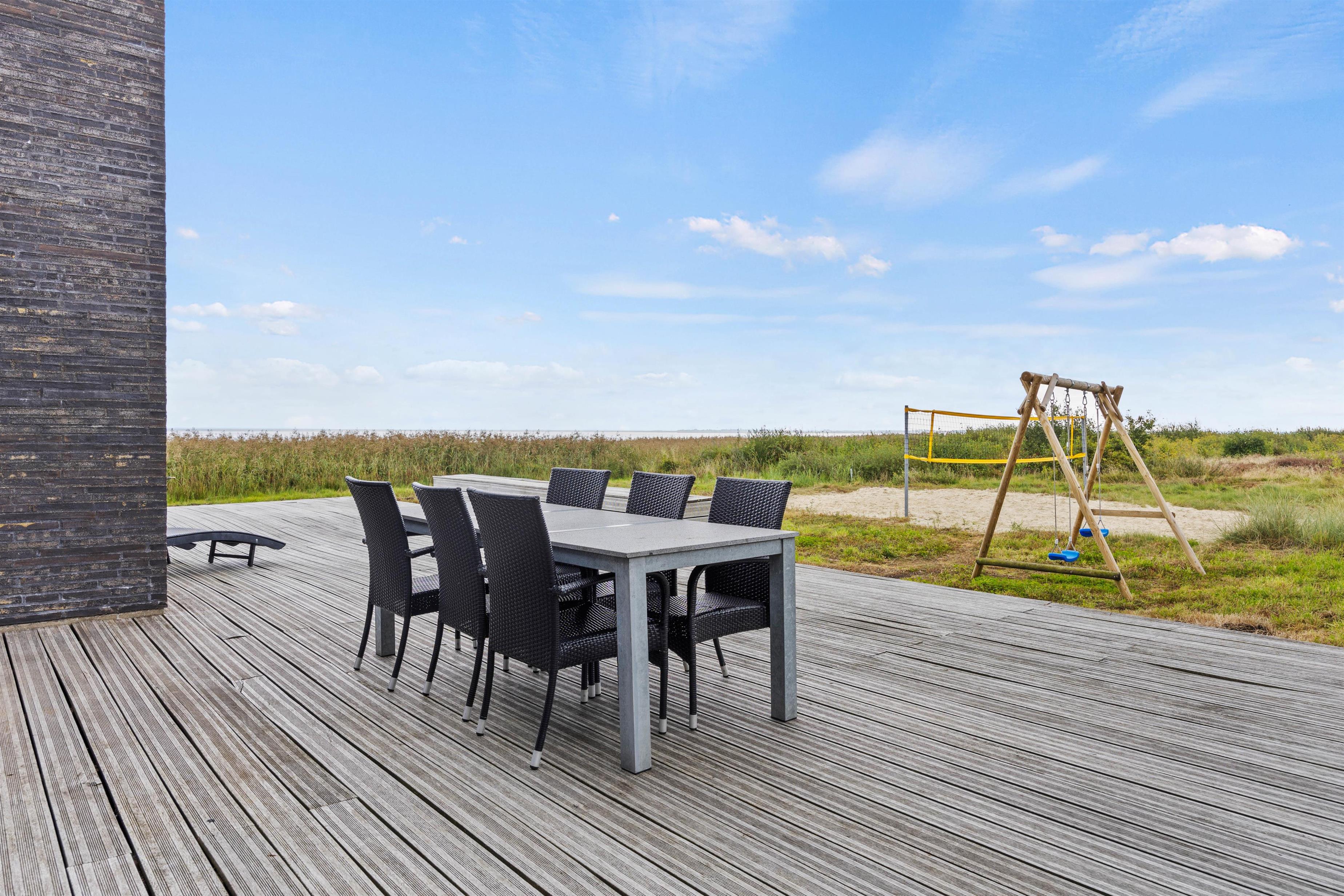 Feriehuset er omgivet af en stor træterrasse, som er udstyret med komfortable havemøbler og liggestole. Til børnene er der gynger, en sandkasse og en grøn græsplæne til leg. Spil et vikingespil eller bold med dem, og nyd samtidig de betagende omgivelser. En udendørs bruser (som kanbenyttes fra april til november), en volleyballbane og det absolutte højdepunkt - en stor udespa med en helt unik udsigt over den uspolerede natur og Vadehavet - giver ekstra komfort, badesjov og afslapning. Tænd op i grillen til aften, og nyd et lækkert grillmåltid sammen, imens skyggerne bliver lange.