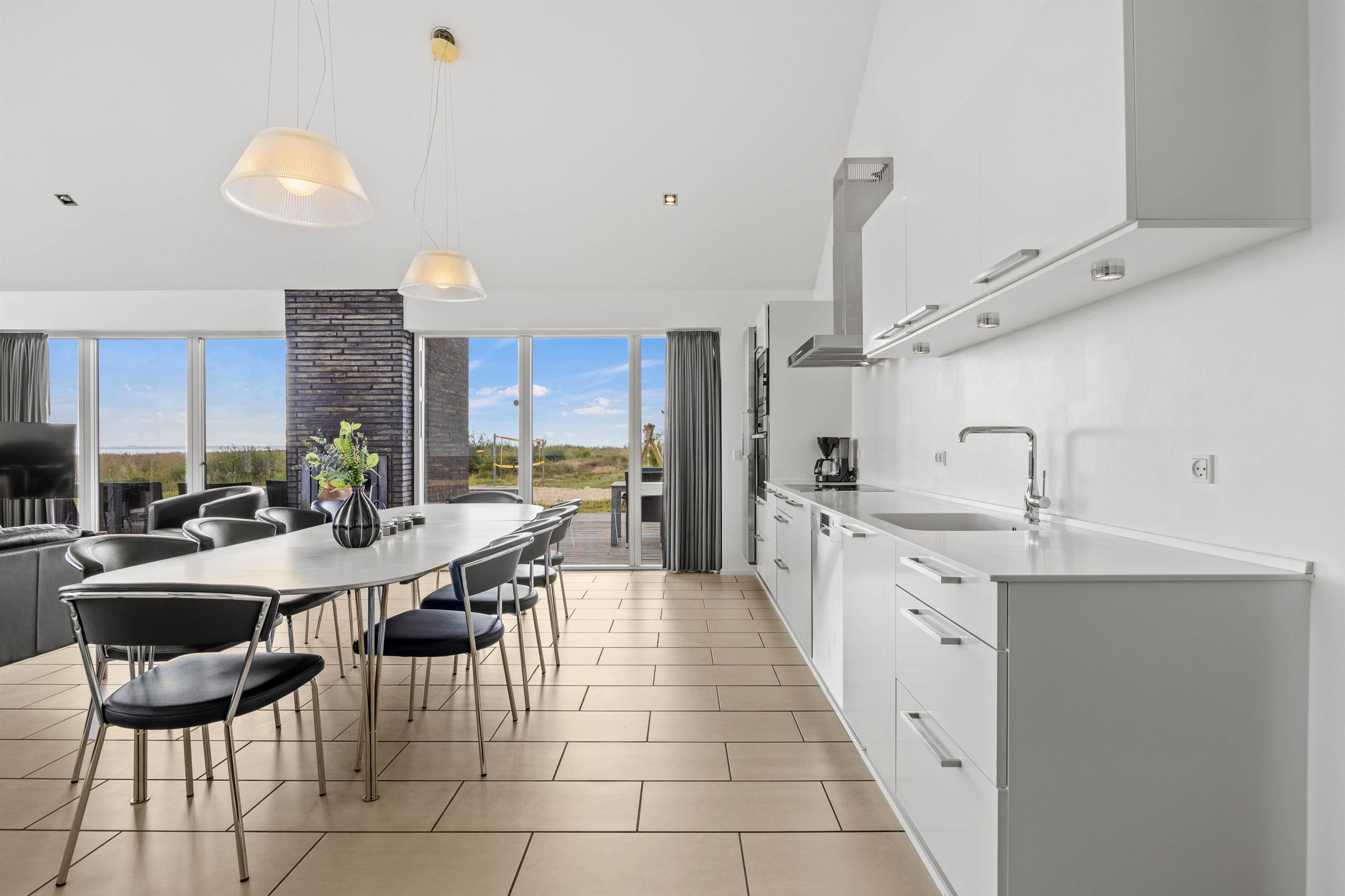 Det åbne køkken i forbindelse med stue/opholdsrum bliver hurtigt feriehusets trafikknudepunkt. Køkkenet indeholder alt, hvad I behøver for at forkæle hinanden med lækre hjemmelavede måltider. Det store opholds- og spiseområde indbyder til hyggeligt samvær med brændeovn, lædersofaer og lænestole samt et stort spisebord.