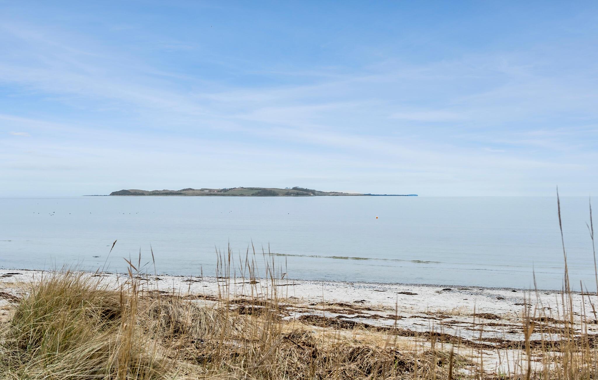 Flot feriehus med panoramaudsigt og direkte adgang til børnevenlig sandstrand ved Havnsø.