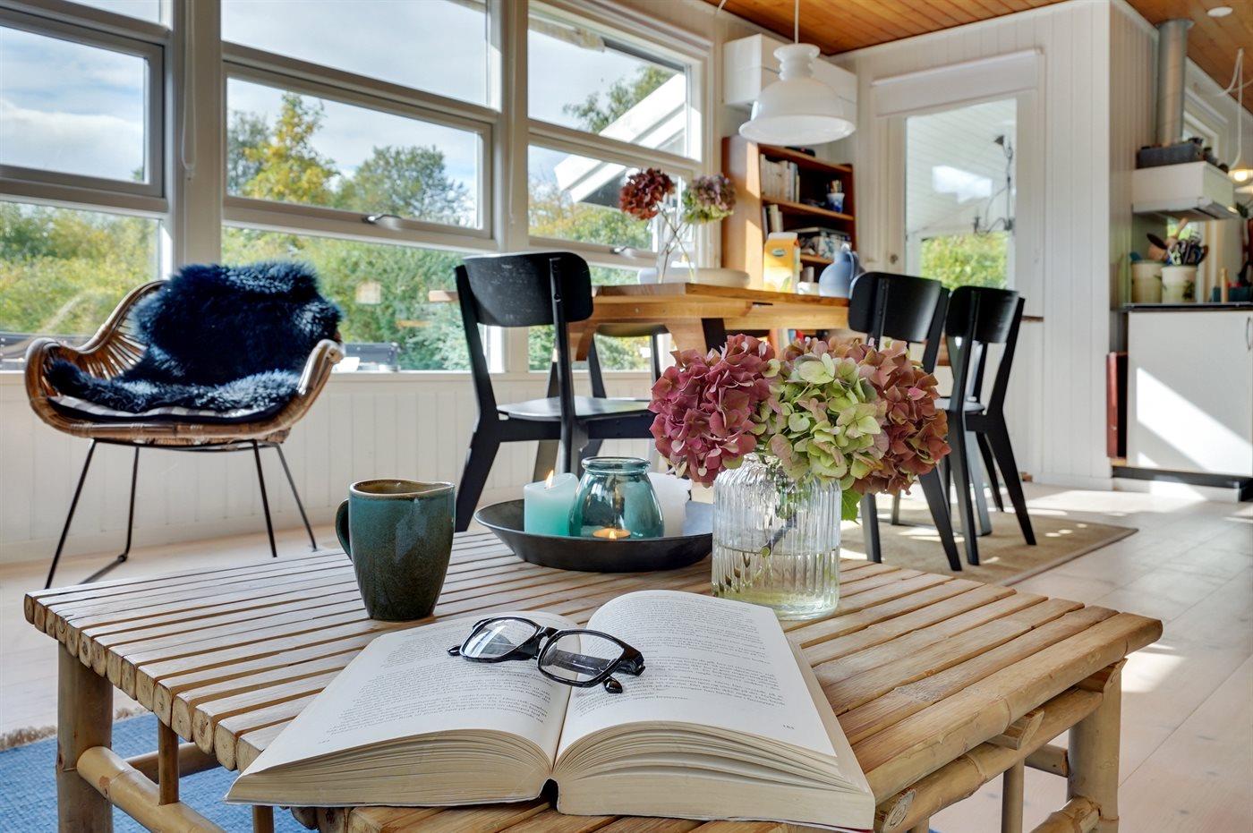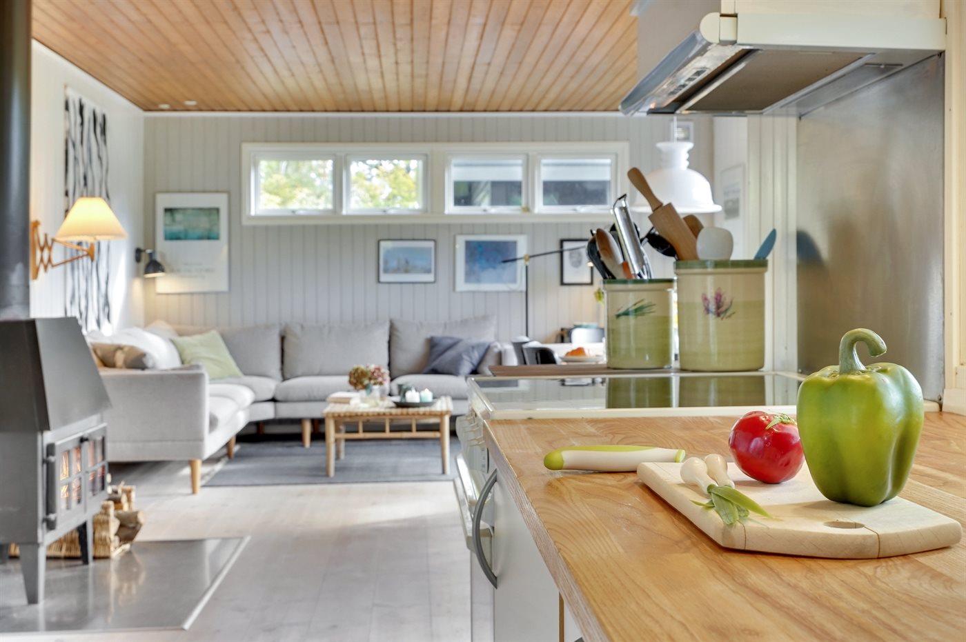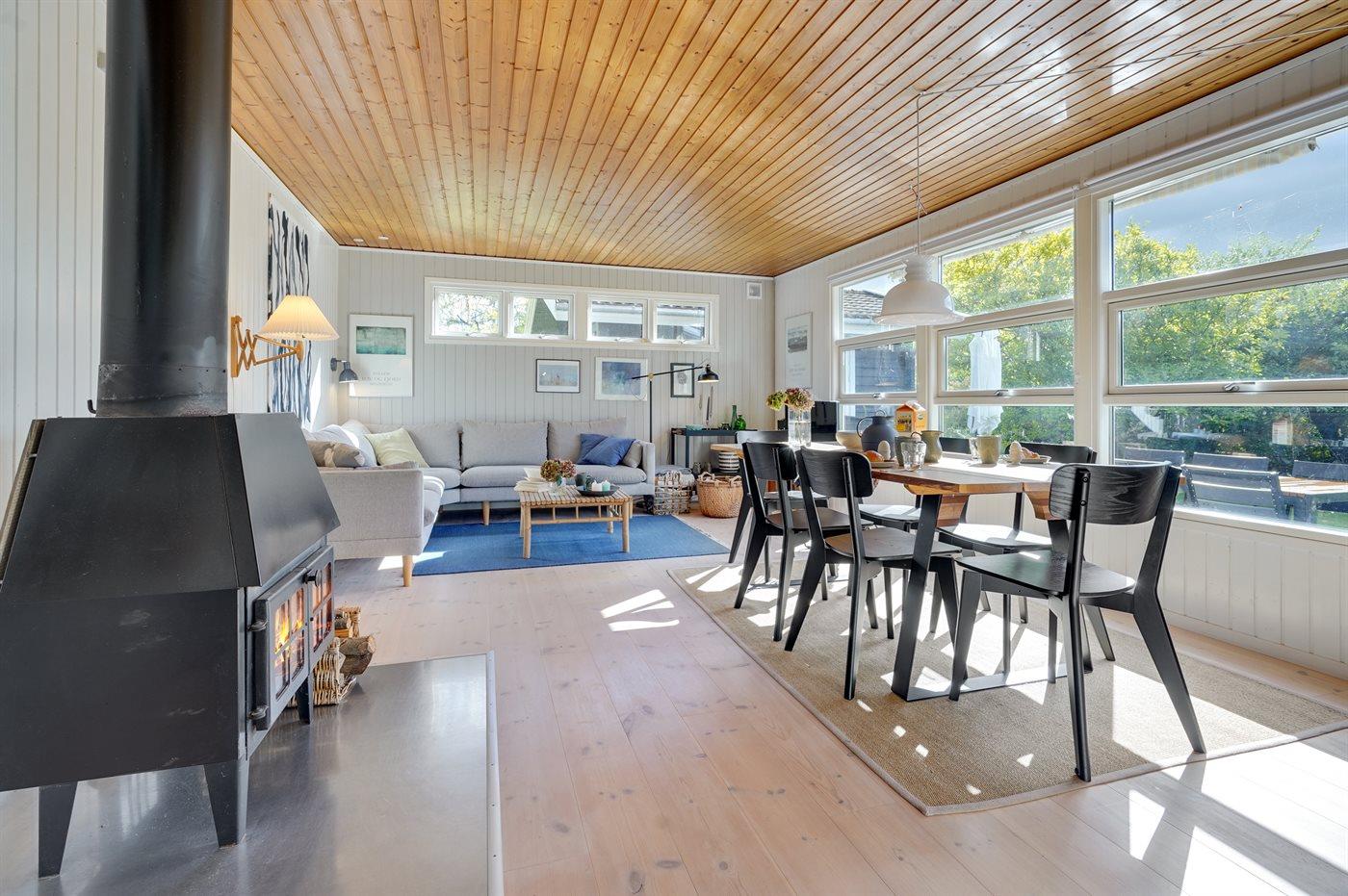 Stue og køkken går ud i ét. Fra stuen er der udgang til 12 kvm udestue/overdækket terrasse med spiseplads, hvor de lange sommeraftener kan nydes.