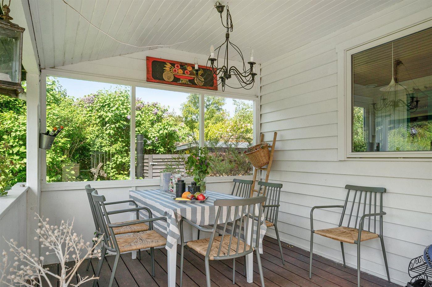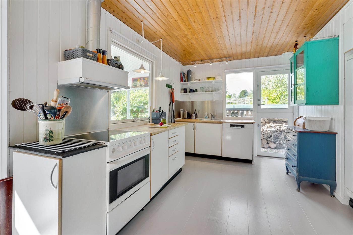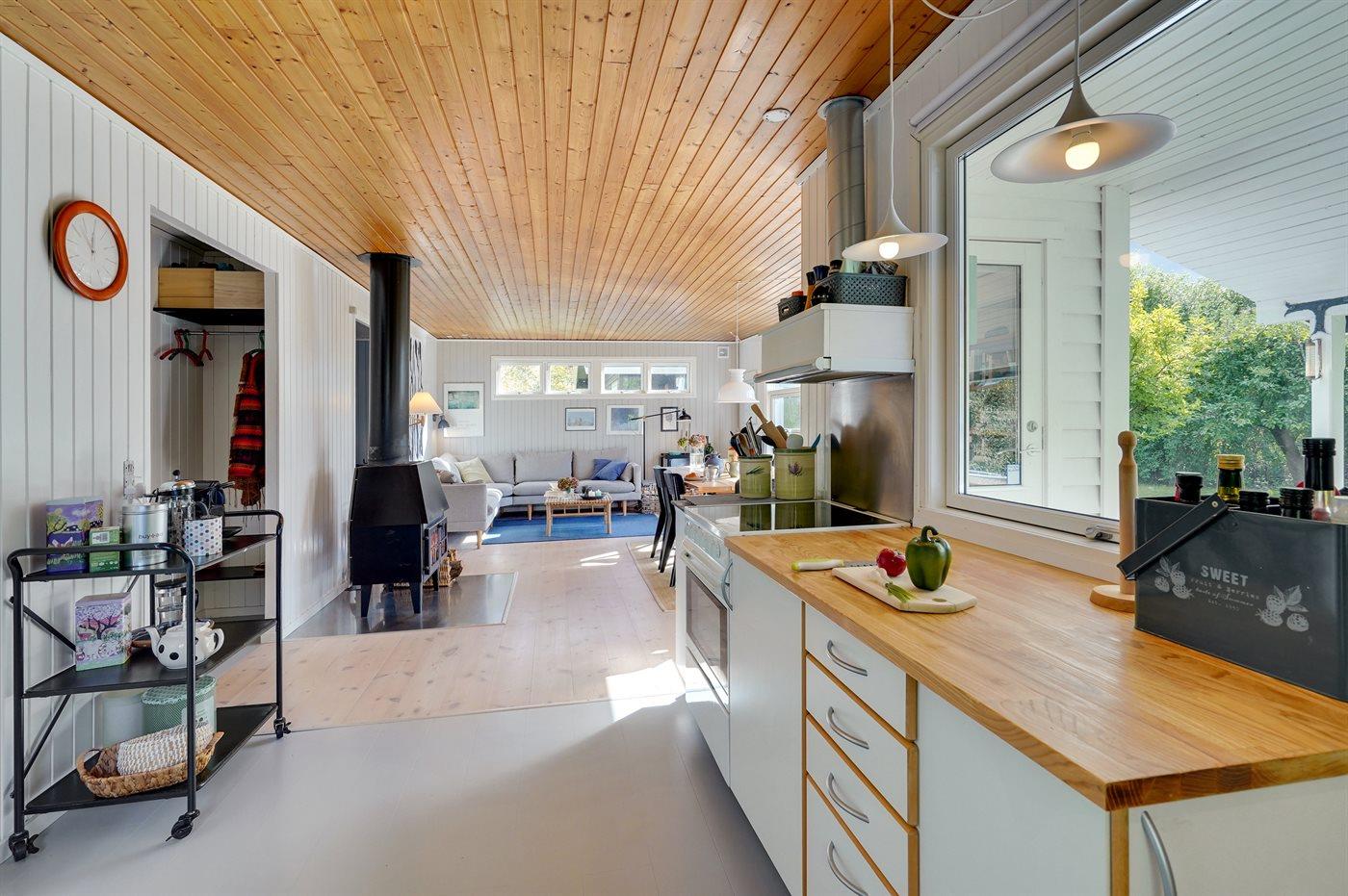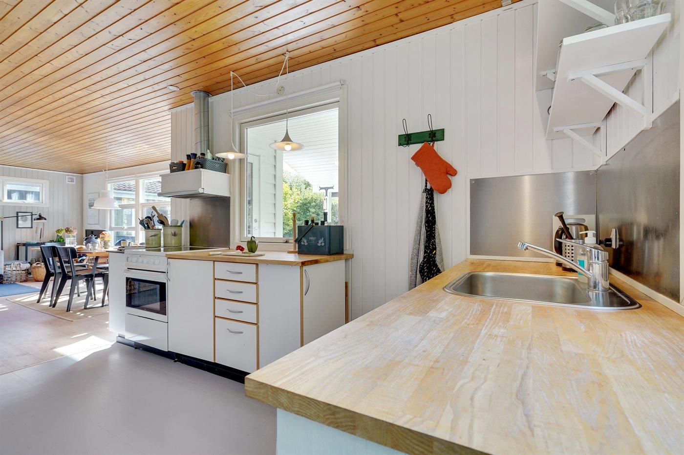 Stue og køkken går ud i ét. Fra stuen er der udgang til 12 kvm udestue/overdækket terrasse med spiseplads, hvor de lange sommeraftener kan nydes.