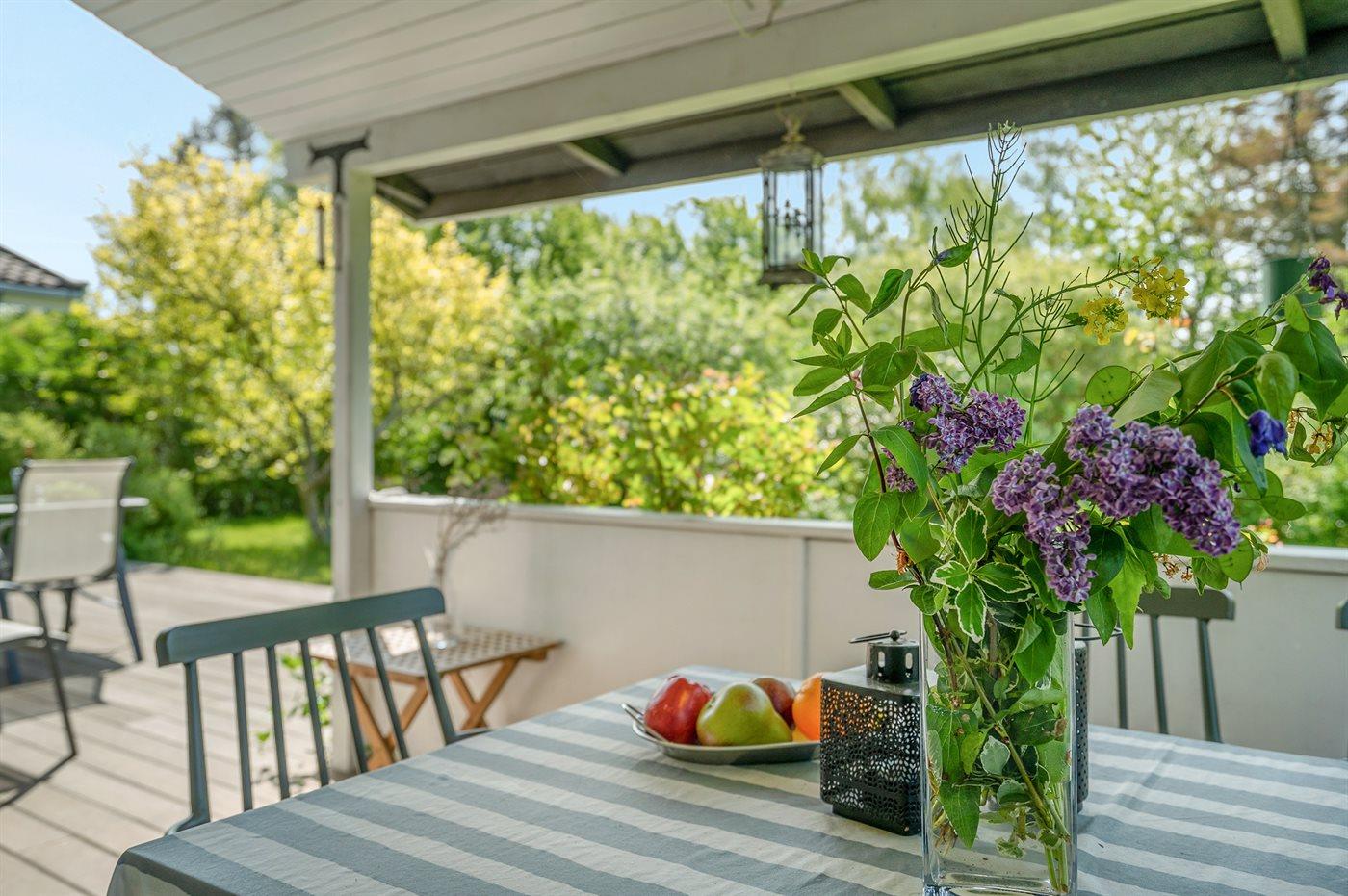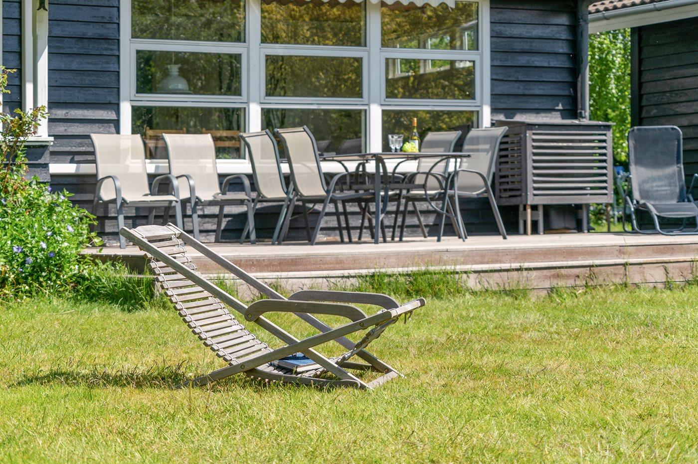 Havegrunden er 1085 m², ugenert og med 25 m² træterrasse, som forbinder hus og anneks. På terrassen er der spiseplads, grill og solstole. I haven er der gynge, trampolin og en bålplads.