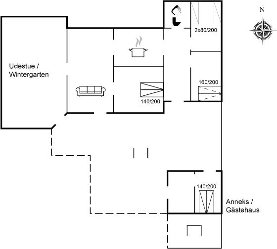 Indenfor giver den store lyse stue og spisestue rig mulighed for at være sammen og hygge sig med venner og familie. Køkkenet er af ældre dato, men funktionelt. Der findes 3 soveværelser; 1 med dobbeltseng, 1 med 2 enkeltsenge og 1 med dobbelt sovesofa. I husets anneks er der yderligere 2 sovepladser i dobbeltseng. Det moderne badeværelse er med bruseniche, gulvvarme og der findes en vaskemaskine.