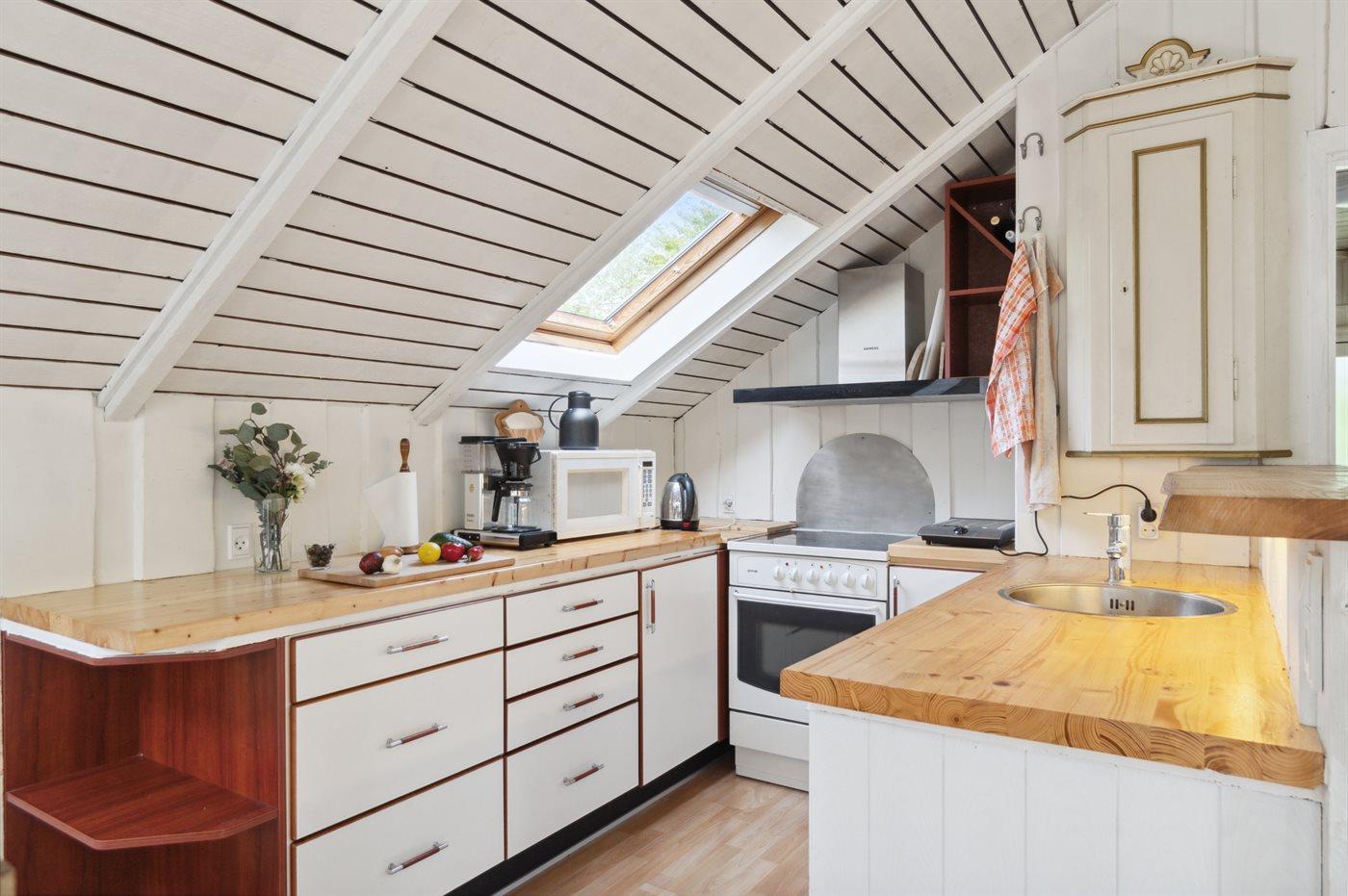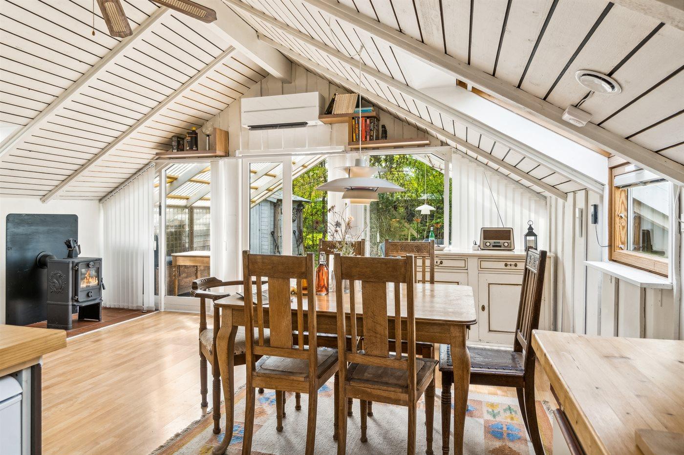Køkkenet er i åben forbindelse med spiseplads og stue, hvorfra der er udgang til et stort overdækket terrasseområde. I huset er der 2 soveværelser med hver 2 sovepladser, og i tillæg hertil er et isoleret anneks fra 2022 med 2 sovepladser, og som opvarmes med elradiator. Badeværelse er med bruseniche og vaskemaskine. I selve huset er der luft-til-luft varmepumpe og brændeovn.
