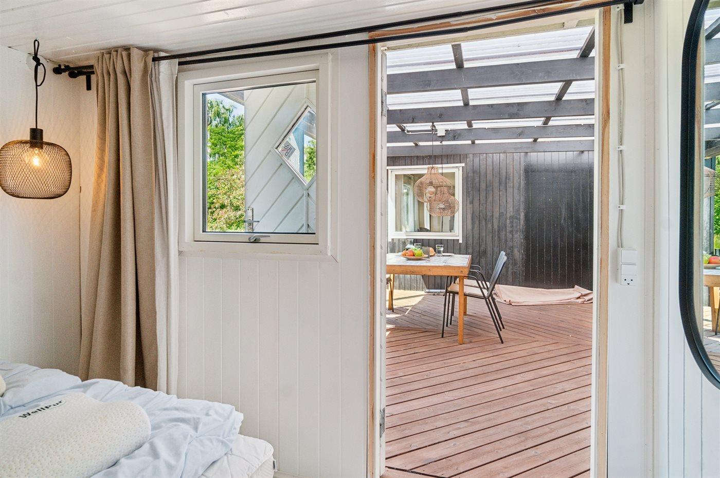 Huset er indrettet med et hyggeligt køkkenalrum og stue ud i et – herfra er der udgang til et stort terrasseområde, hvoraf en del er overdækket og hvor det er muligt at finde skygge og læ. I selve huset findes der ét soveværelse med dobbeltseng og ét gæstetoilet. I annekset er der to soveværelser med henholdsvis dobbeltseng og enkeltseng (sengen måler 120x200 cm.) og her er der også et badeværelse med bruseniche. Der findes også vaskemaskine.