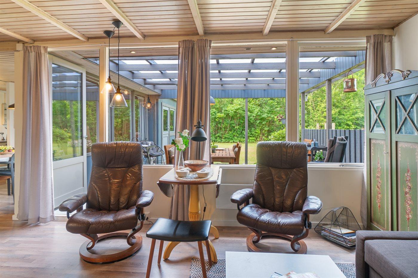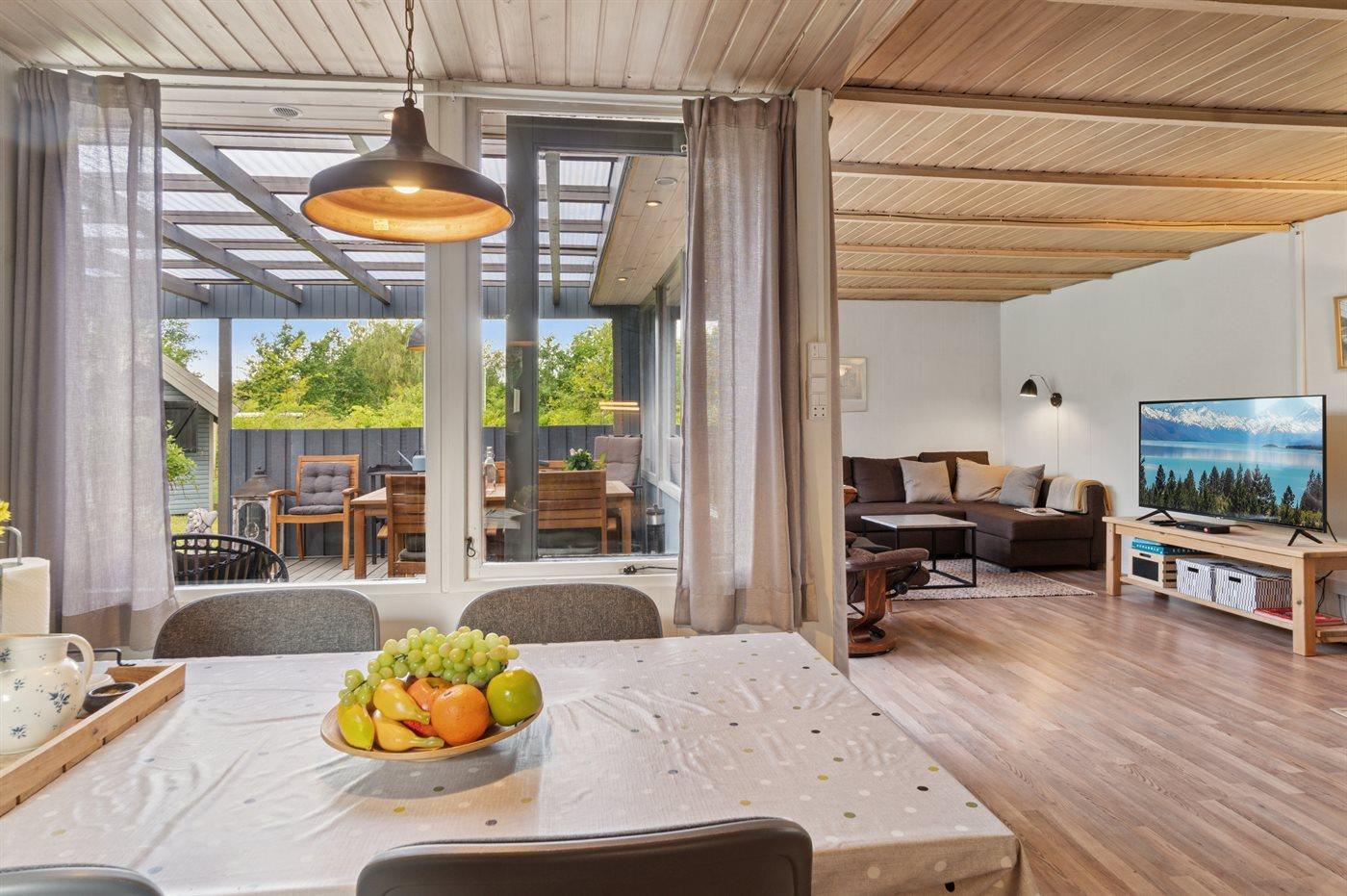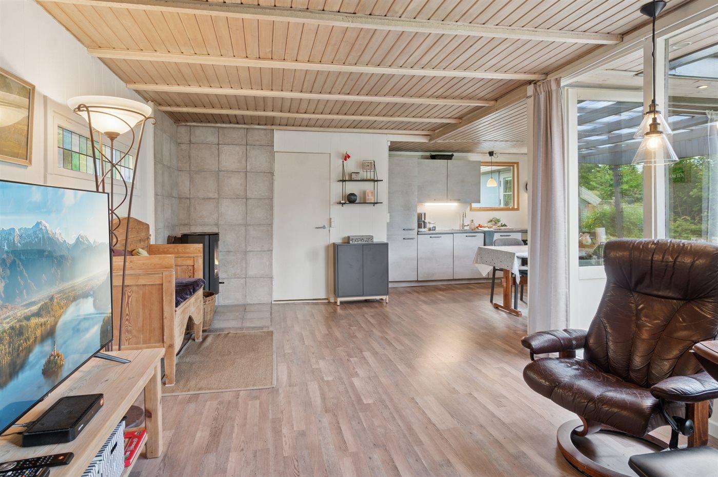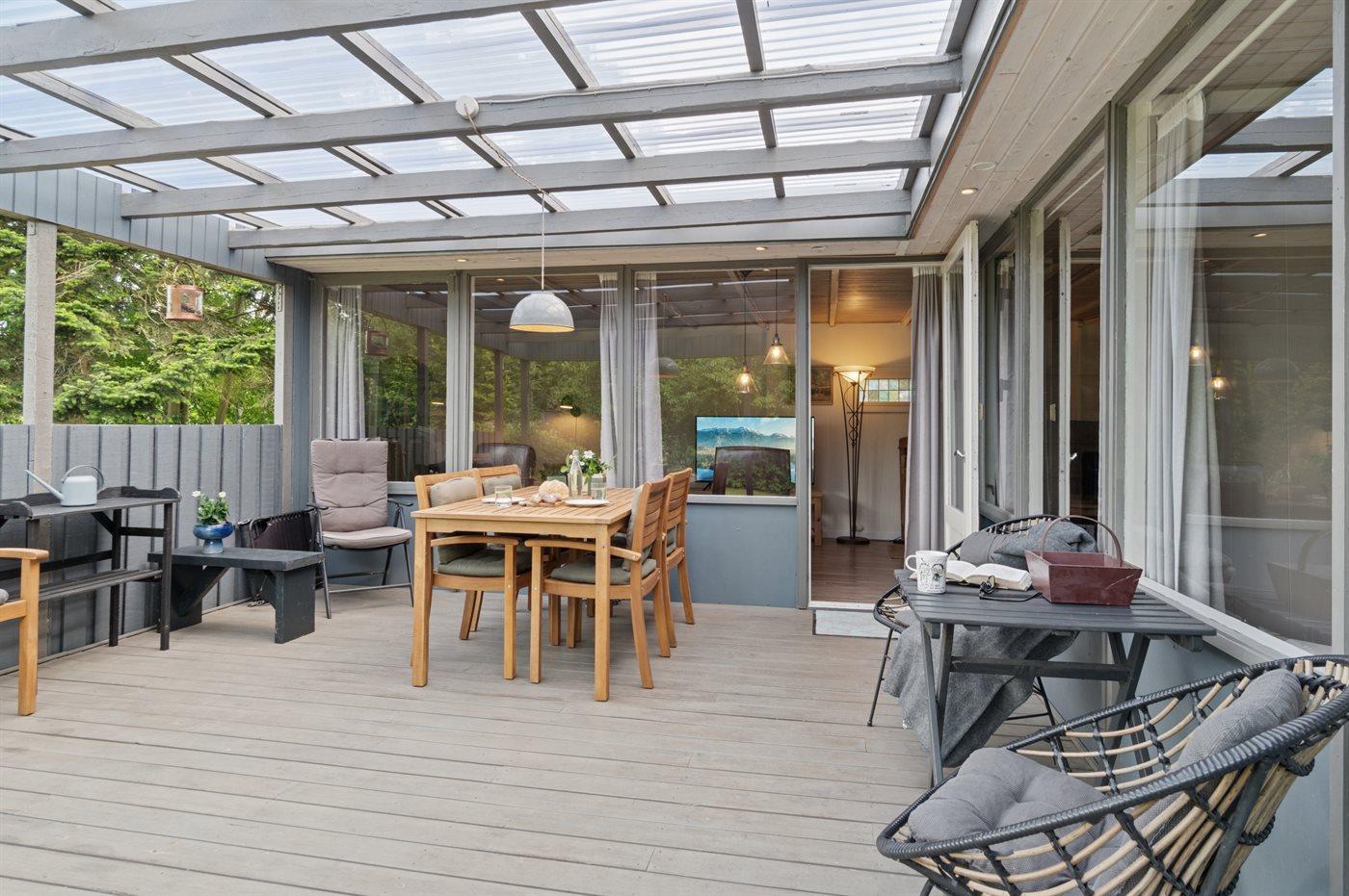 Huset indeholder et dejligt køkkenalrum i åben forbindelse med stuen og, herfra er der udgang til en stor overdækket terrasse, hvor der er god mulighed for at finde skygge og læ og nyde de lange sommeraftener.