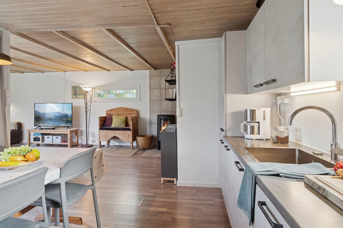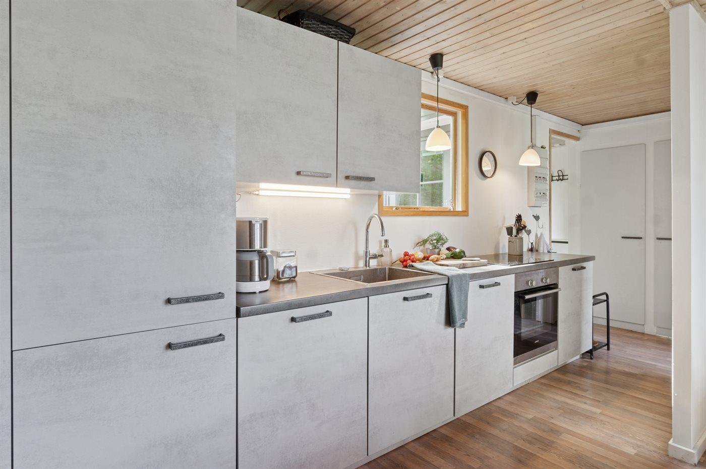 Køkkenet er udstyret med 1 køleskab. Der er 4 keramiske kogeplader, varmluftovn, mikrobølgeovn samt opvaskemaskine.