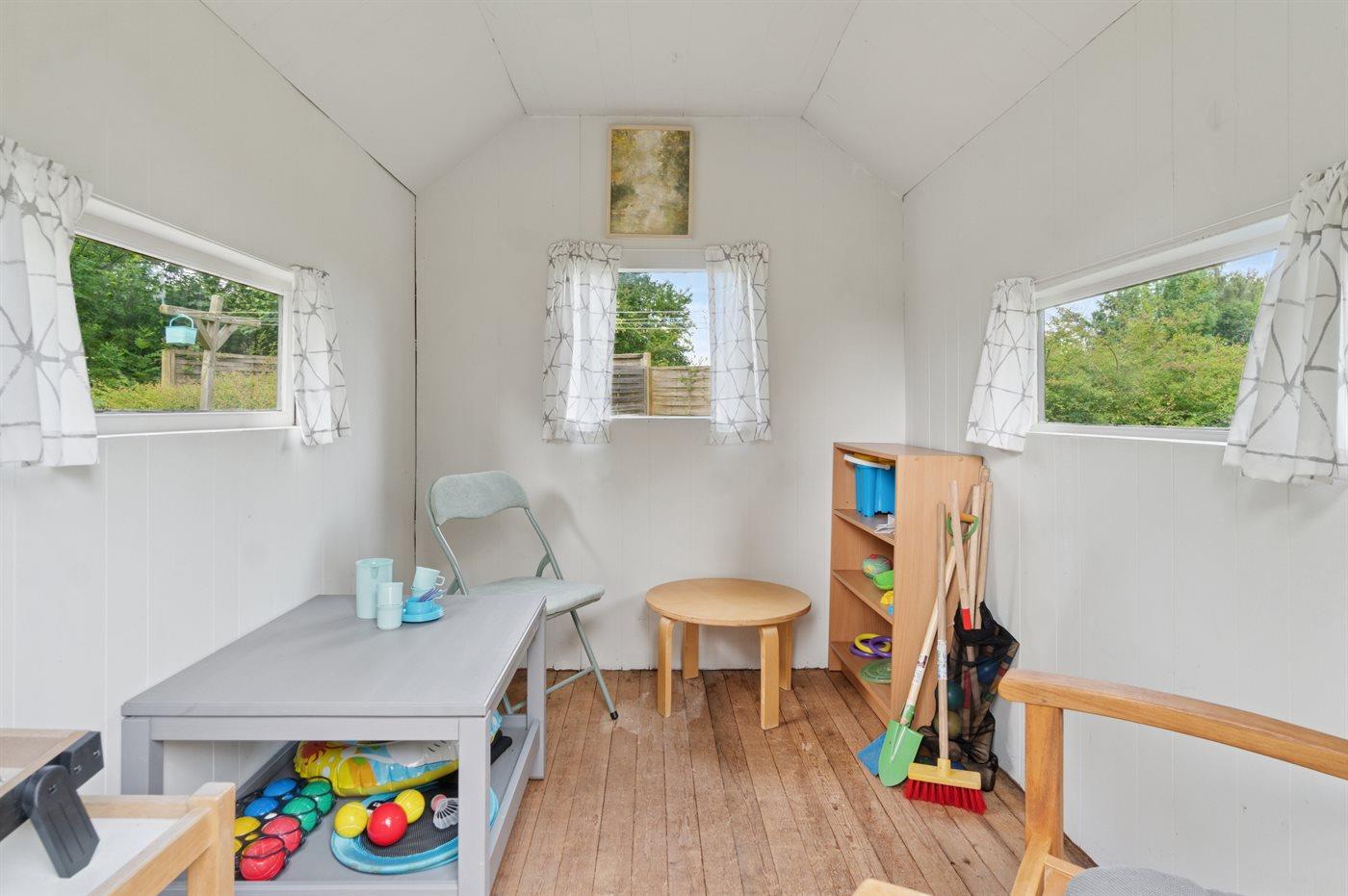 Rundt om huset er der rig mulighed for leg og boldspil på den store grund. Der er legehus og bålsted.