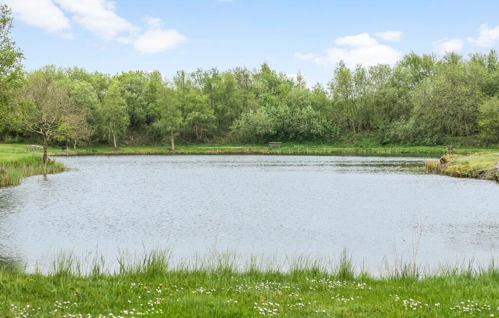 Moderne sommerhus ved fiskesø i hyggelig landsby nær Ringkøbing Fjord med terrasse og smuk udsigt.