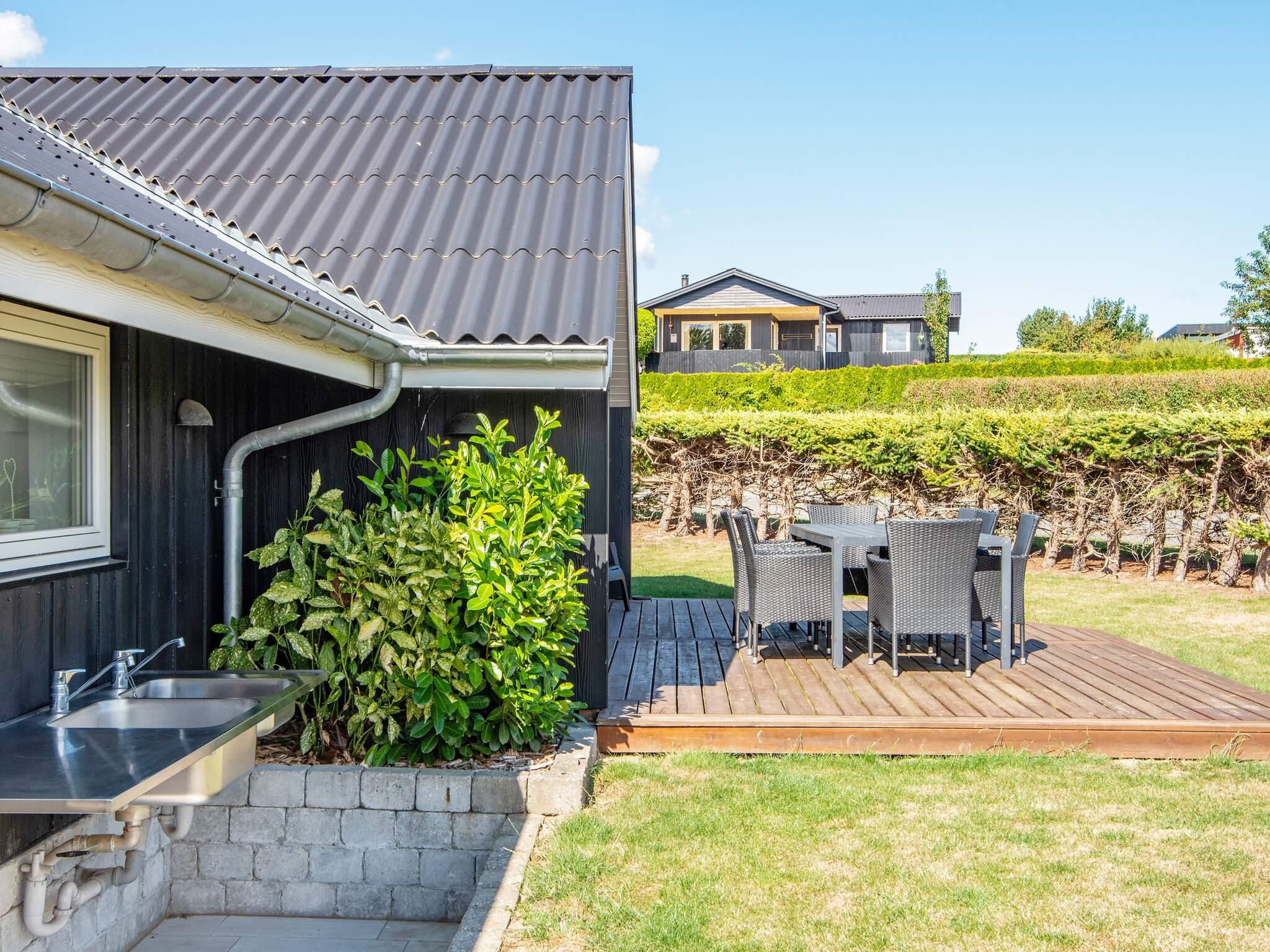 Udenfor finder du flere store terrasser med masser af havemøbler, herunder 4 liggestole, legeredskaber til børnene og en udendørs bruser med koldt og varmt vand. Der er også udekøkken og både gas- og kulgrill. Der er i alt ca. 80 m2 terrasse, heraf ca. 12 m2 er overdækket. Efter en fisketur kan du klargøre din fangst på fiskerensestationen udenfor.