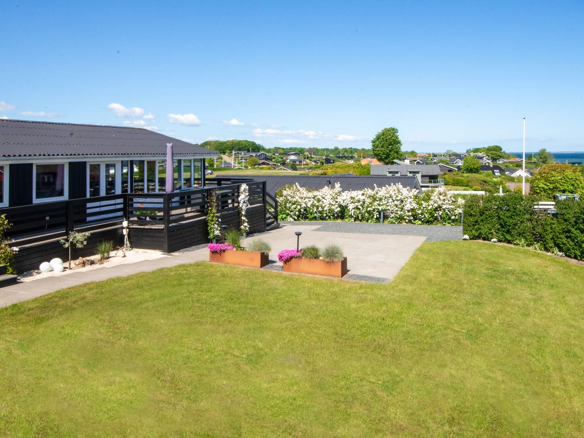 Udenfor finder du de store træterrasser, hvor du kan nyde solen og udsigten hele dagen. Træterrassen strækker sig hele vejen rundt om huset. Der er flere sæt havemøbler, og på terrassen mod vest er huset udstyret med en elektrisk markise og mod øst med en stor parasol. Den store plads på terrassen betyder, at der er plads til alle aktiviteter såsom leg, grillmad og et køligt glas vin om aftenen. Huset ligger i kort afstand fra den børnevenlige strand og Hejlsminde Havn. Ikke tilgængeligt for håndværkere og ungdomsgrupper.