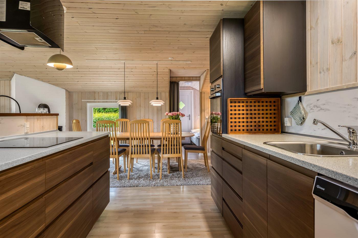 Køkkenet er udstyret med 1 køleskab. Der er 4 keramiske kogeplader, varmluftovn, mikrobølgeovn samt opvaskemaskine.