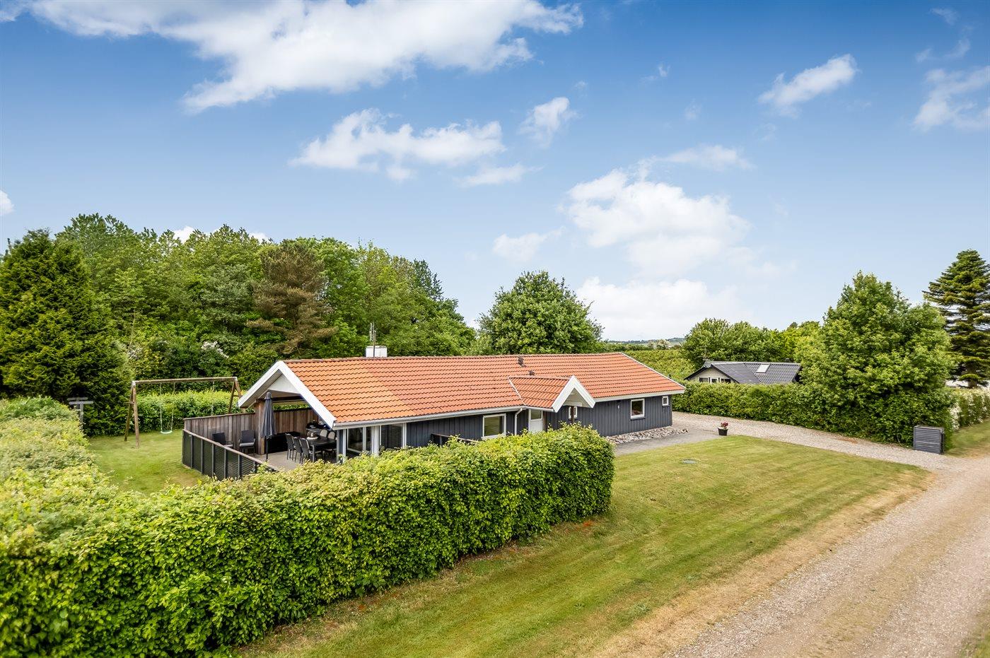 Ferieboligen er beliggende på en 850 m² stor havegrund. Der er 850 m til havet. Nærmeste forretning er beliggende i en afstand af 2500 m. Til ferieboligen hører åbent terrasseareal. Desuden er der overdækket terrasse. Der er redskabsrum. Gynge. Sandkasse. Legehus. Grill til rådighed. Der er carport til rådighed. Der er installeret stik til opladning af elbil. Type 2 stik. Med 11 kW ladeeffekt. Parkering ved ferieboligen.