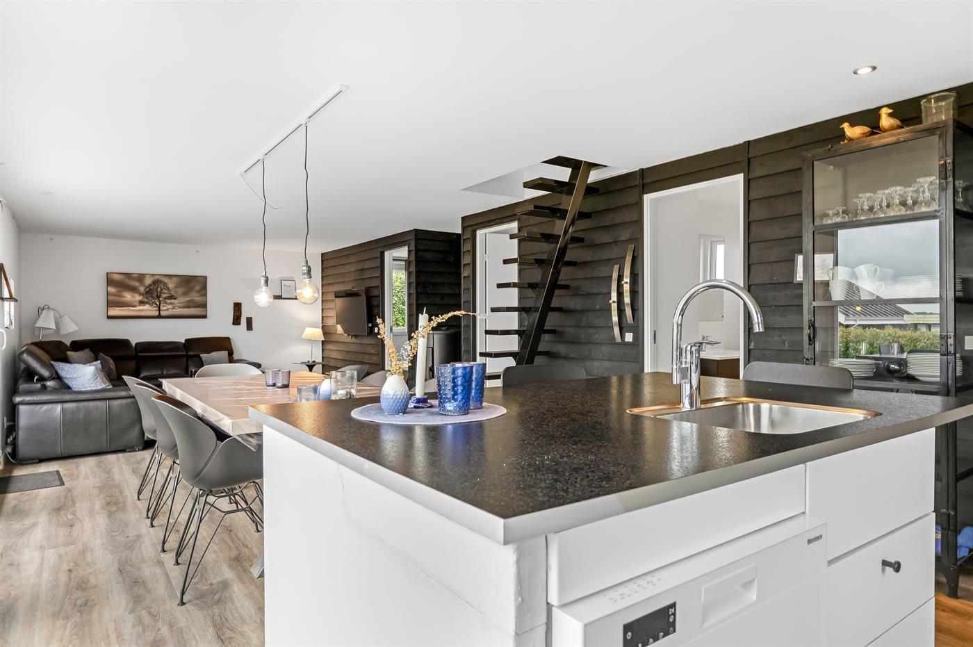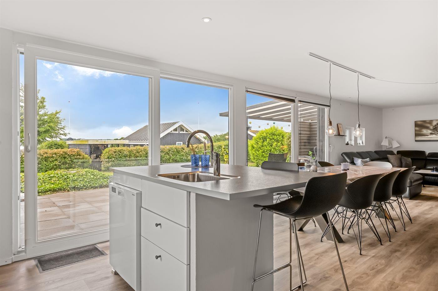 Husets hjerte er det store og lyse køkken-alrum, hvor de brede vinduespartier lukker lyset ind og skaber en åben fornemmelse. Gennem de store skydedøre træder I direkte ud på den store terrasse, hvilket giver en skøn følelse af, at inde- og udeliv smelter sammen.