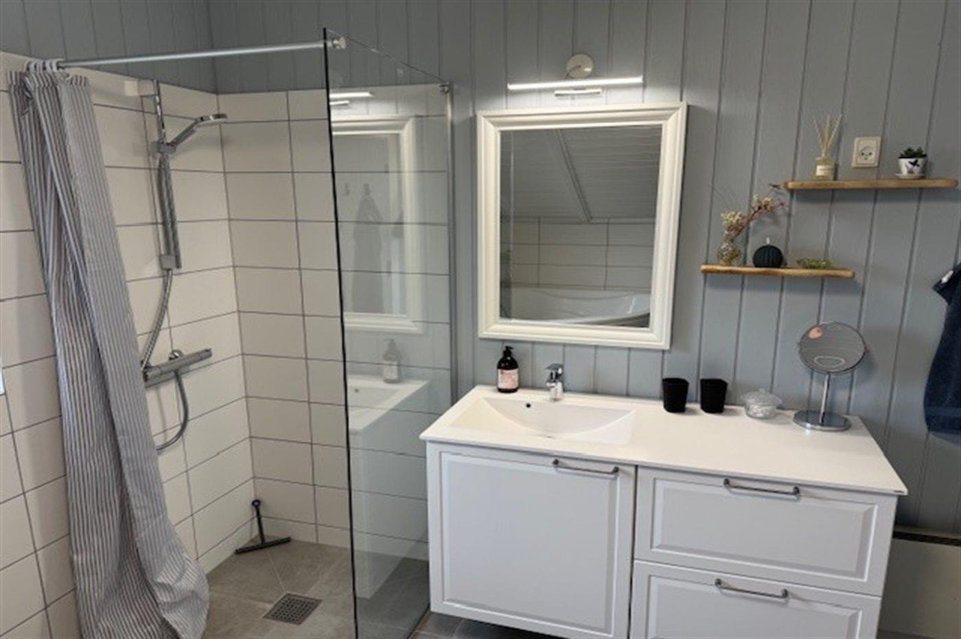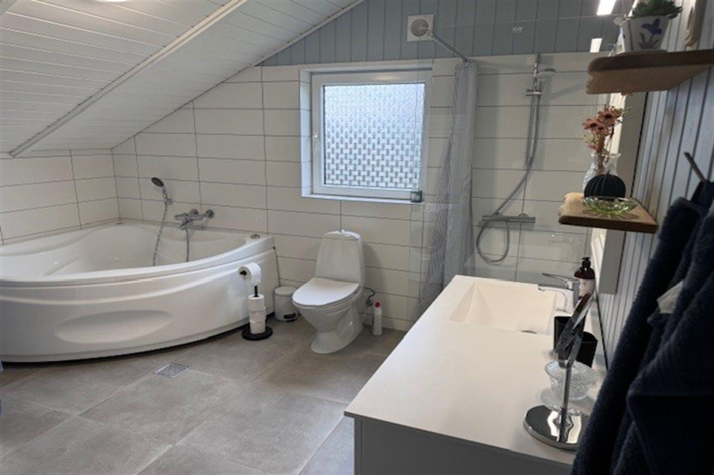 Der er 1 badeværelse med bruseniche og 2 toiletter, heraf 1 gæstetoilet. Der er gulvvarme på 1 badeværelse. Der er gulvvarme på gæstetoilettet. I saunaen er der mulighed for afslapning.