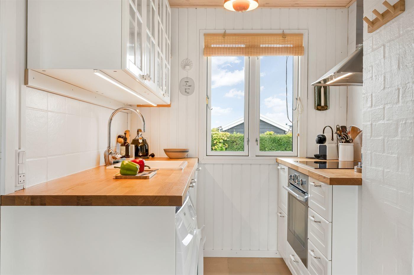 Køkkenet er udstyret med 1 køleskab. Der er 4 induktionskogeplader, varmluftovn, mikrobølgeovn samt opvaskemaskine Der er gulvvarme i køkkenet.