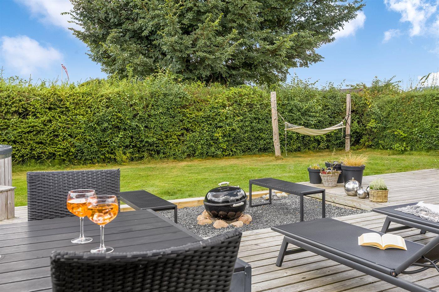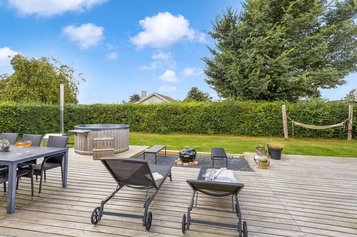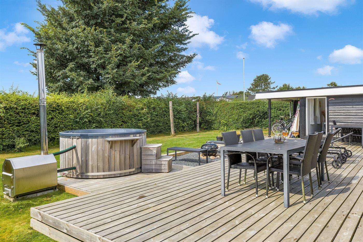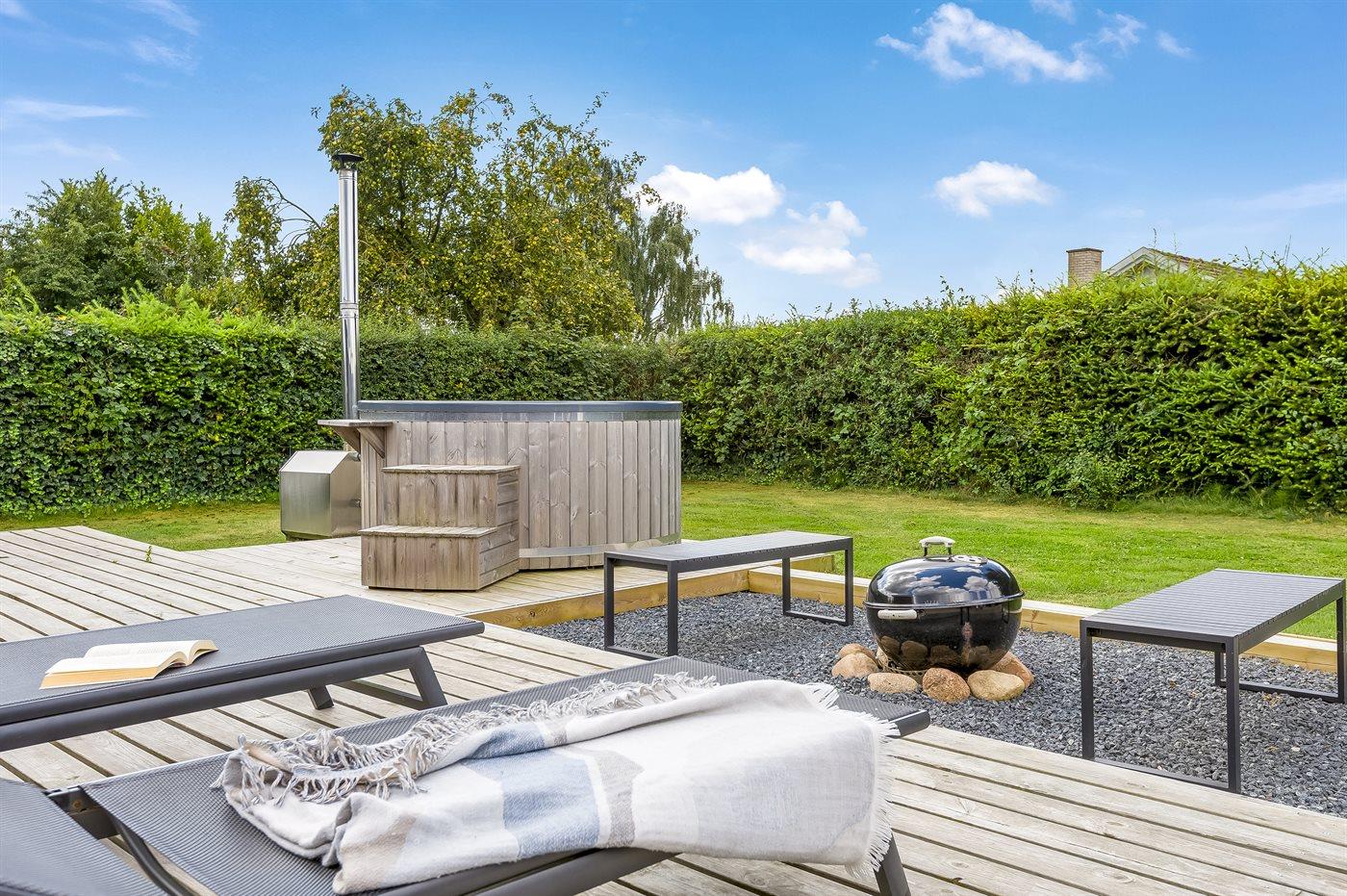 Udelivet er særligt skønt med en lukket og ugeneret have, en stor sydvendt træterrasse med kul- og gasgrill, loungemøbler og flere havestole. På den store græsplæne er der bålplads, mulighed for boldspil og leg eller afslapning i en af hængekøjerne. Et af husets højdepunkter er vildmarksbadet, hvor I kan nyde et varmt bad under stjernerne.
