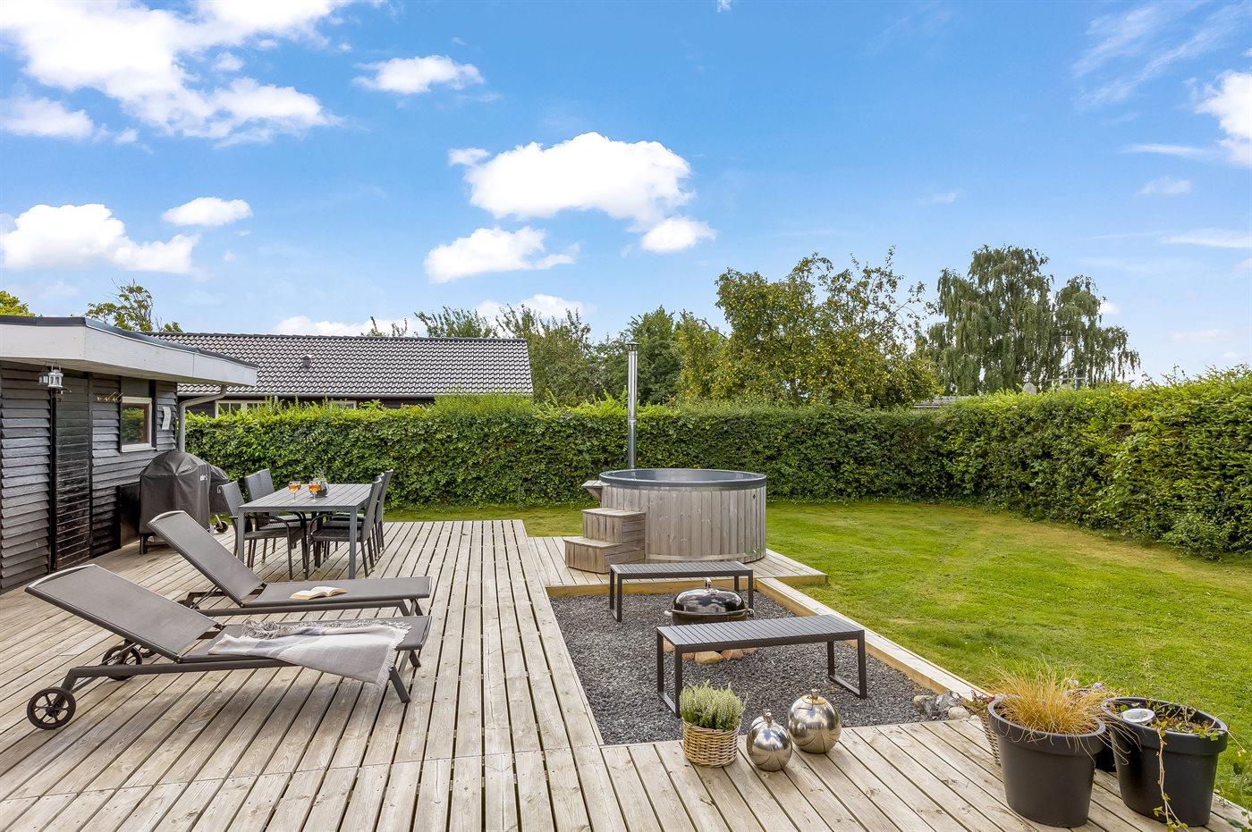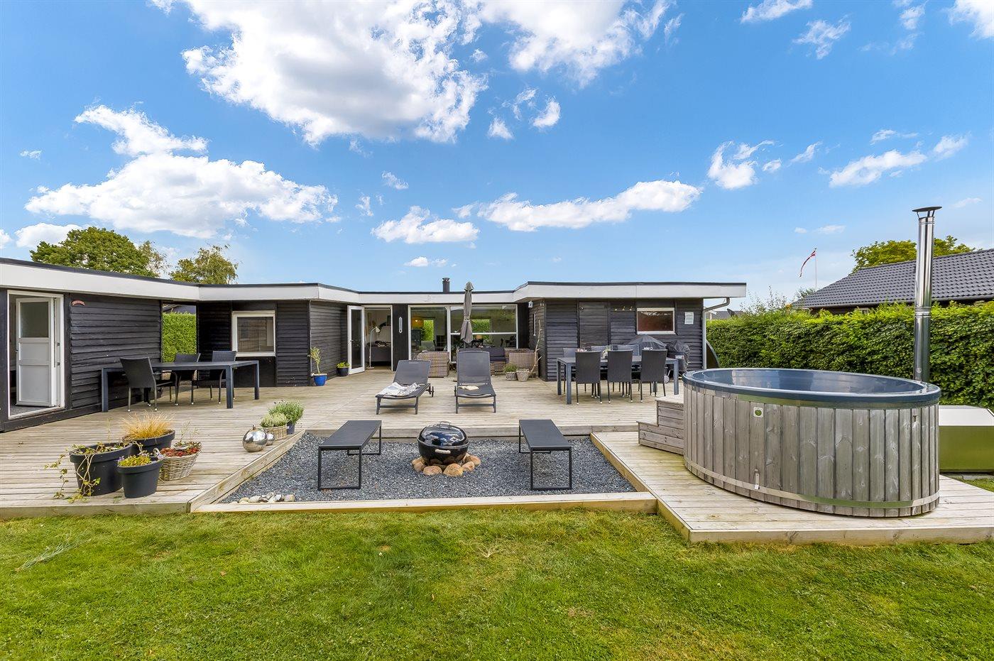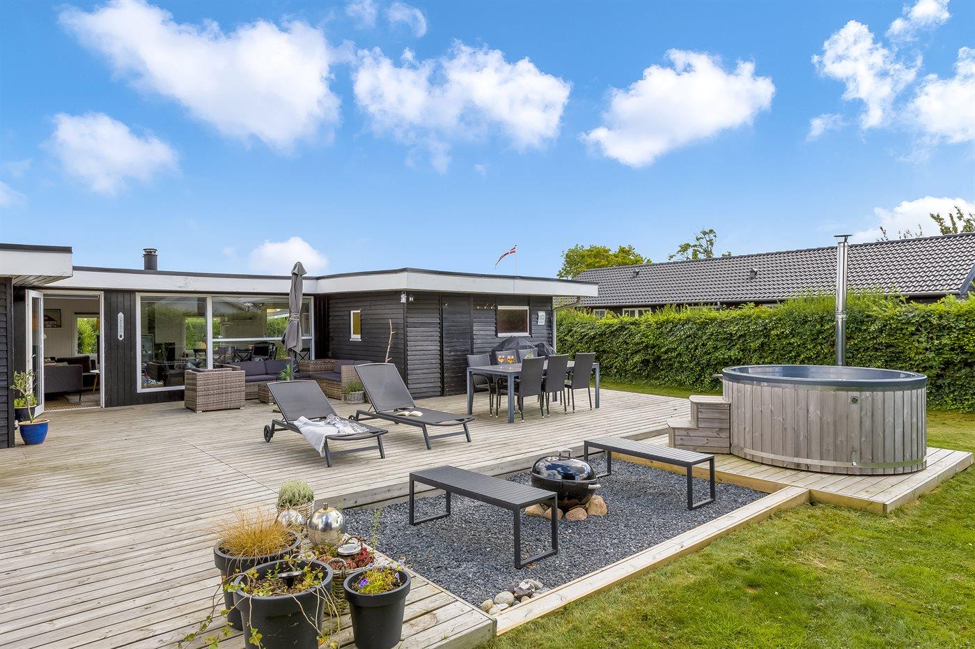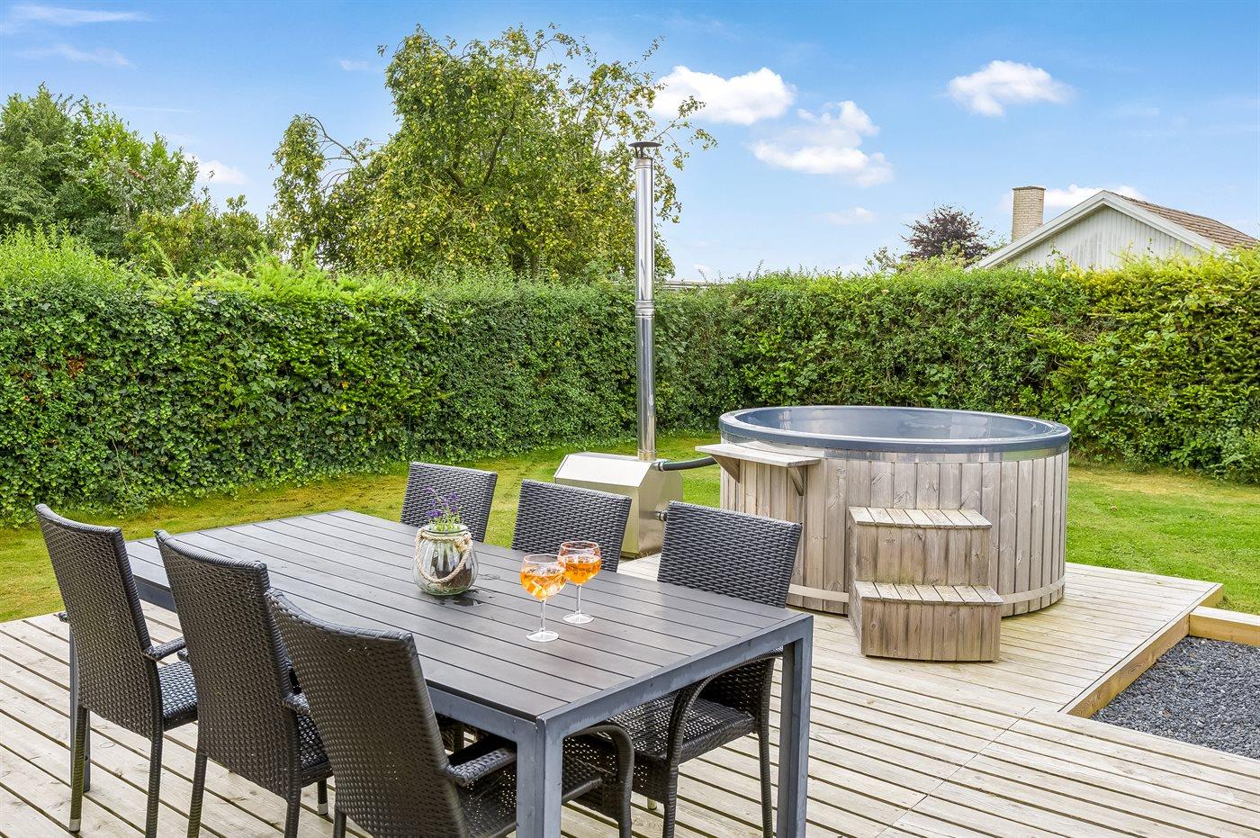 Udelivet er særligt skønt med en lukket og ugeneret have, en stor sydvendt træterrasse med kul- og gasgrill, loungemøbler og flere havestole. På den store græsplæne er der bålplads, mulighed for boldspil og leg eller afslapning i en af hængekøjerne. Et af husets højdepunkter er vildmarksbadet, hvor I kan nyde et varmt bad under stjernerne.