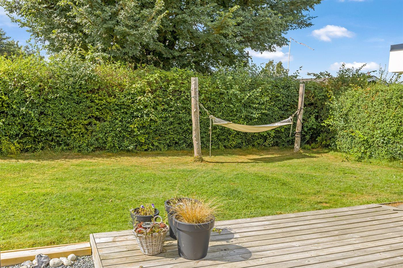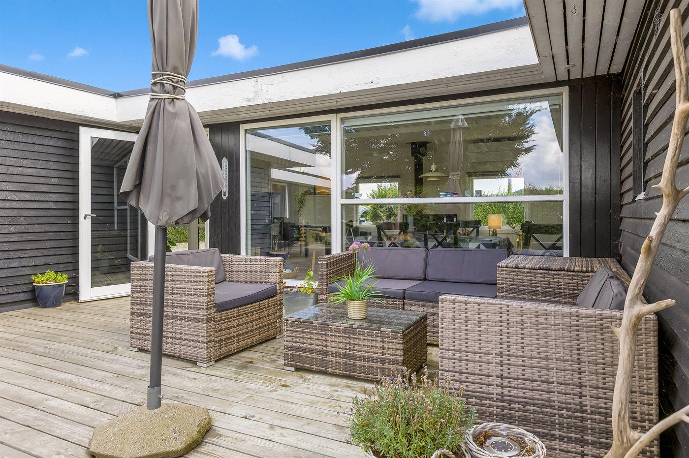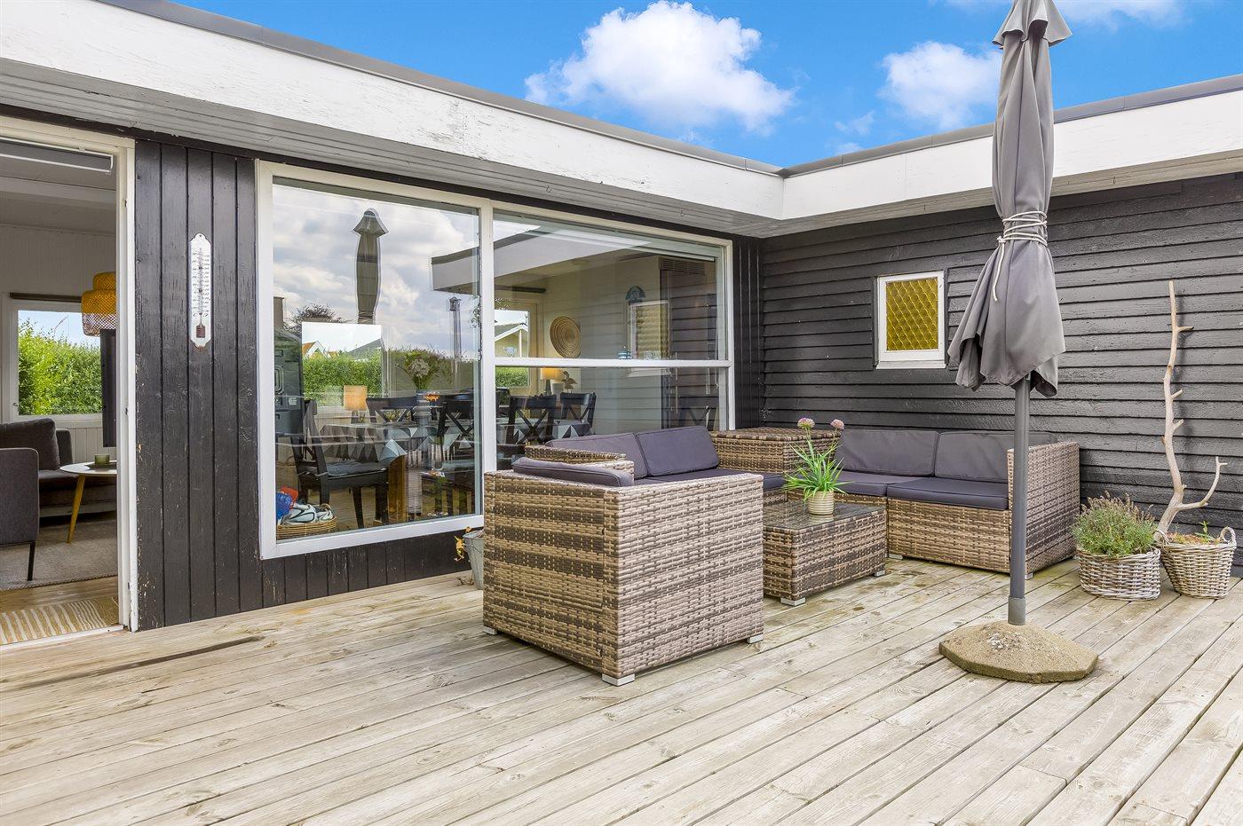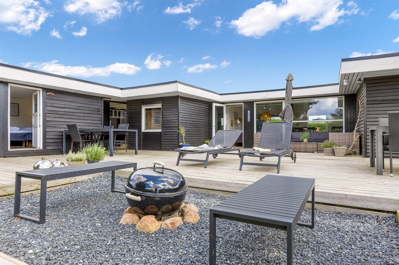 Udelivet er særligt skønt med en lukket og ugeneret have, en stor sydvendt træterrasse med kul- og gasgrill, loungemøbler og flere havestole. På den store græsplæne er der bålplads, mulighed for boldspil og leg eller afslapning i en af hængekøjerne. Et af husets højdepunkter er vildmarksbadet, hvor I kan nyde et varmt bad under stjernerne.