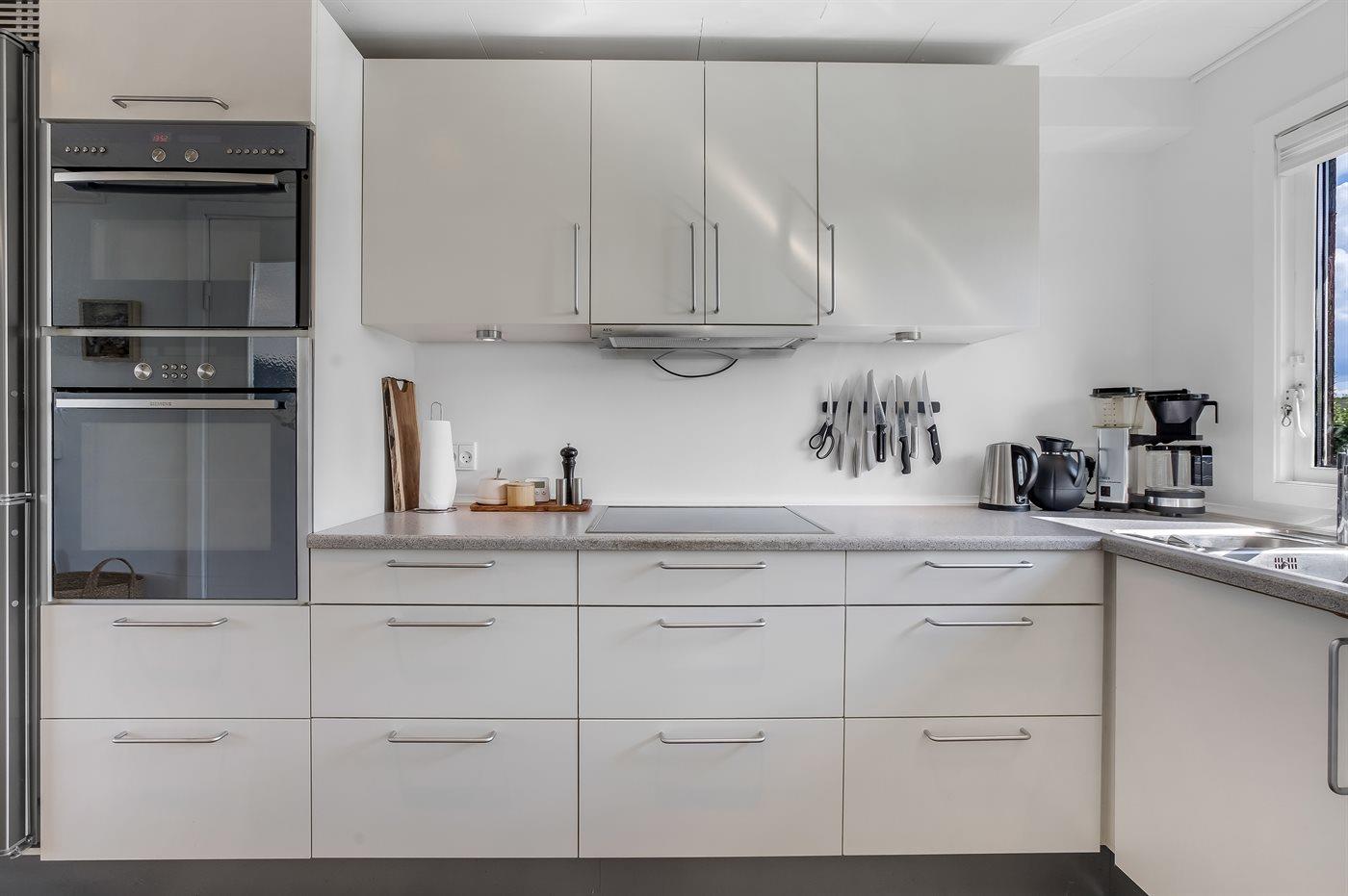 Køkkenet er udstyret med 1 køleskab. Der er 4 keramiske kogeplader, varmluftovn, mikrobølgeovn samt opvaskemaskine.