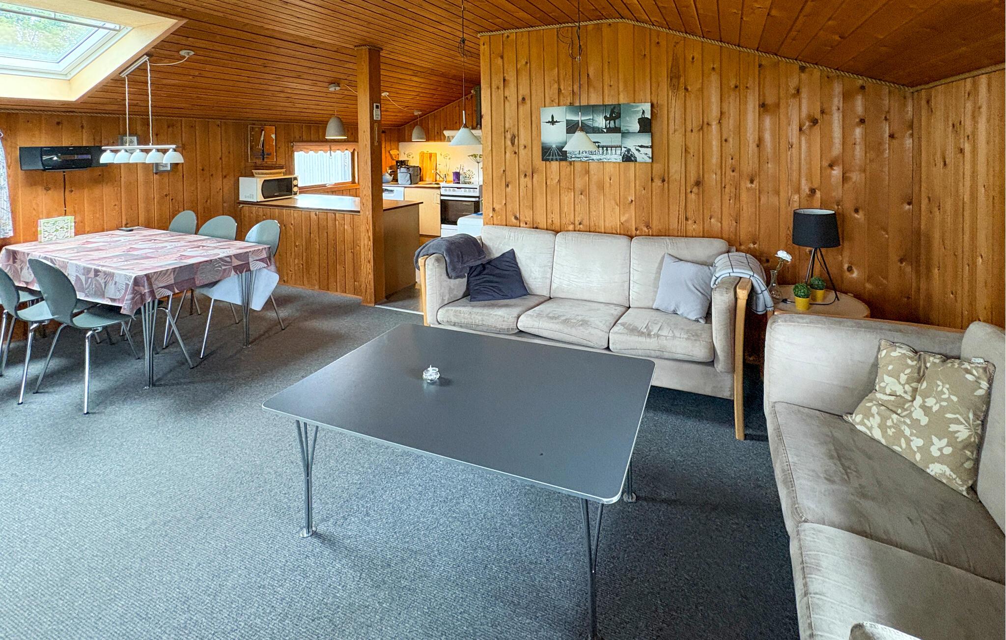 Den hyggeligt indrettede stue med træbeklædte vægge skaber straks en behagelig atmosfære. Hyg jer sammen i sofaerne, nyd udsigten ud mod haven, eller varm jer ved brændeovnen, mens ilden knitrer. Det tilstødende køkken er funktionelt indrettet. Spis sammen ved det store bord, planlæg udflugter, eller afslut dagen med et brætspil. Efter en aktiv dag kan I slappe dejligt af i saunaen.