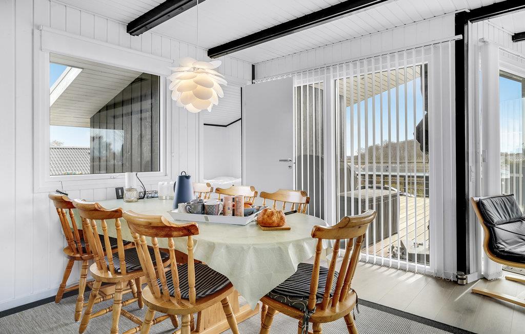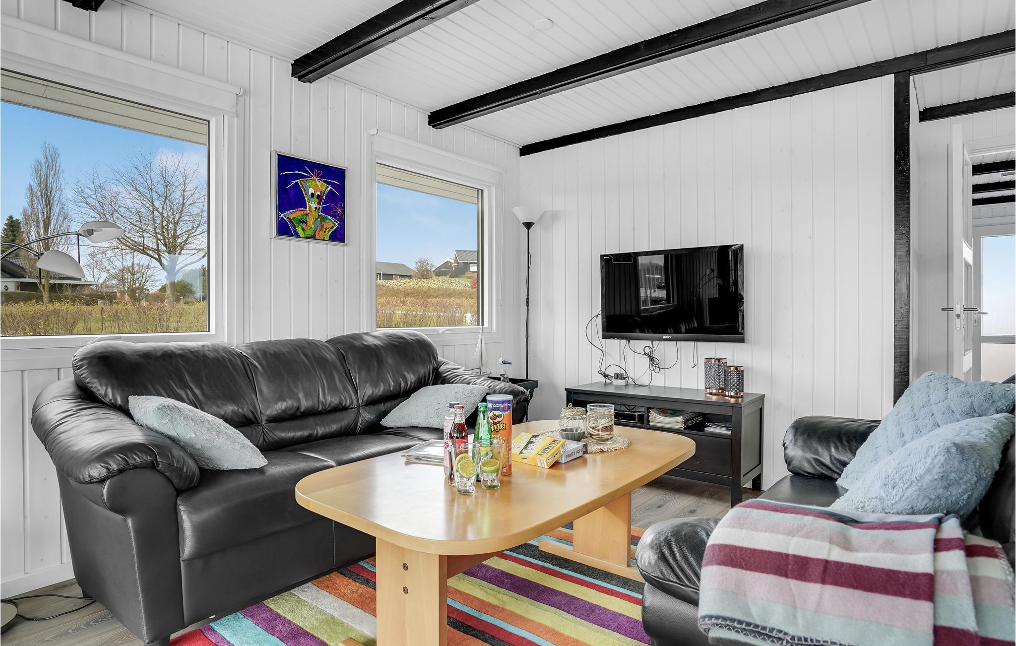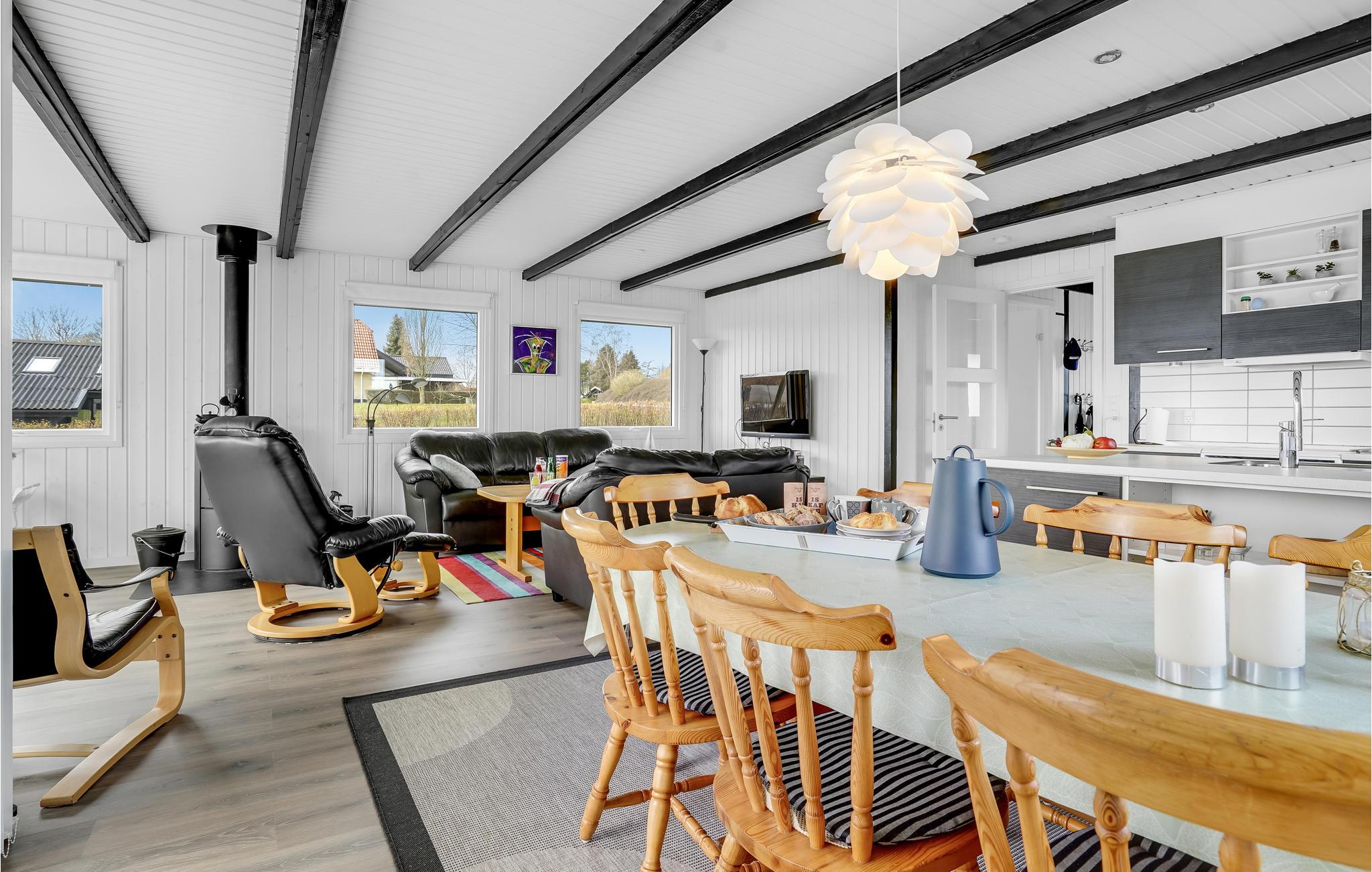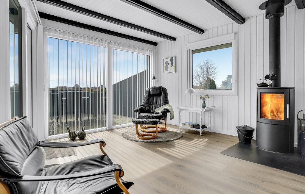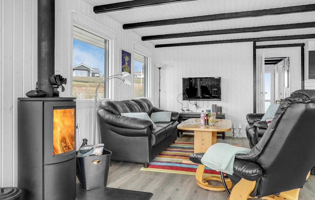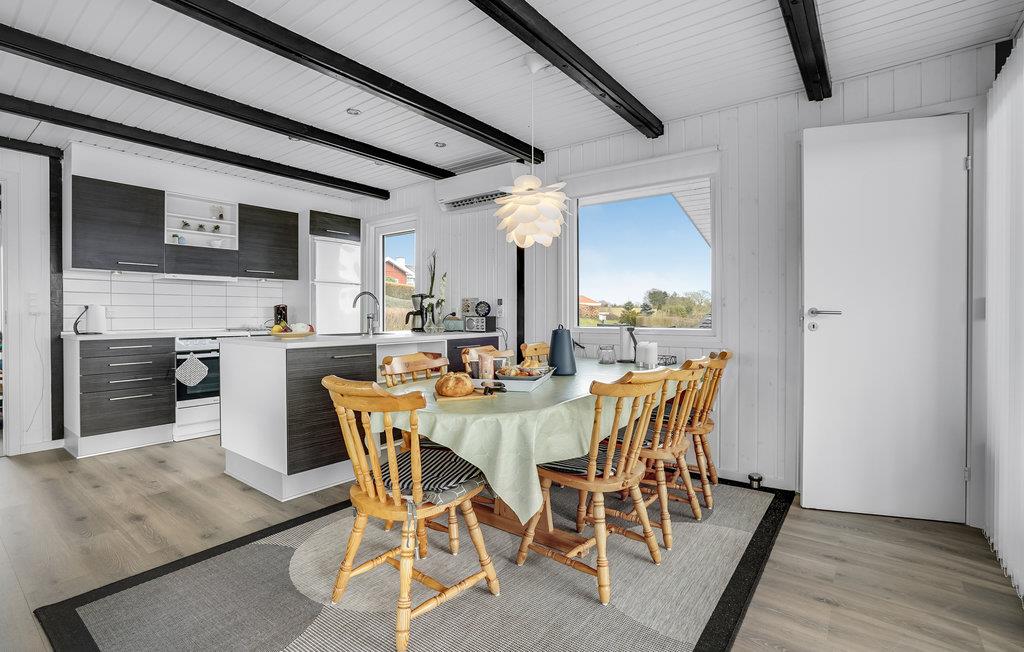 Glæd jer til et dekorativt og stilfuldt indrettet feriehus med store, lyse rum. Husets hjerte er den kombinerede spise- og opholdsstue med åbent køkken og synlige træbjælker i loftet, som skaber en hyggelig atmosfære. Her finder I spiseplads, brændeovn og et komfortabelt sofaarrangement med Smart-TV. Store vinduespartier giver et dejligt lysindfald og et godt udsyn til haven.