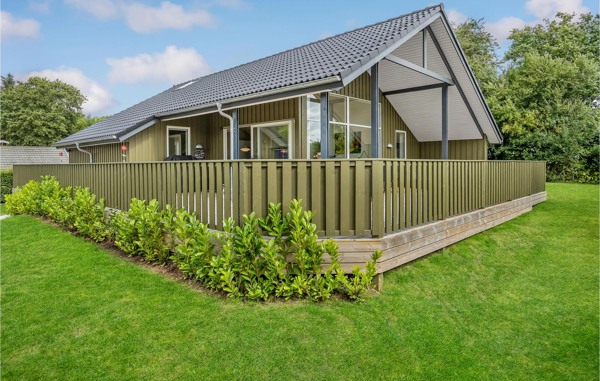 Lyst og komfortabelt feriehus med spabad og stor træterrasse.