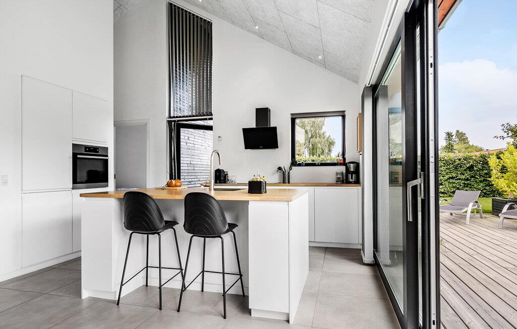 Dette sommerhus nær Hejlsminde Strand ved Lillebælt kombinerer lækre kvalitetsløsninger med en herlig beliggenhed. Her er der plads til en stor familie og optimale forhold til at slappe af. I kan se frem til en skøn åben planløsning, som forener køkken, spiseplads og hyggelig opholdsstue i et stort opholdsrum. Stilen er minimalistisk i varme mørk/lyse kontrastfarver, og faciliteterne er moderne. Vinduesfronterne lukker lyset ind i boligen sammen med den grønne udsigt, så I får de dejligste rammer til at sidde med dagens måltider eller en kop kaffe og en god bog.
