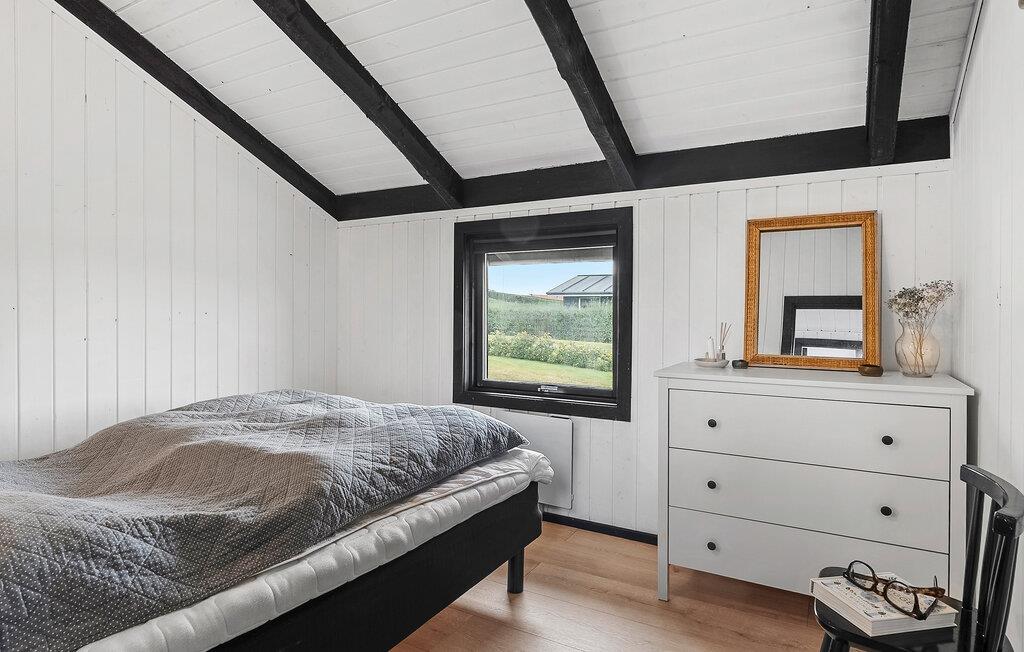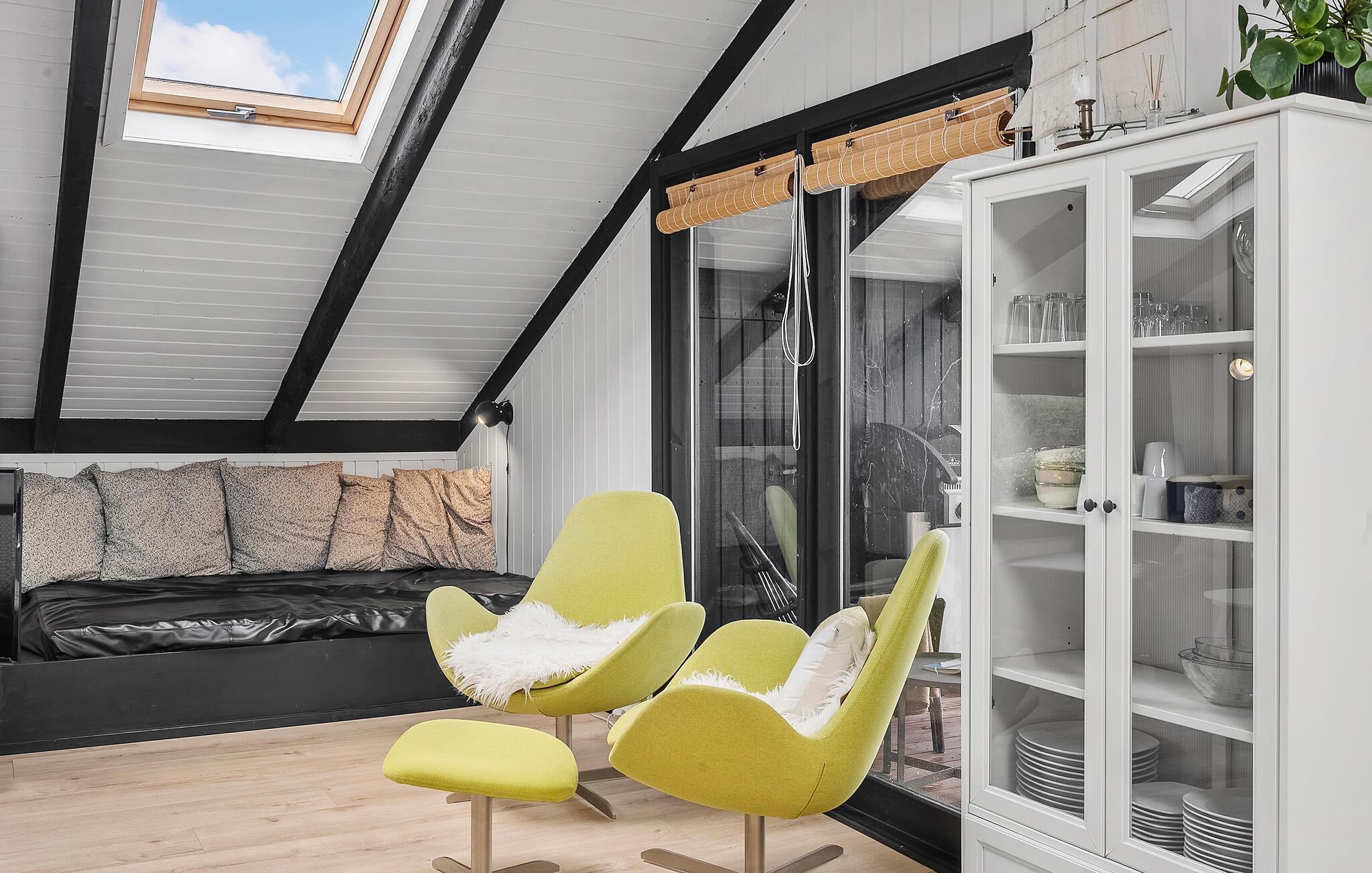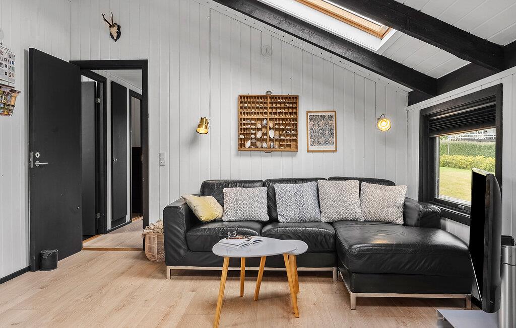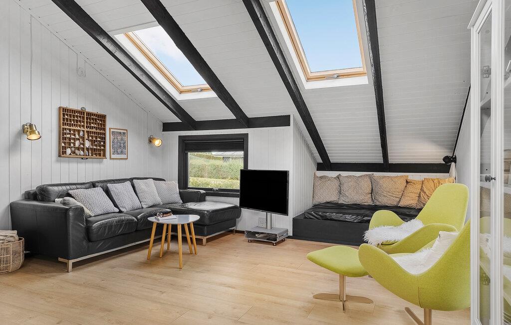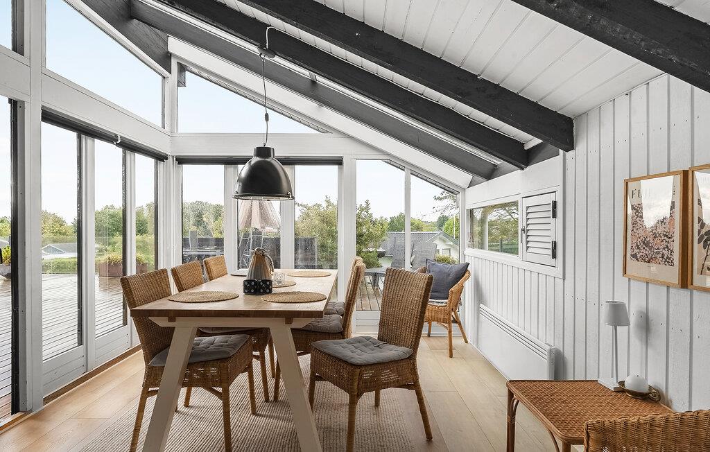 Glæd jer til en vellykket kombination af hyggelige indretningsløsninger og lyse rum i dette feriehus, der gør jeres ophold særligt behageligt. Den smukke opholdsstue byder jer velkommen med højt til loftet, store vinduer og komfortable sofaer. Slap af, mens I kigger gennem ovenlysvinduerne eller nyd filmaftener sammen. Brug det praktiske køkken til at tilberede lækre retter. Bagefter kan I spise i den lyse spisestue, som byder på masser af lys og smuk udsigt over området takket være store glaspartier.