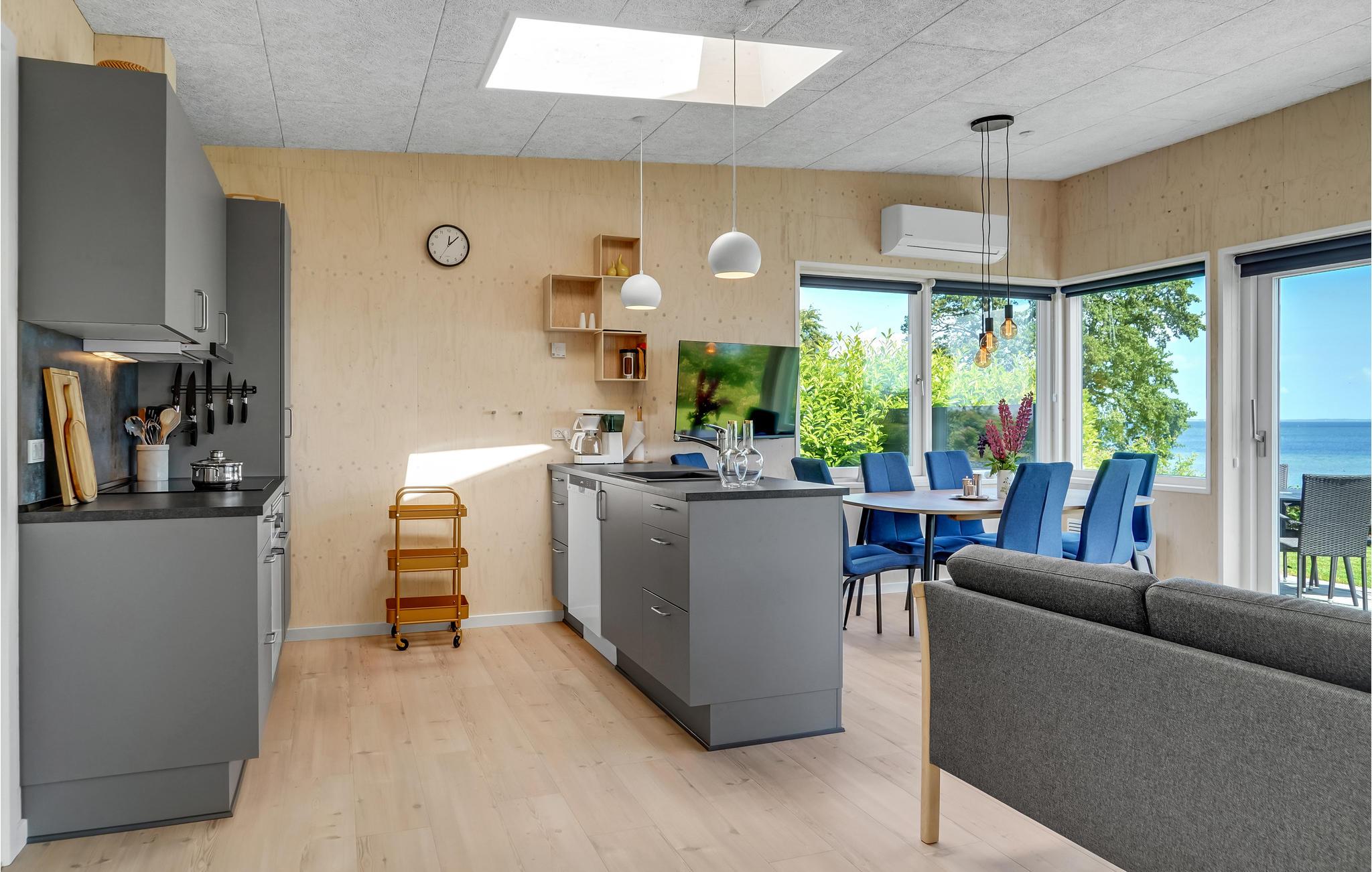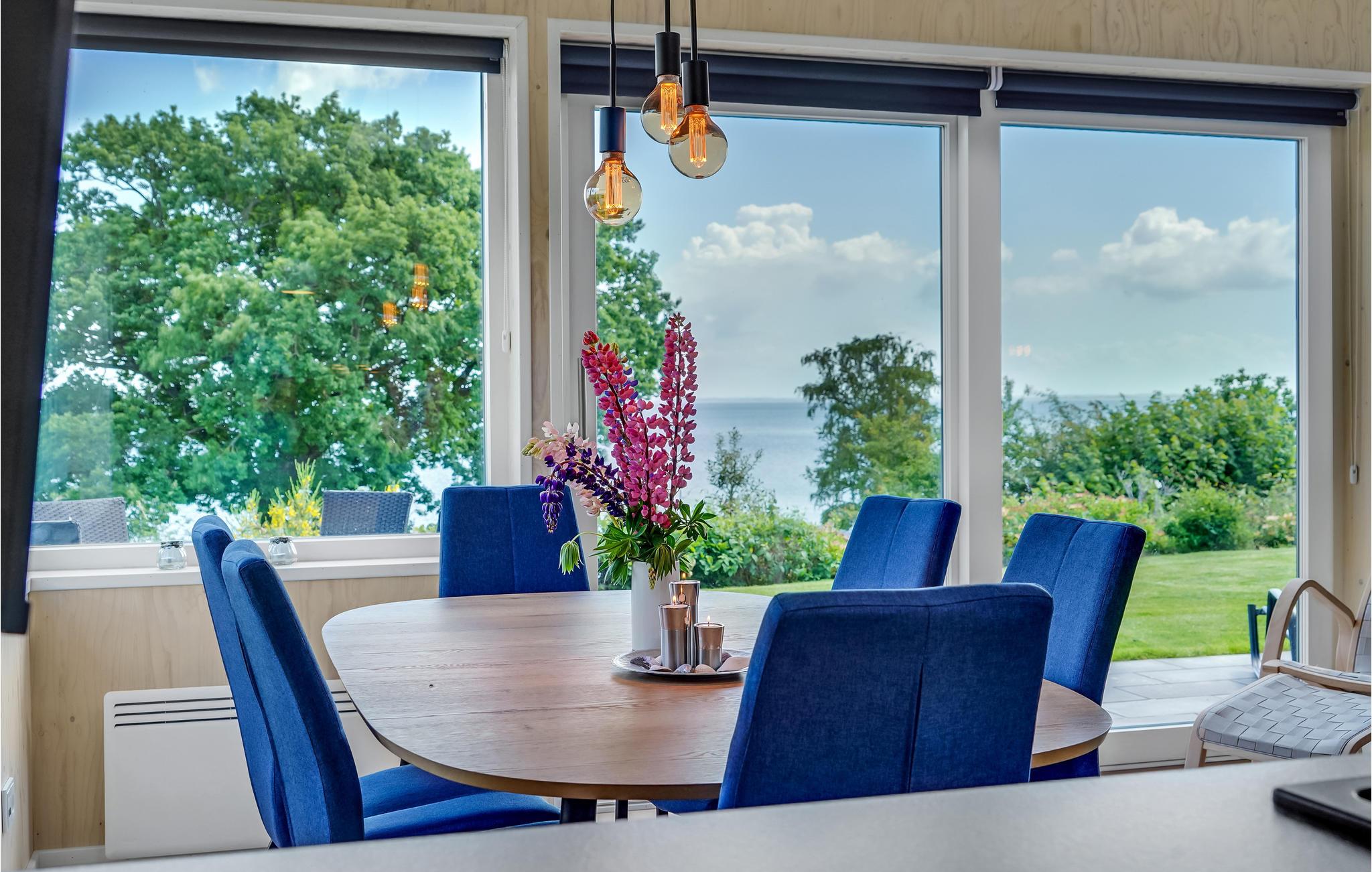 Tæt ved vandet og med panoramaudsigt til vandet fra terrassen og stuen ligger dette hyggelige sommerhus. Her kan I nyde ferien i skønne omgivelser med skov, dejlig natur og strand, ganske tæt ved huset. Kun 300 m fra huset ligger en indhegnet hjortepark, hvor I kan opleve de imponerende krondyr i deres frie natur. Mod betaling er der adgang til tropisk badeland kun 800 m fra huset.