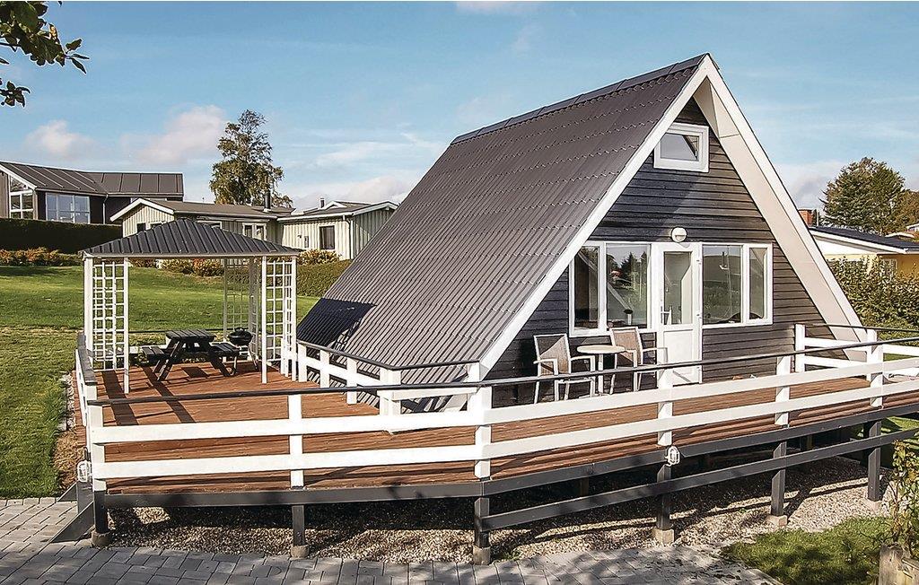 Charmerende træhus i Hejlsminde med stor terrasse tæt på børnevenlig strand og natur.