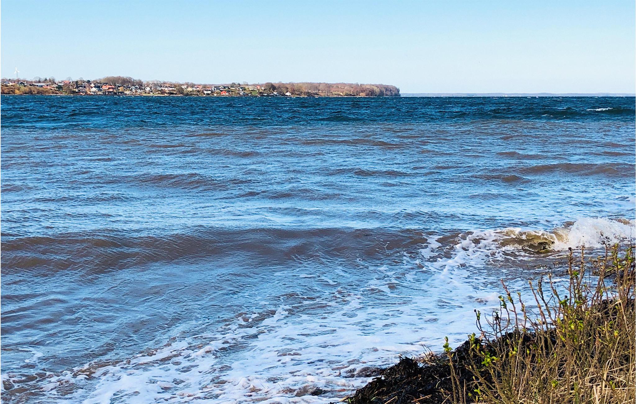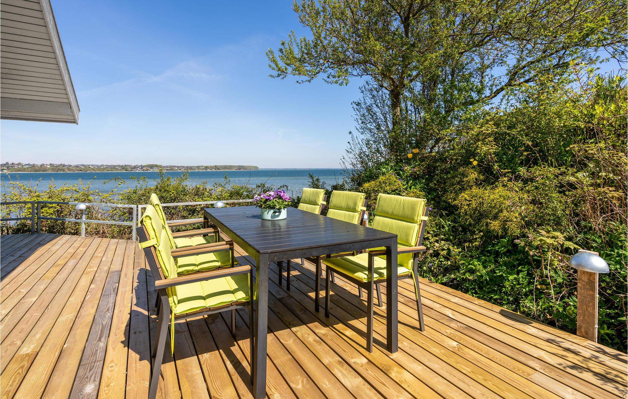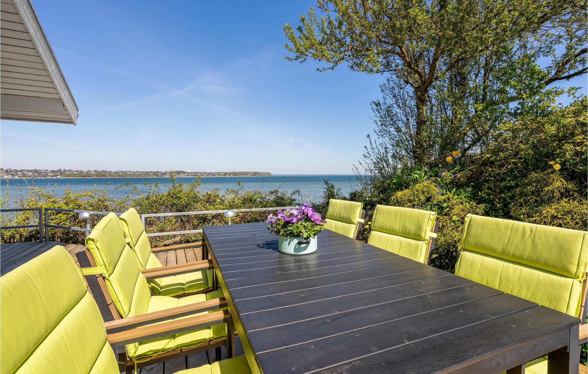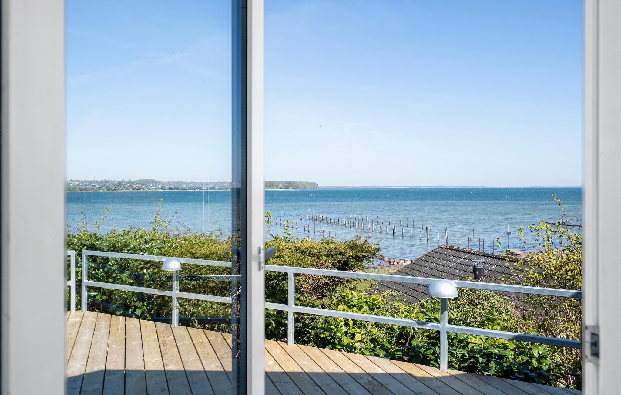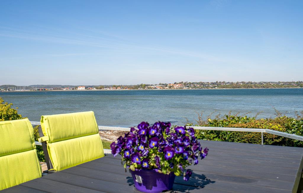 Feriehus ved Anslet Strand med panoramaudsigt over Hejlsminde bugten og stor terrasse med sol hele dagen.