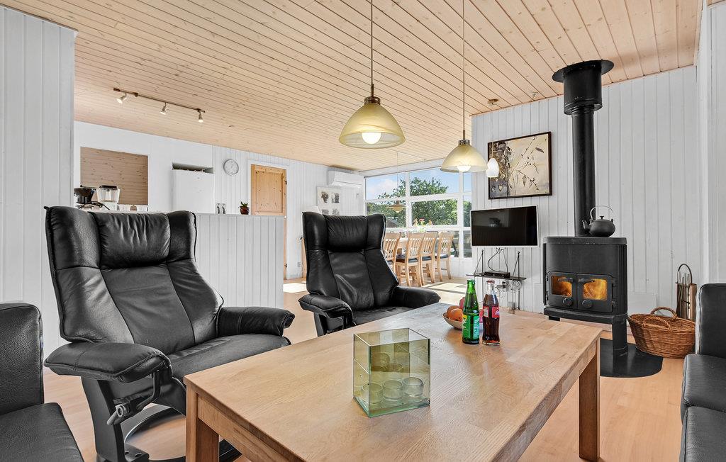 Det åbent indrettede opholdsrum byder jer velkommen med lyse trælofter, store vinduespartier og en venlig indretning. Tag plads i de komfortable lænestole, tænd op i brændeovnen på køligere aftener, og nyd rolige stunder med udsigt til haven. Benyt det rummelige spisebord til fælles måltider eller hyggelige spilleaftener. Tilbered jeres måltider i køkkenet, som ligger i direkte forbindelse med opholdsrummet.