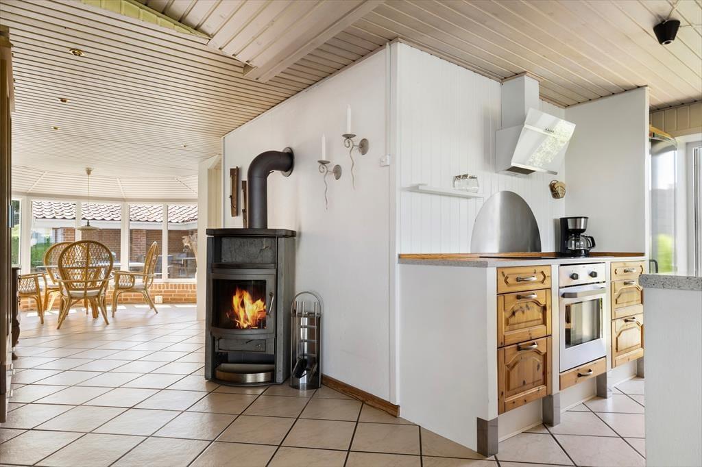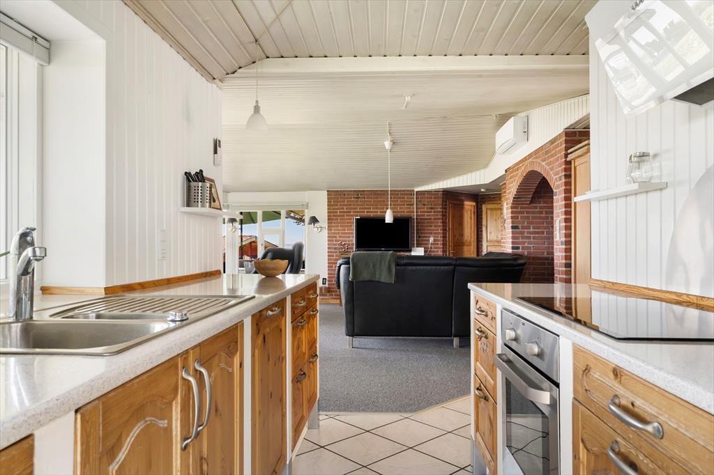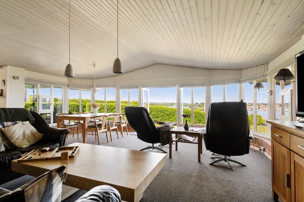 Når du træder ind i feriehuset, bliver du mødt af en varm og indbydende atmosfære, som straks får dig til at føle dig hjemme. Det rummelige opholdsrum udgør husets hjerte med en åben planløsning, der kombinerer køkken, spiseplads og stue. Her kan man samles om spisebordet til fælles måltider og hyggelige samtaler, mens brændeovnen knitrer blidt i baggrunden. De store vinduer lader dagslyset strømme ind og giver en betagende udsigt over bugten. Varmepumpen sikrer et behageligt indeklima året rundt, og de 3 soveværelser giver både privatliv og plads til at slappe af efter en dag fuld af oplevelser.