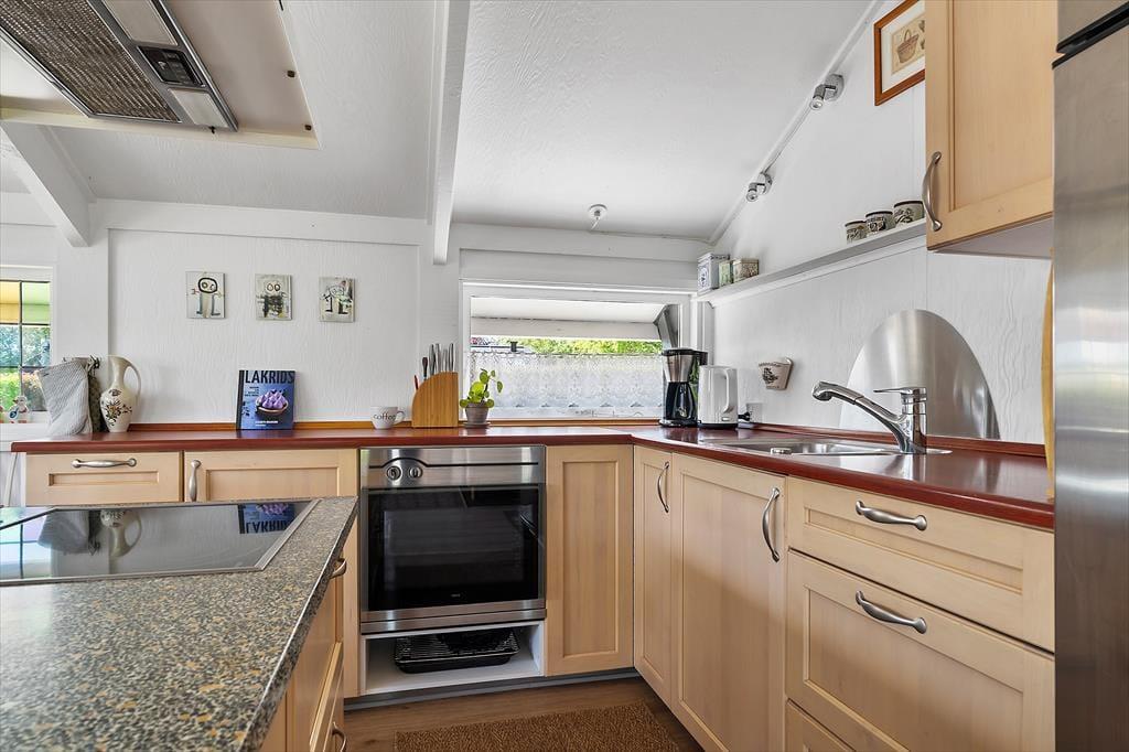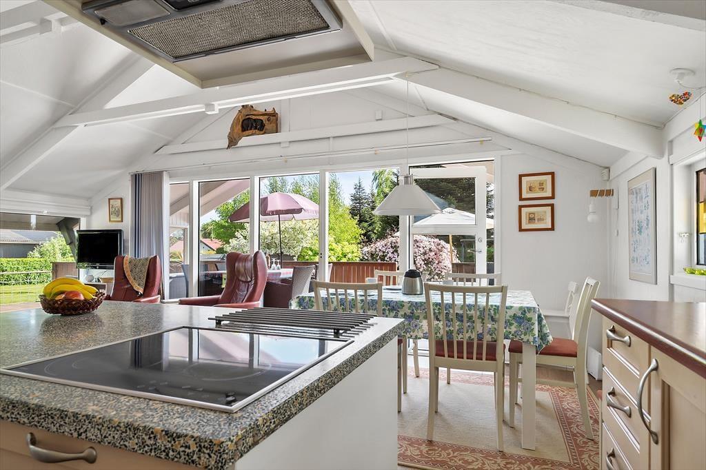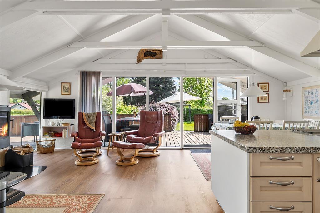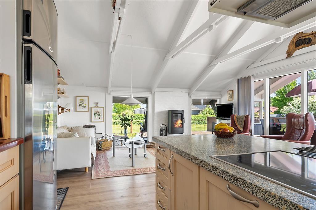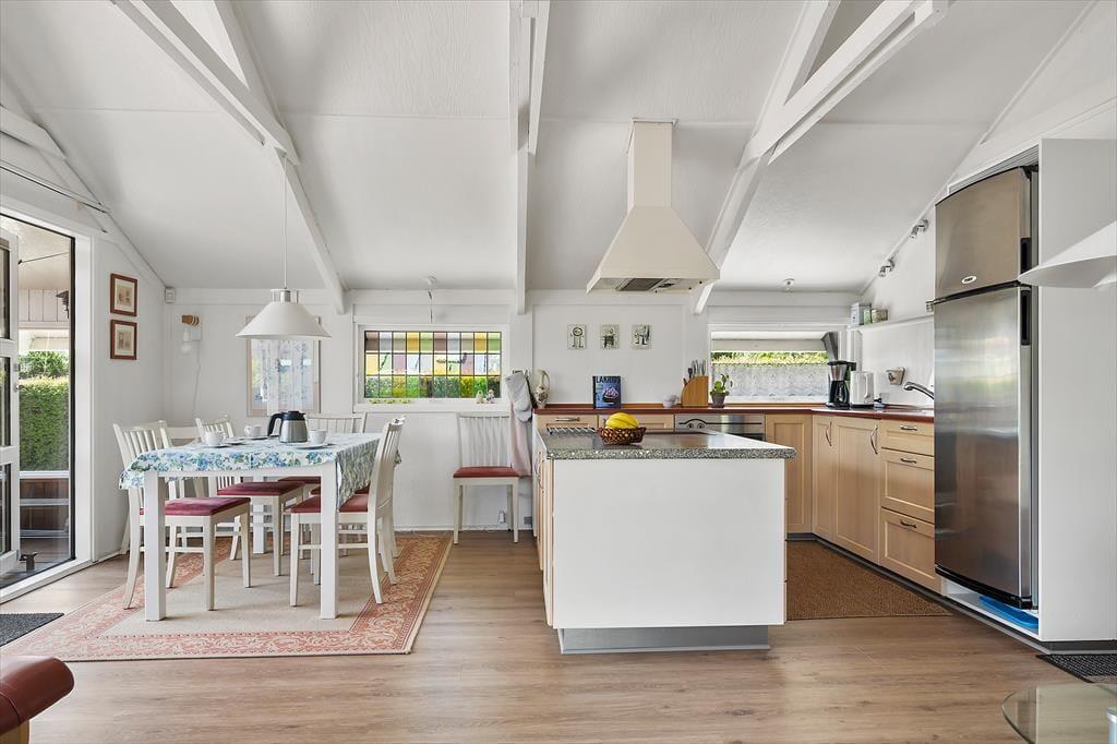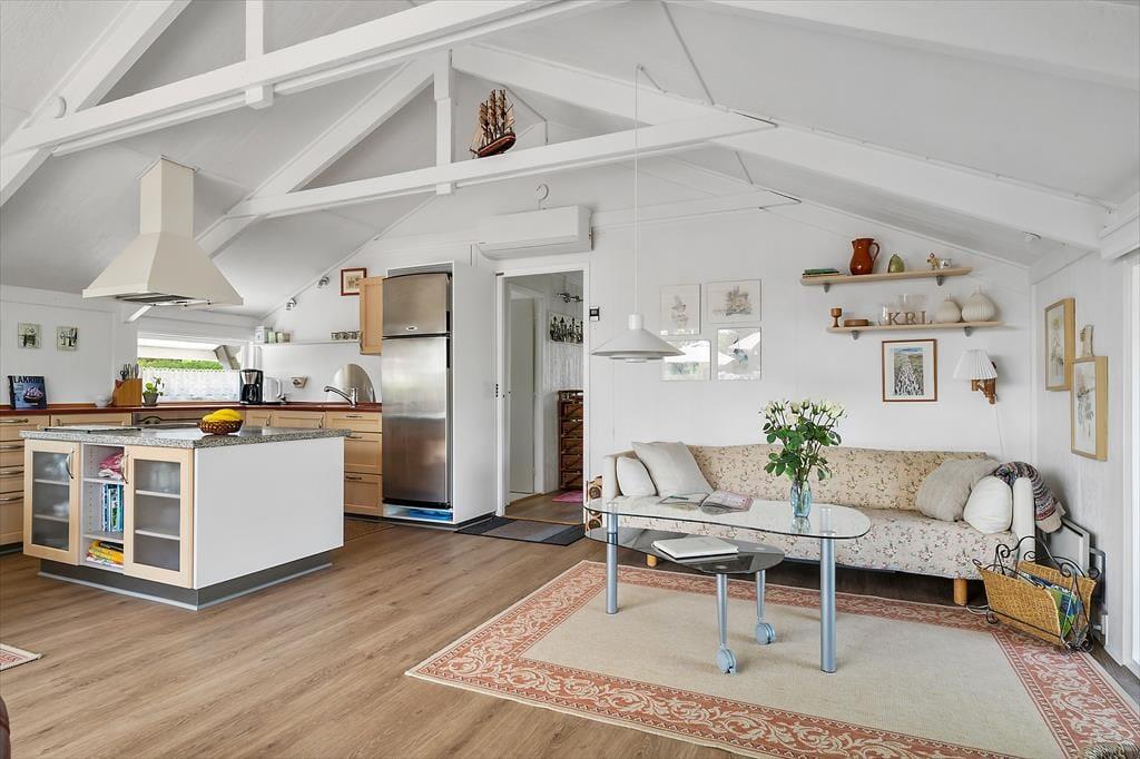 Når du træder ind i sommerhuset på Humlevænget, bliver du mødt af en lys og venlig atmosfære med loft til kip, der giver en skøn rumfornemmelse og luft omkring dig. Huset emmer af klassisk sommerhushygge og danner en indbydende ramme om feriedagene – uanset årstid. Det åbne opholdsrum samler stue, spiseplads og køkken i ét, så der er plads til fællesskab og nærvær. Her kan du nyde morgenkaffen med udsigt til haven, slappe af med en bog i sofaen eller samles til brætspil, når aftenen falder på. Store vinduespartier trækker lyset ind og binder inde- og udeliv sammen, så du altid har fornemmelsen af at være tæt på naturen.