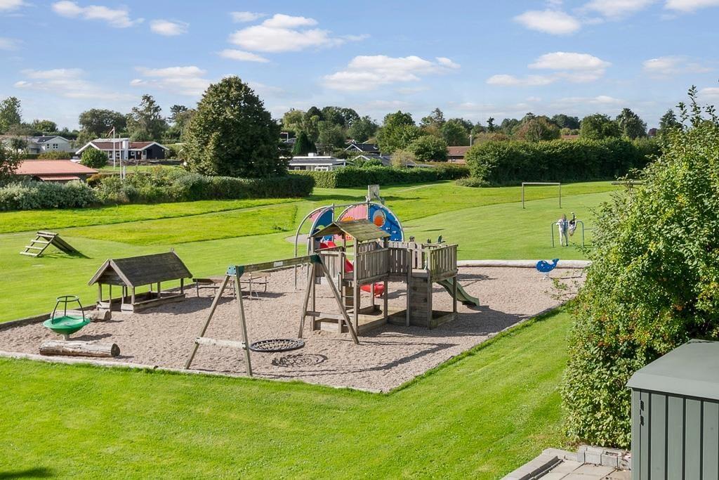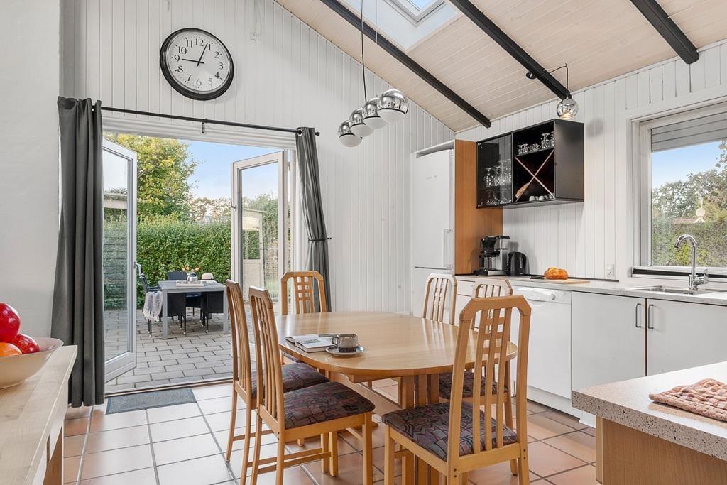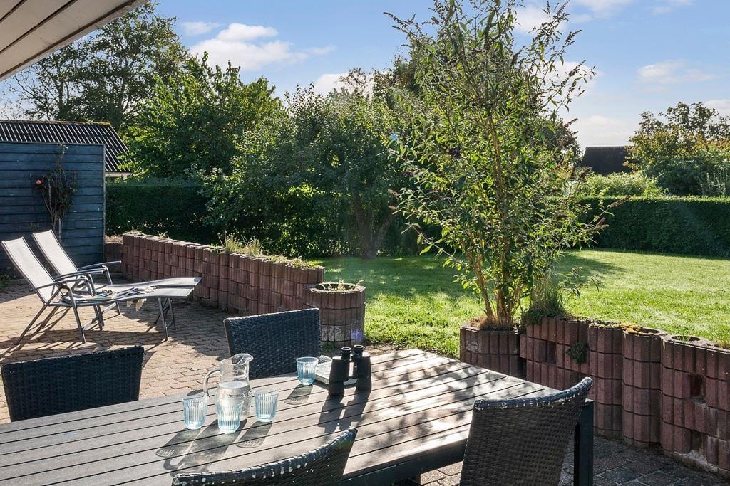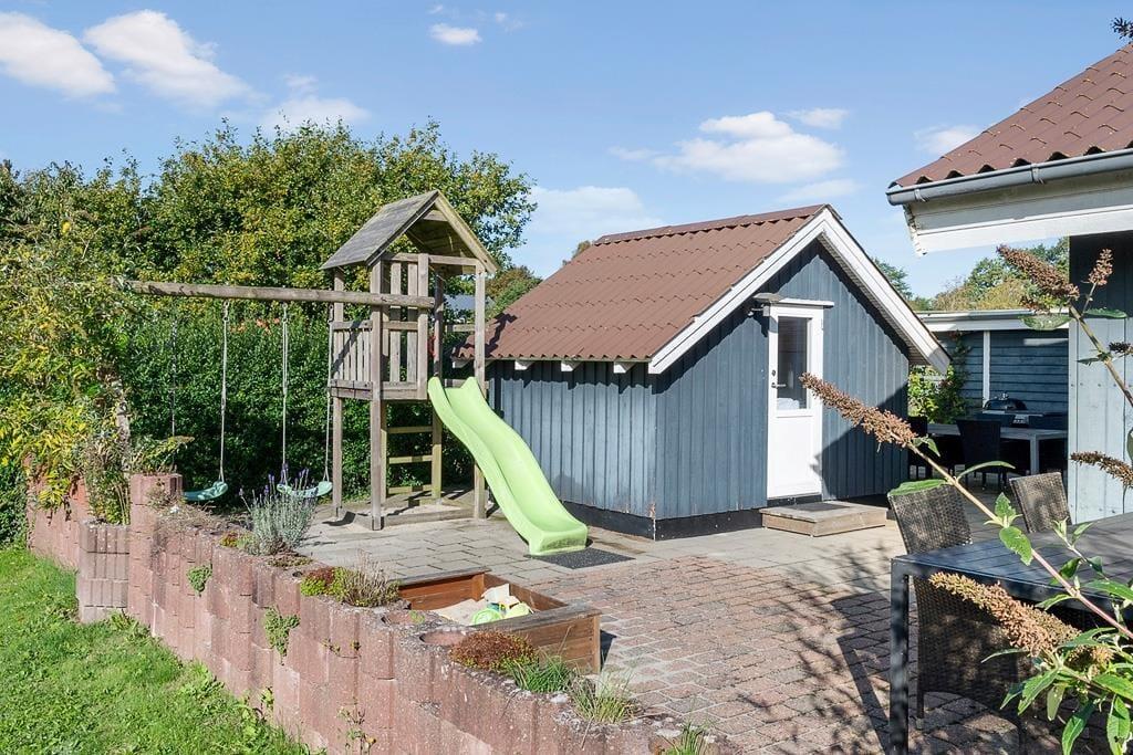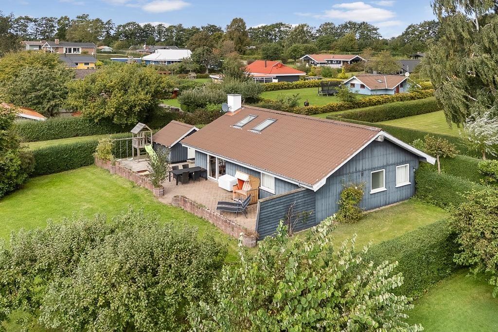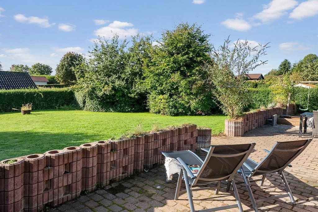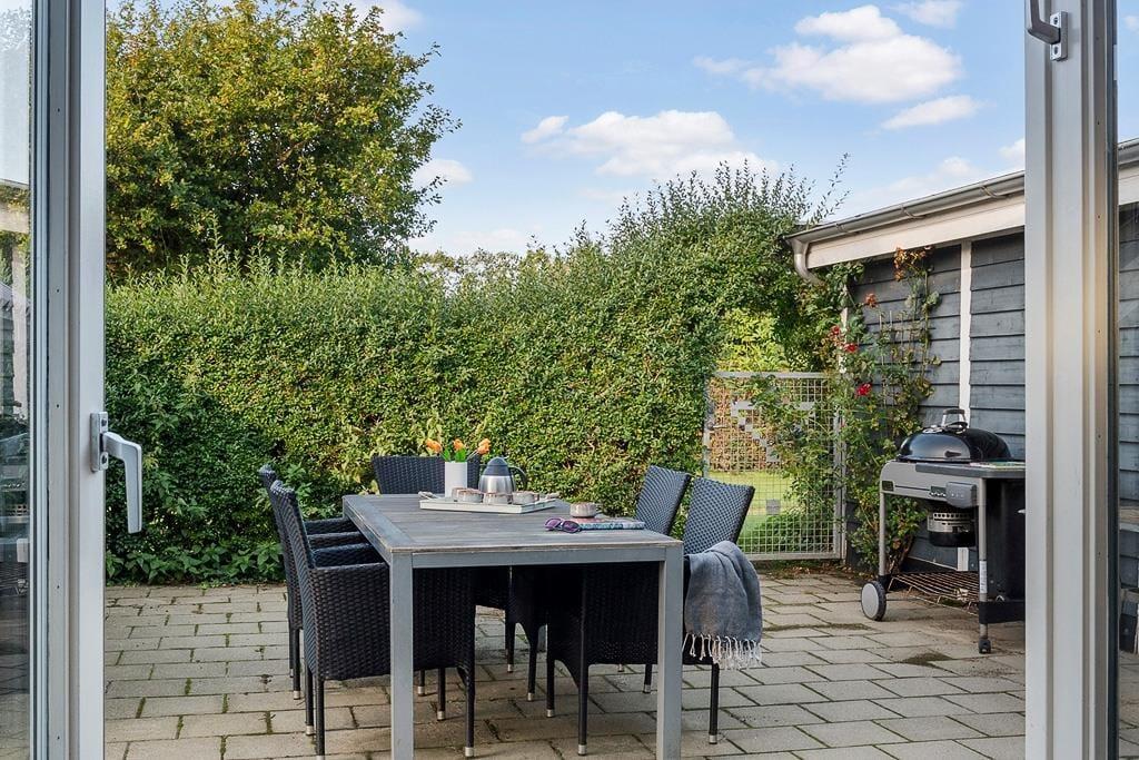 Udenfor venter en dejlig grund, hvor du kan nyde solen, mens børnene leger frit på plænen, og familiens hund løber glad rundt. Terrassen er indrettet til hyggestunder, hvad enten det er morgenkaffen i solens første stråler eller en grillaften med udsigt til den grønne have. Her kan du læne dig tilbage i havemøblerne og lade stilheden kun blive brudt af fuglesang. Haven byder på flere små kroge, hvor du kan finde læ og ro til en bog eller blot nyde nærværet. Sommerhuset er et oplagt valg for den familie, der ønsker både komfort og natur tæt på – et sted, hvor man kan trække vejret helt ned i maven og finde feriefreden.