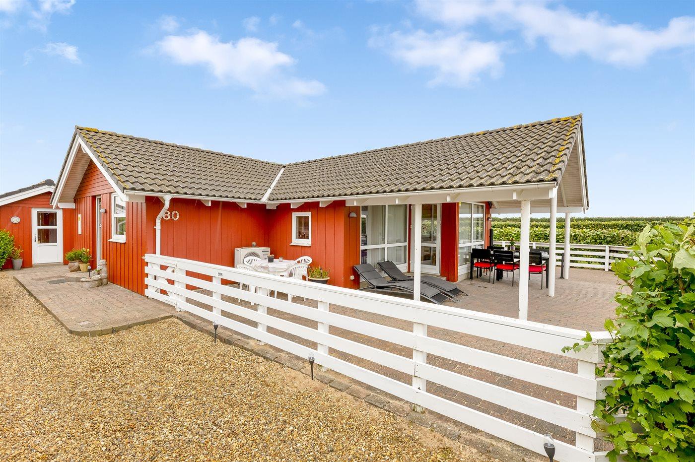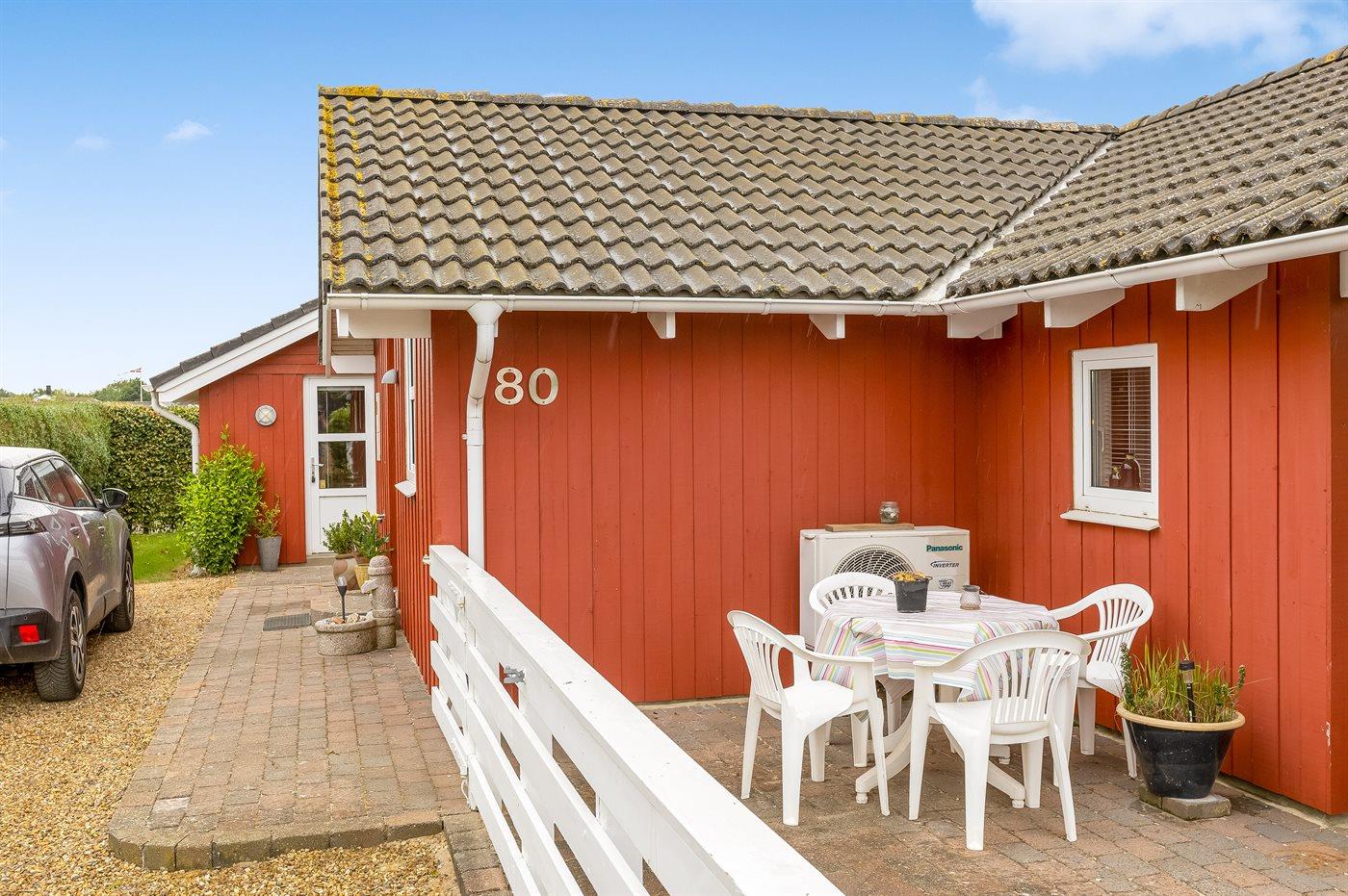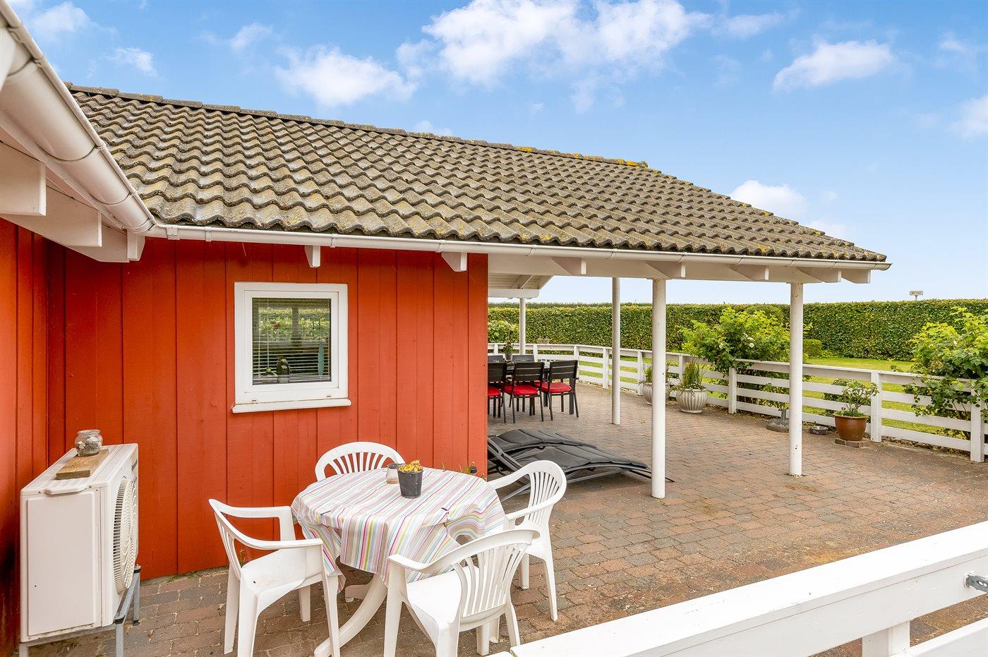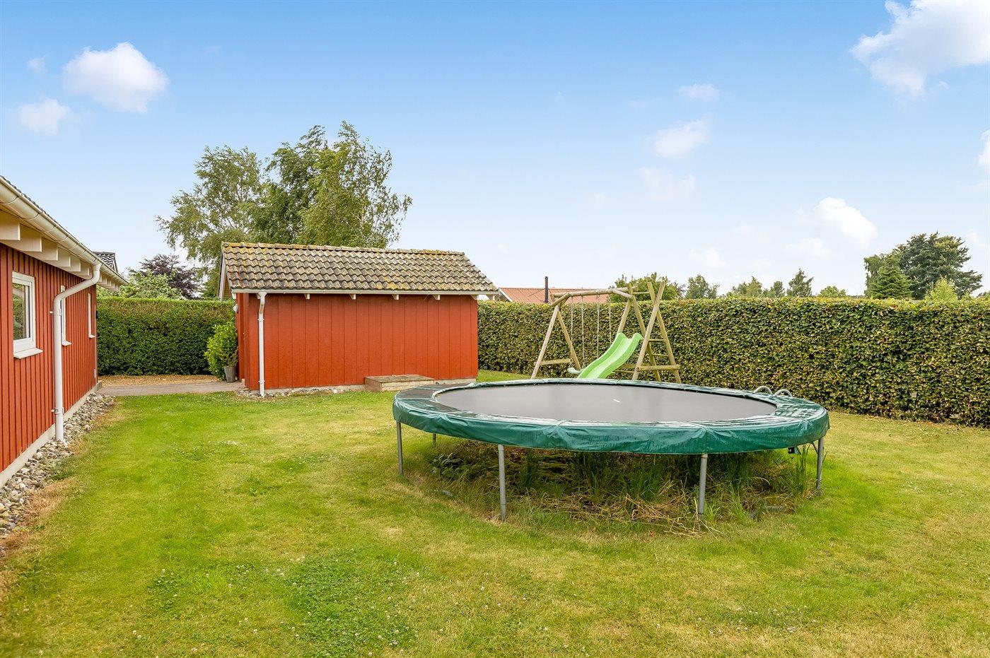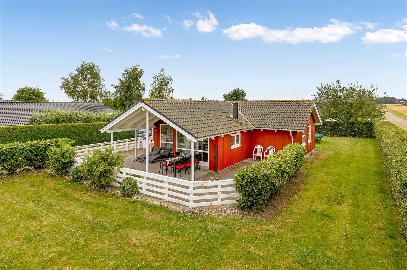 Udenfor finder I en skøn terrasse, hvor I kan nyde solen, grille eller bare sidde og lytte til naturens lyde. Rent faktisk får i også her en helt lukket og delvis overdækket terrasse. Så ved i hvor både jeres børn og måske også hund kan opholde sig. Haven byder på masser af plads til både leg og afslapning, til de små finder f.eks. trampolin, gynge stativ og sandkasse. Endvidere har husejer også sørget for at i kan benytte en trehjulet cykel og trækvogn og mange udendørs spil til børnene og området omkring sommerhuset indbyder til skønne gåture, cykelture og oplevelser i naturen. Den nærliggende strand giver mulighed for en forfriskende dukkert eller en smuk aftentur langs vandet.