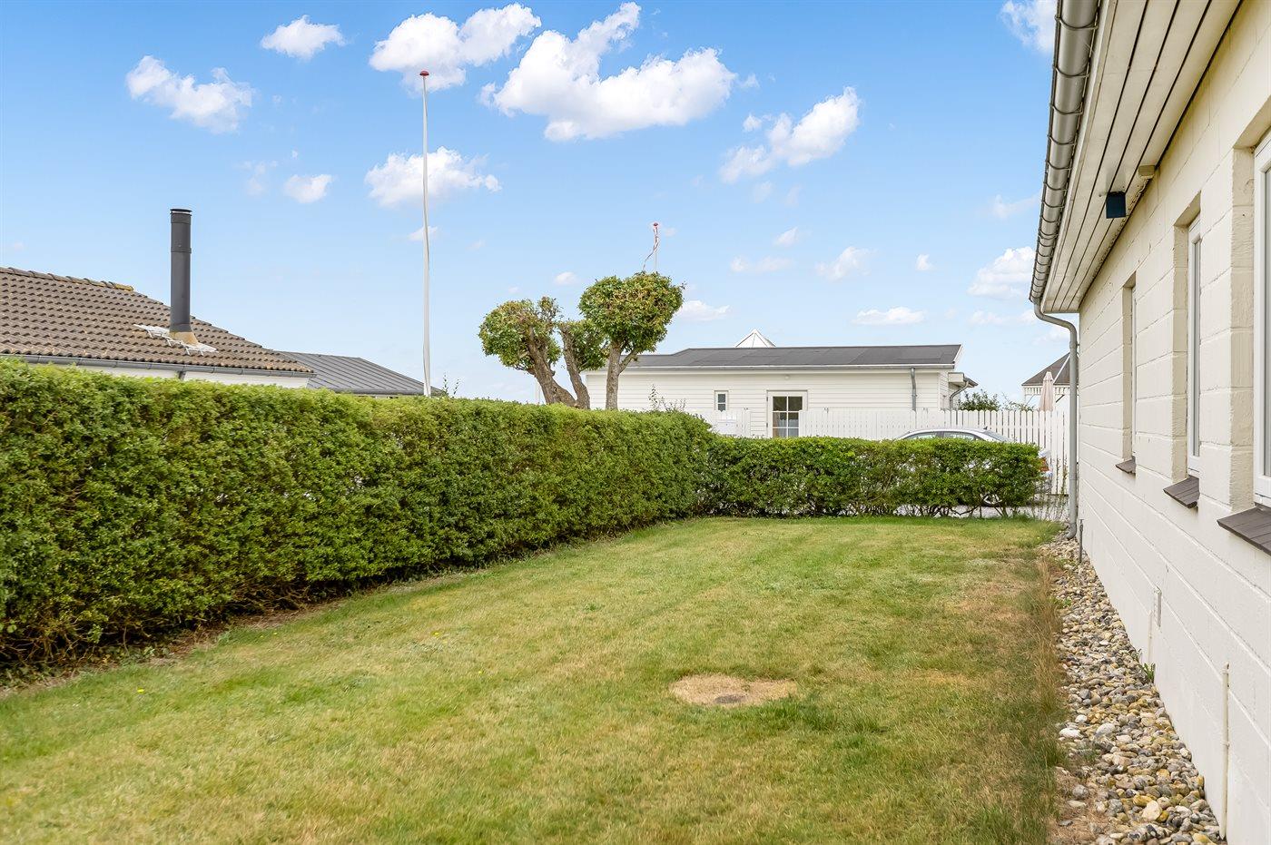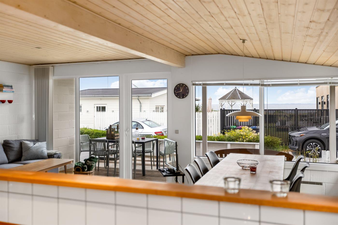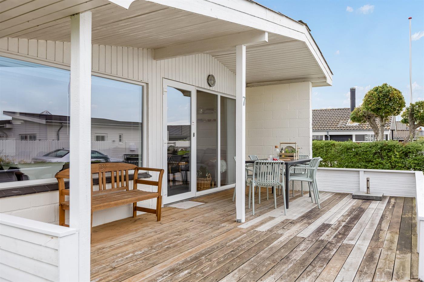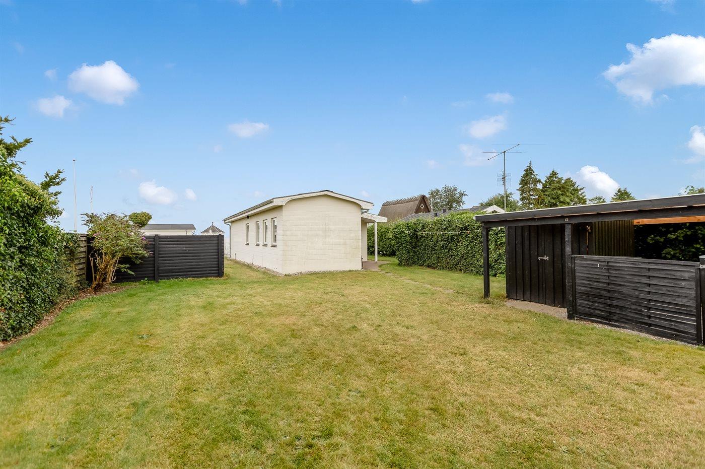 Udenfor har I en dejlig terrasse, hvor udsigten til vandet kan nydes, hvor en del er overdækket, så I kan nyde udelivet uanset vejret. Terrassen har direkte udgang fra køkkenalrummet. Bag huset breder en stor græsplæne sig, hvor der er rig mulighed for leg og aktiviteter som fodbold og andre udendørsspil. Haven er lukket, så I vil opleve, at det også er et dejligt sted at opholde sig. Ved haven finder I også husets carport til 1 bil. Benytter I flere biler skal disse parkeres på de offentlige parkeringspladser.