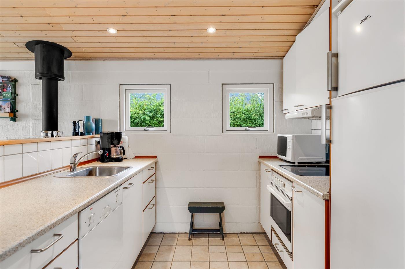 Køkkenet er udstyret med 1 køleskab. Der er 4 keramiske kogeplader, varmluftovn, mikrobølgeovn samt opvaskemaskine.