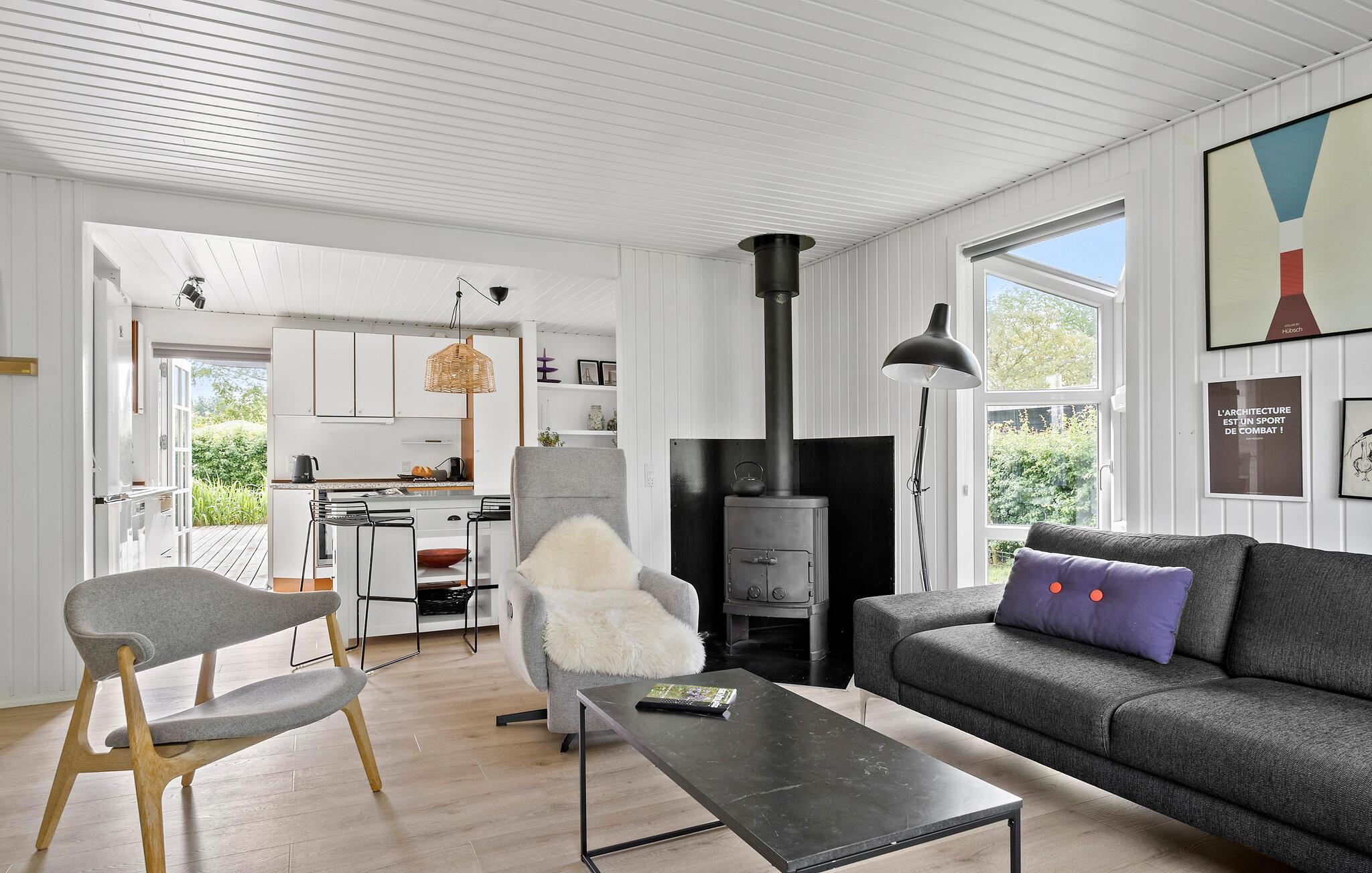 Tag familien under armen og rejs til Hejsager, hvor I får en herlig feriebase i dette attraktive hus. Indretningen fremtræder lyst og luftigt med dobbeltdøre, gulv-til-loft-vinduer og en brændeovn, der på de køligere dage skaber en særligt rar atmosfære, når I finder jer godt til rette på sofaen med en god film eller hver jeres bog.